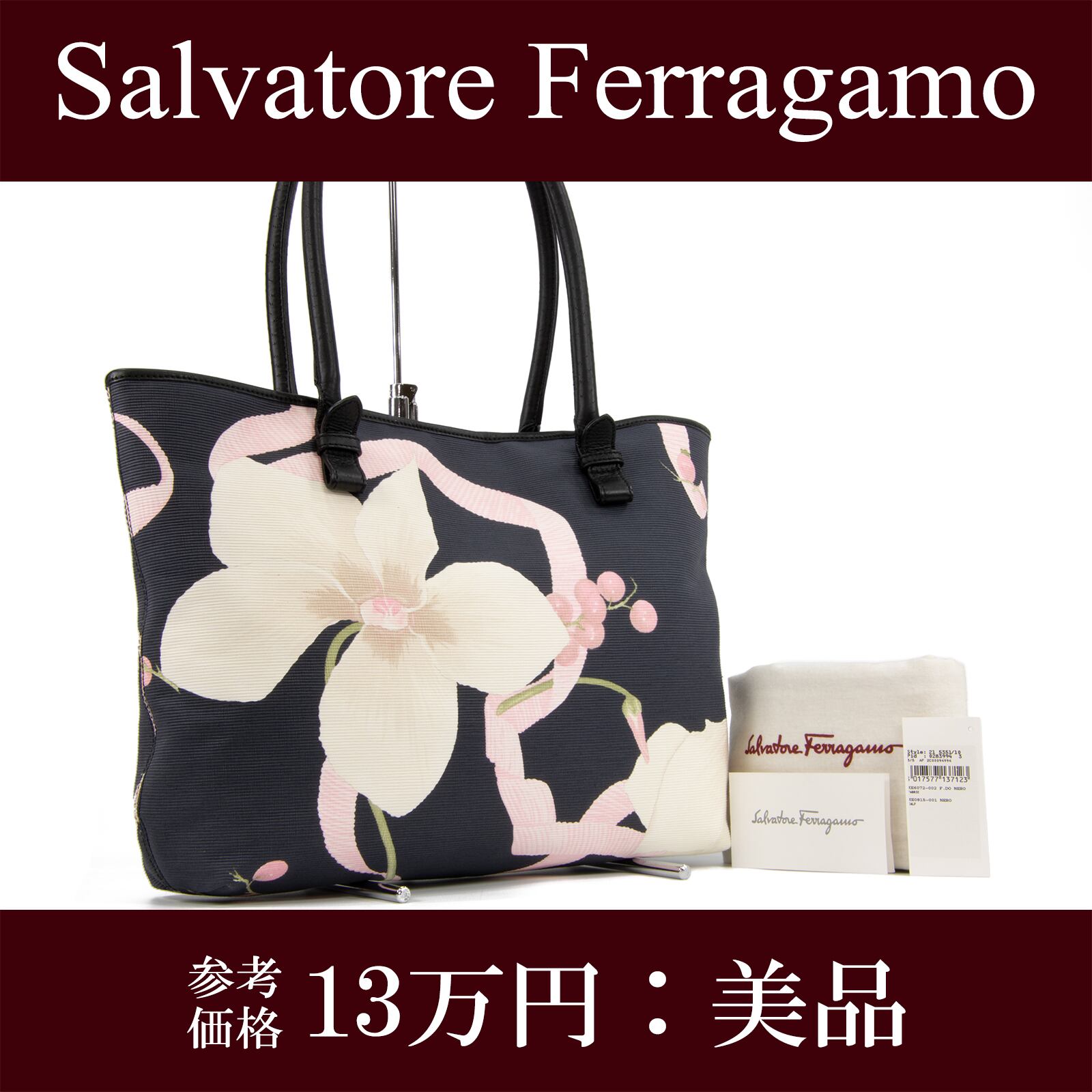 【本物・送料無料・美品】フェラガモ・トートバッグ(綺麗・A4・レア・珍しい・花・フラワー・鞄・ショルダーバック・F166)