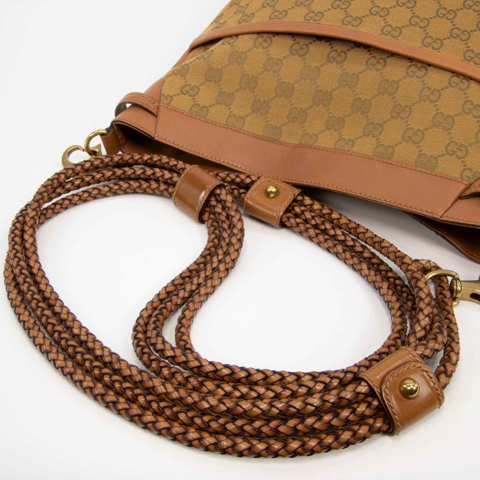 GGの独特なモノグラム総柄が特徴の、グッチの代表的なライン・GGキャンバス。その中でも希少な配色の素材をあしらい、滅多にお目にかかれない編み込みレザーのショルダーストラップが相まって、一目でグッチとわかる存在感がございます。