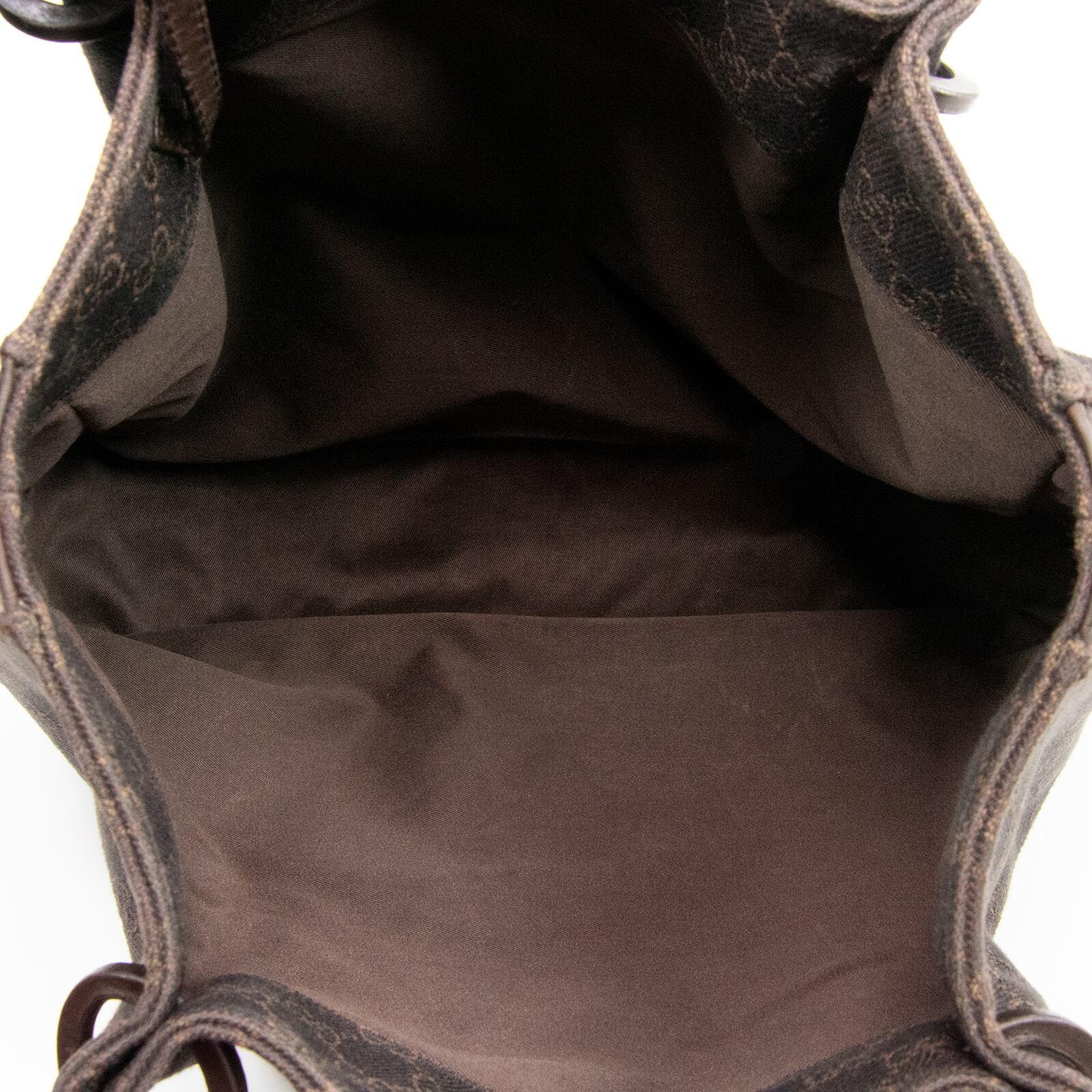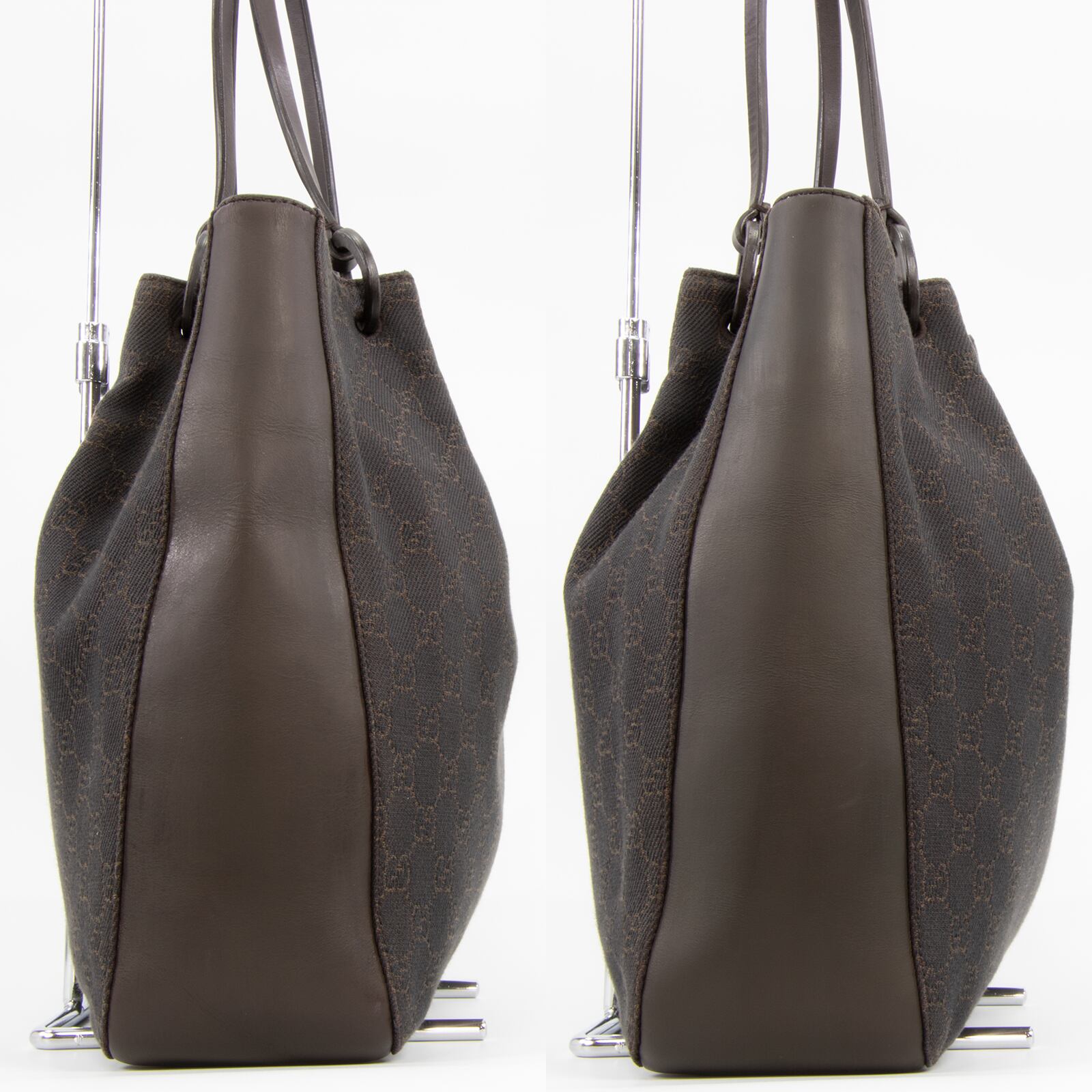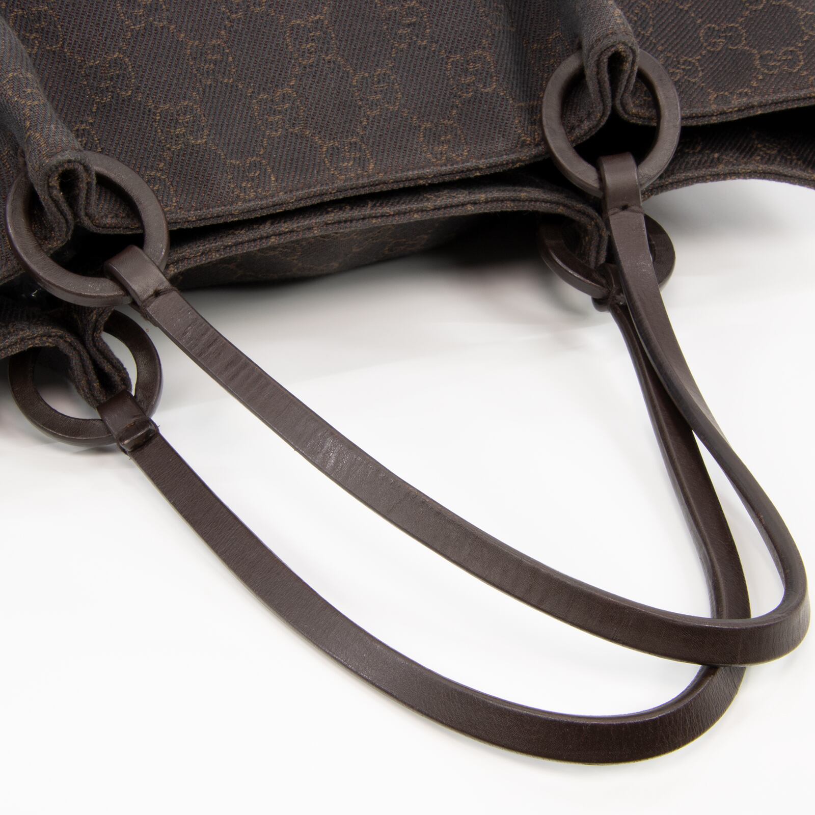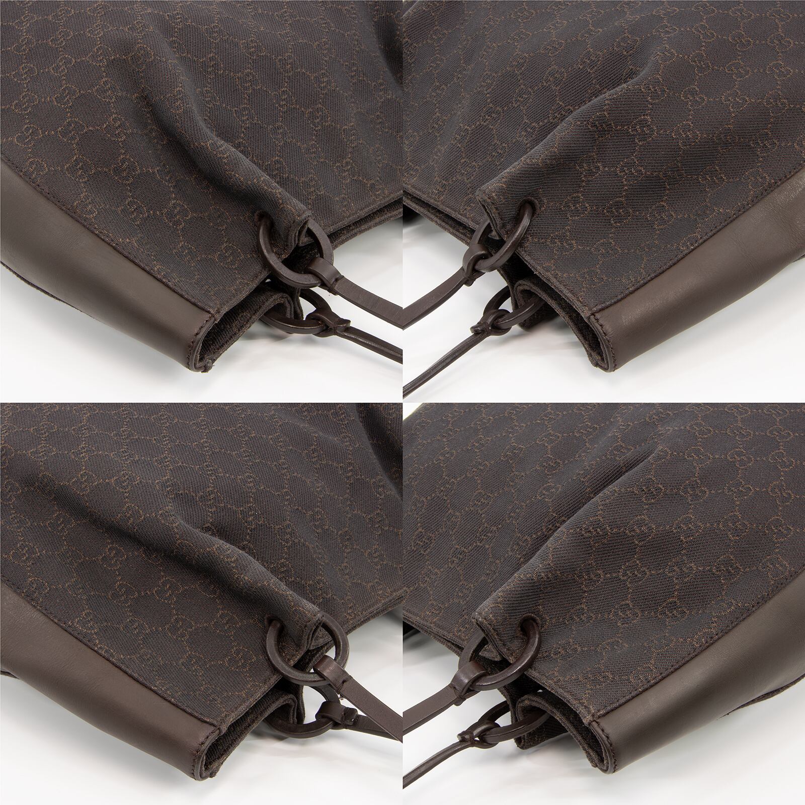 GGの独特なモノグラム総柄が特徴の、グッチの代表的なライン・GGキャンバス。ポーチ付きの大変珍しいトートバッグで、落ち着いた配色でありながら、ストラップのロゴとキャンバスのGG総柄が相まって、一目でグッチとわかる存在感がございます。