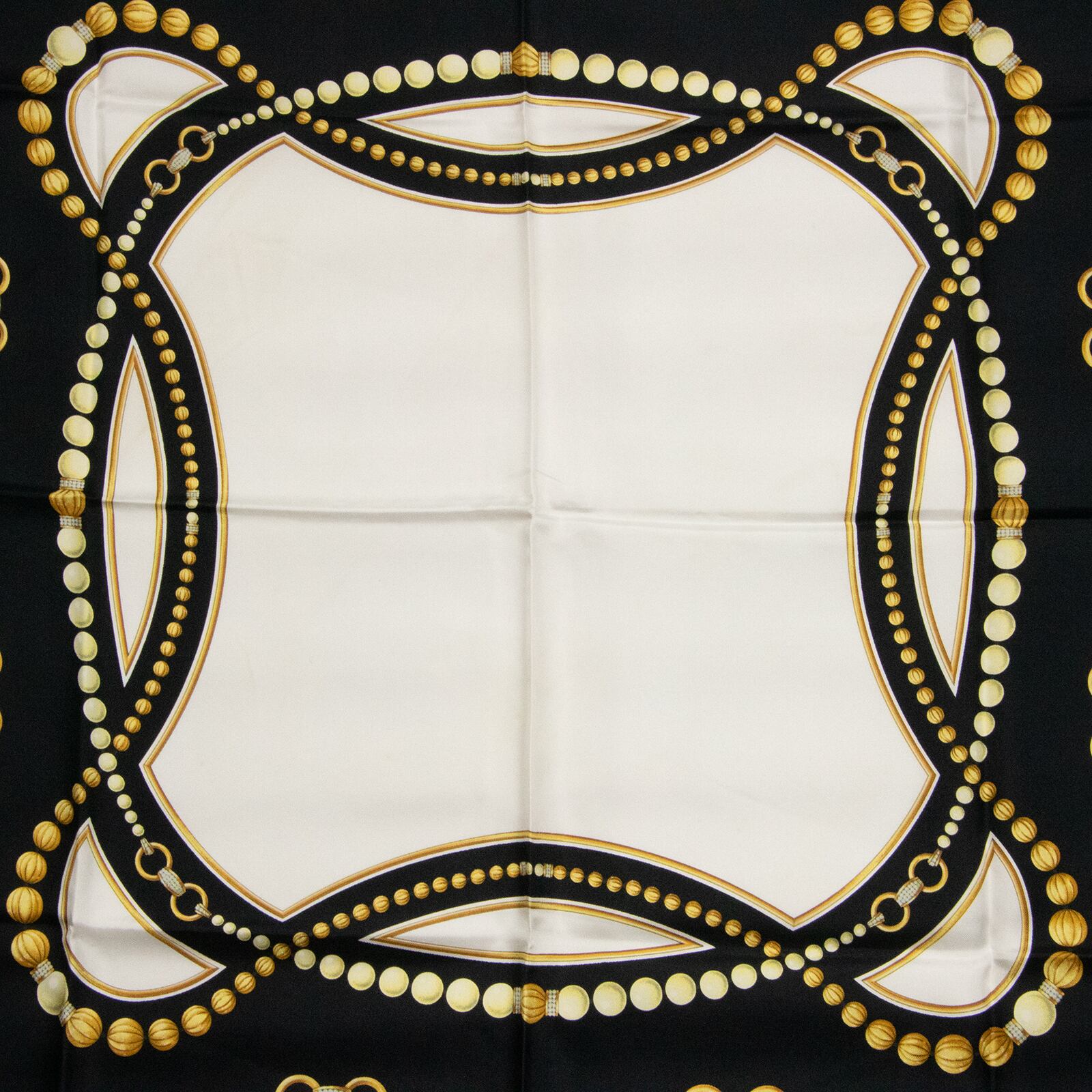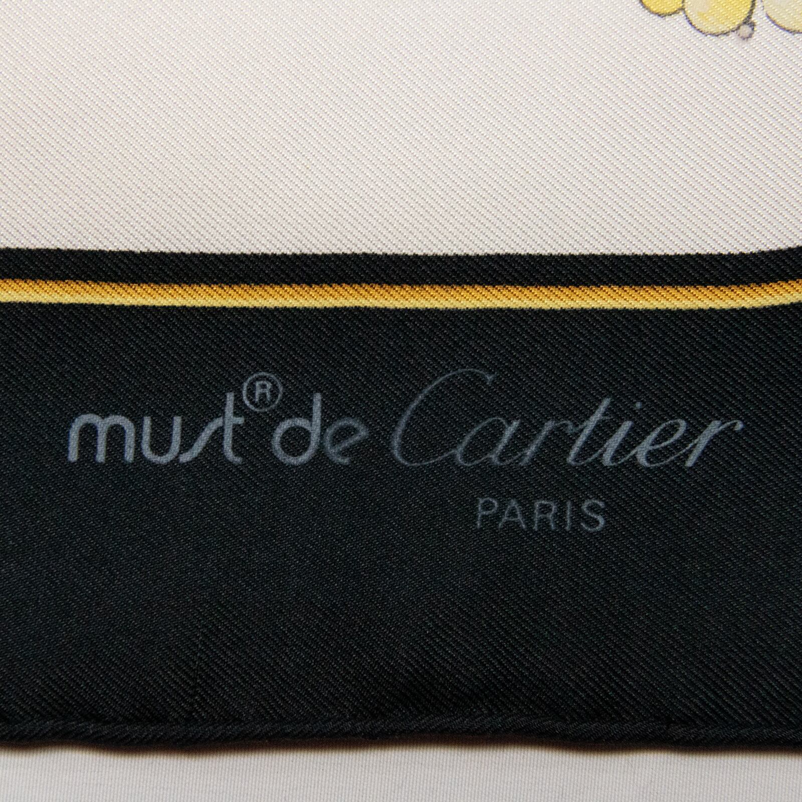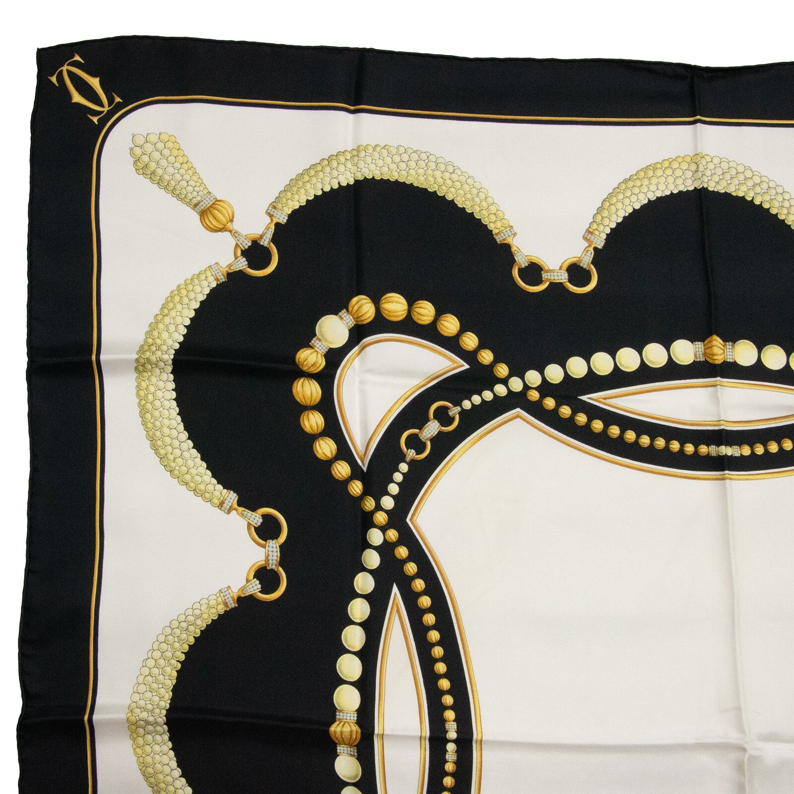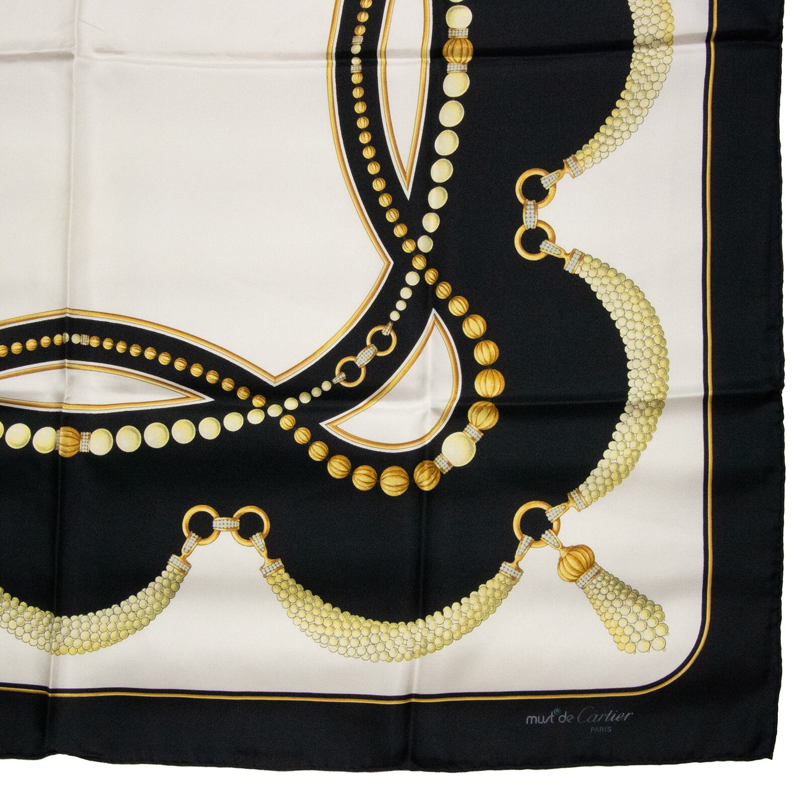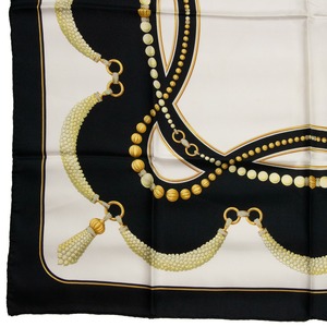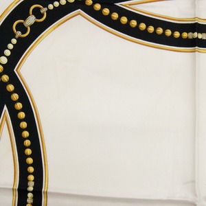 【本物・送料無料・美品】カルティエ・大判スカーフ(マスト ドゥ カルティエ・人気・綺麗・ホワイト・ブラック・シルク・X035)