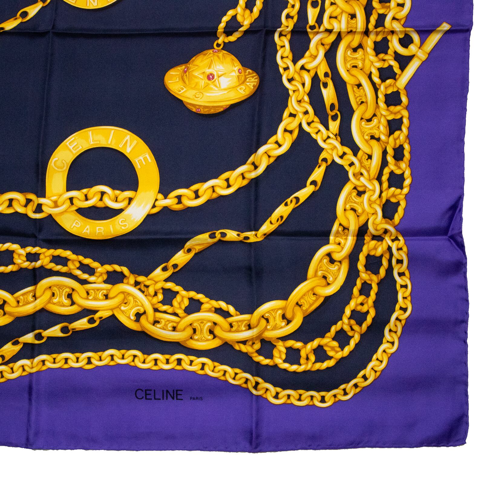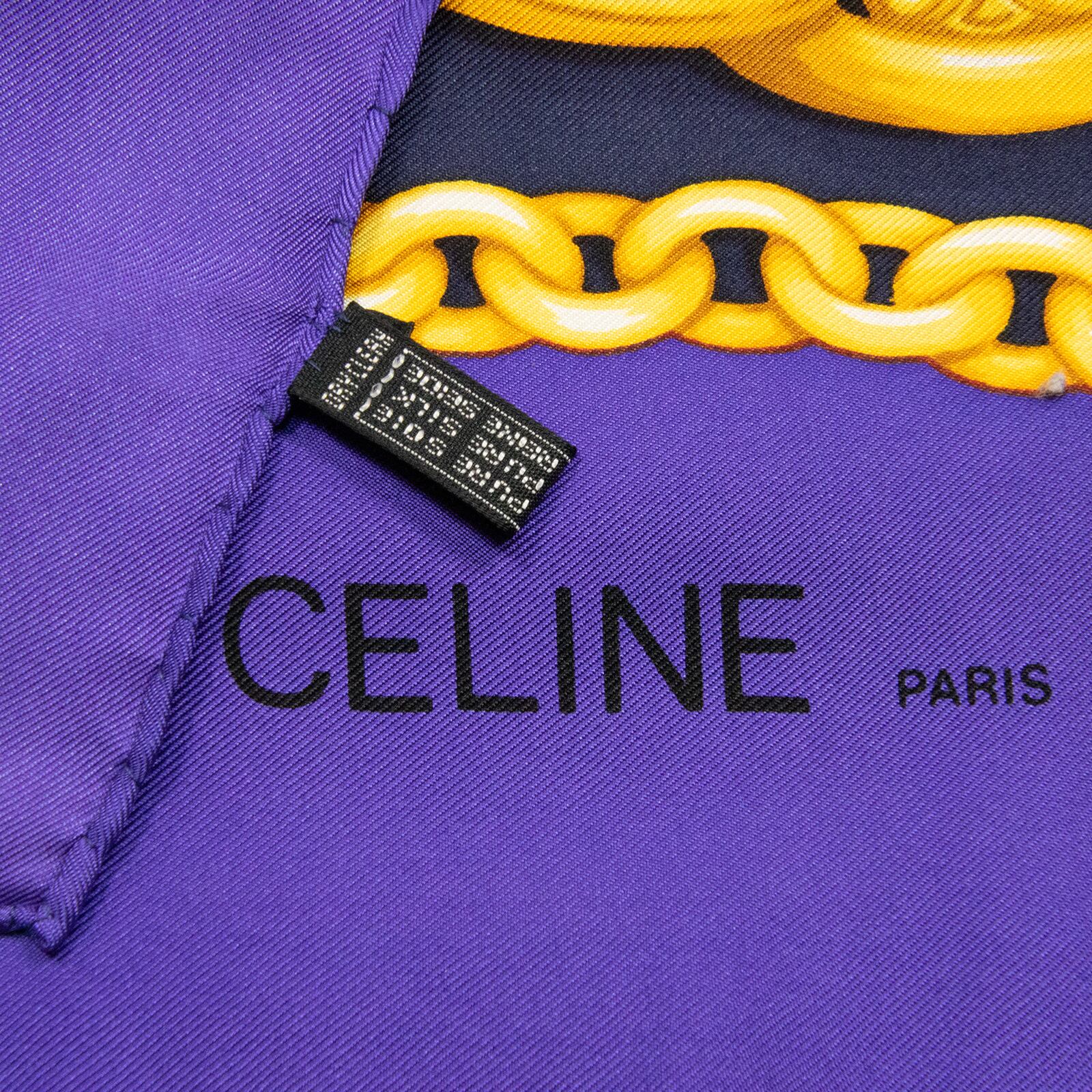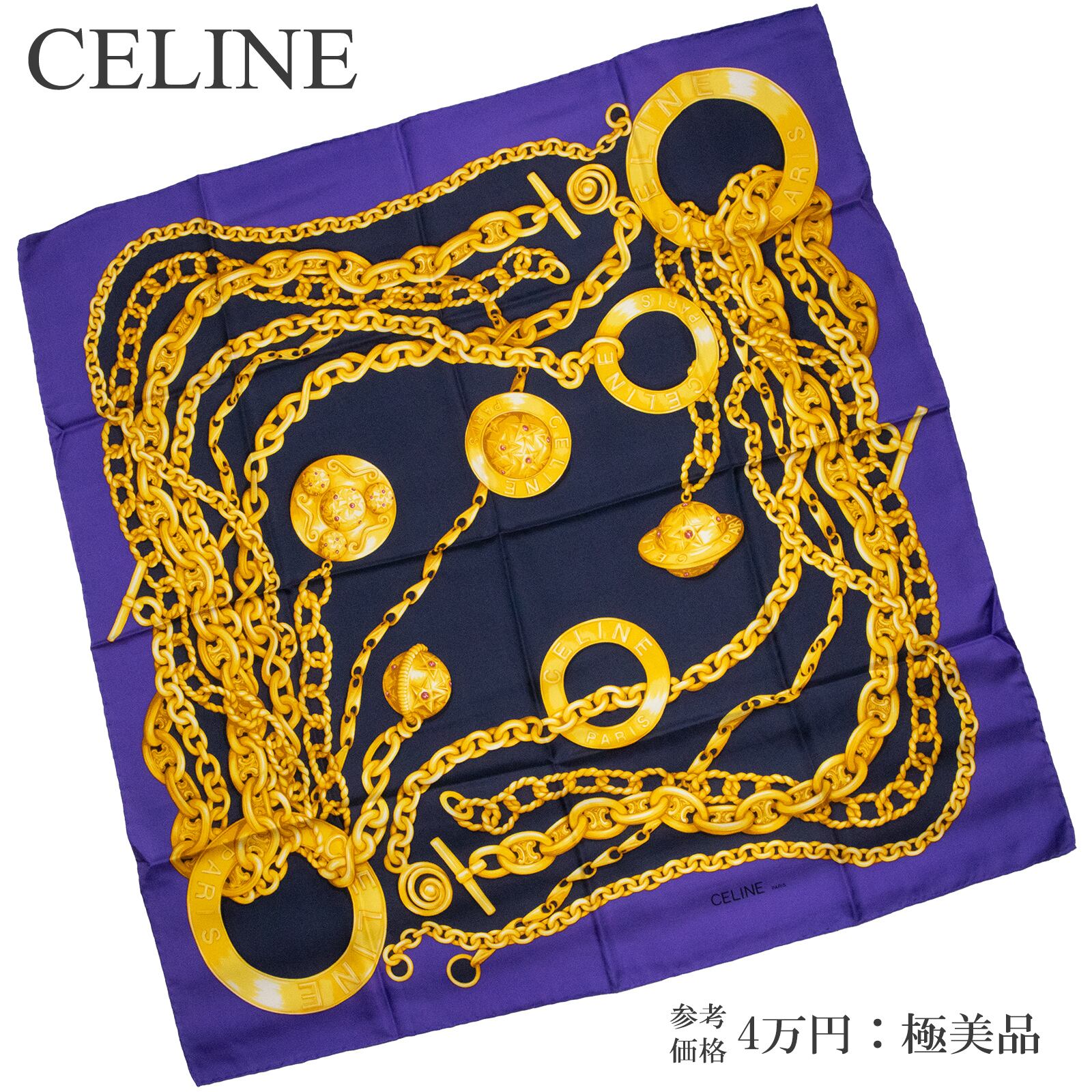 【本物・送料無料・極美品】セリーヌ・大判スカーフ(綺麗・レア・マカダム柄・スターボール・サークルロゴ・地球儀・紫色・X036)