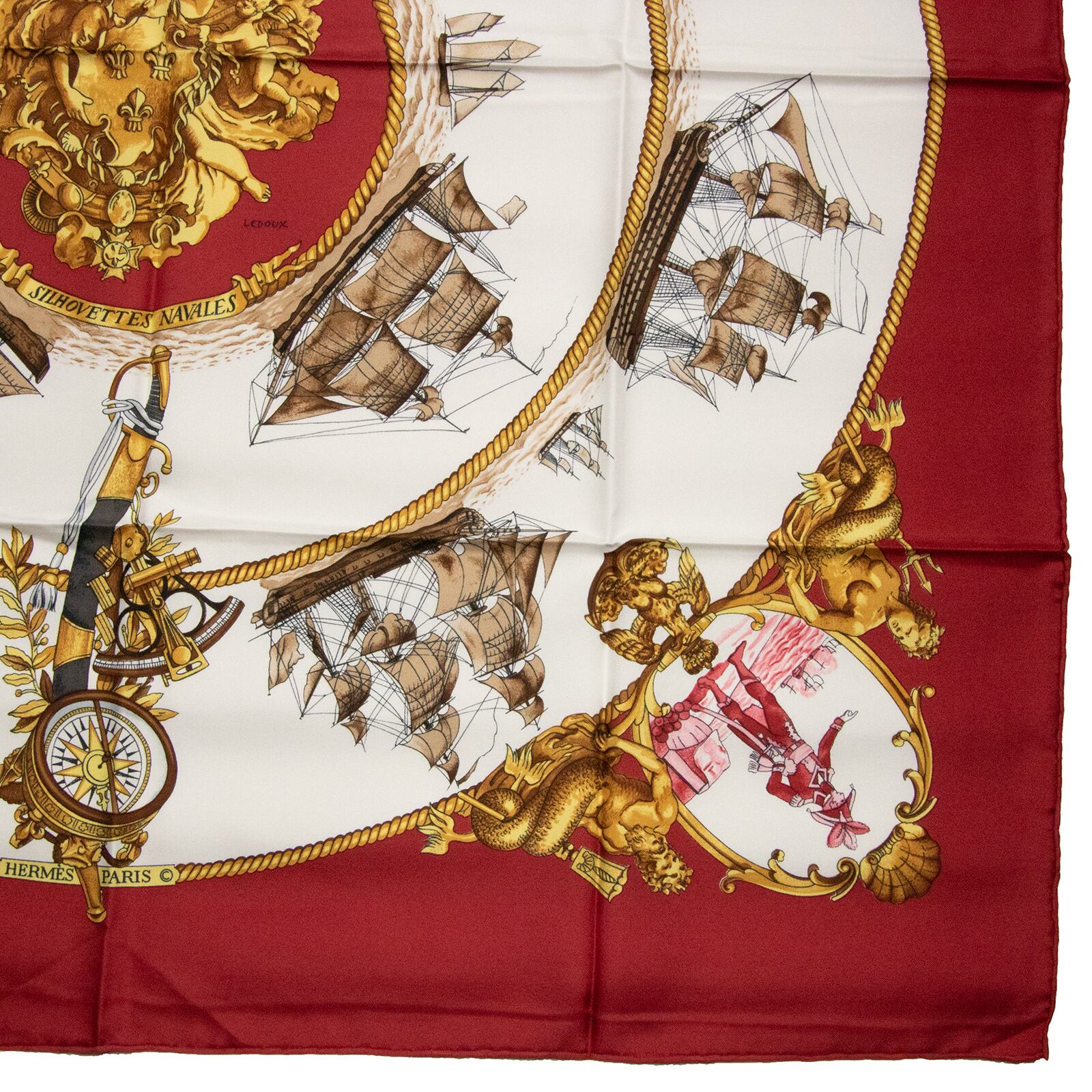 【本物・送料無料・極美品】エルメス・大判スカーフ(カレ90・SILHOVETTES NAVALES・綺麗・レッド・船・ポセイドン・シルク・X040)
