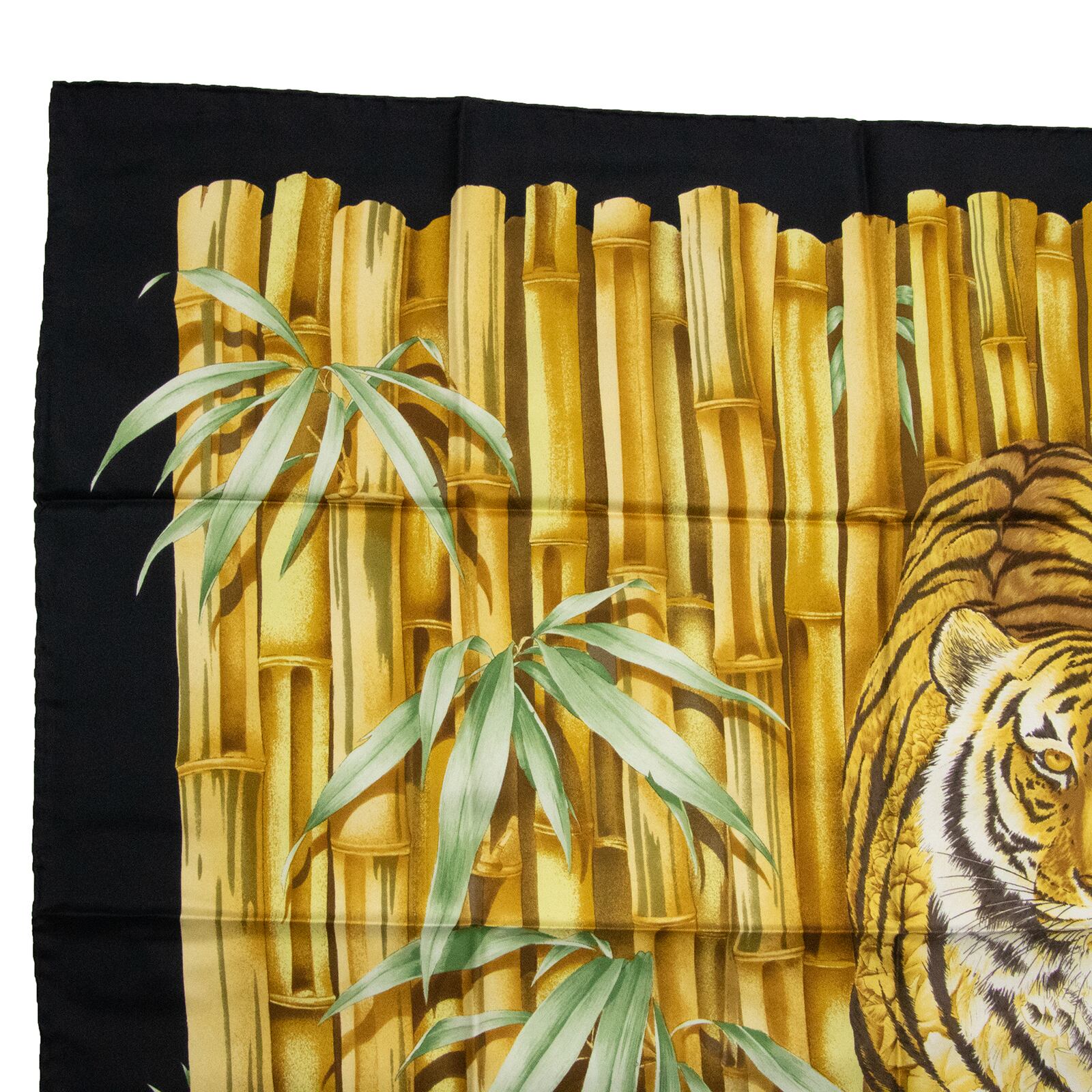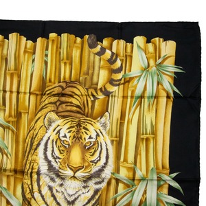 黄金色の竹林から歩み寄るゴールデンタイガーが、まるでそこに生きているかのように繊細に描かれており、ブラックカラーの縁が相まって、映画のワンシーンのようなフェラガモならではの世界観・圧倒的存在感・ただならぬ雰囲気にうっとりさせられます。