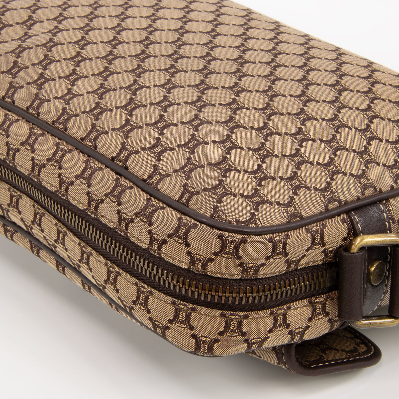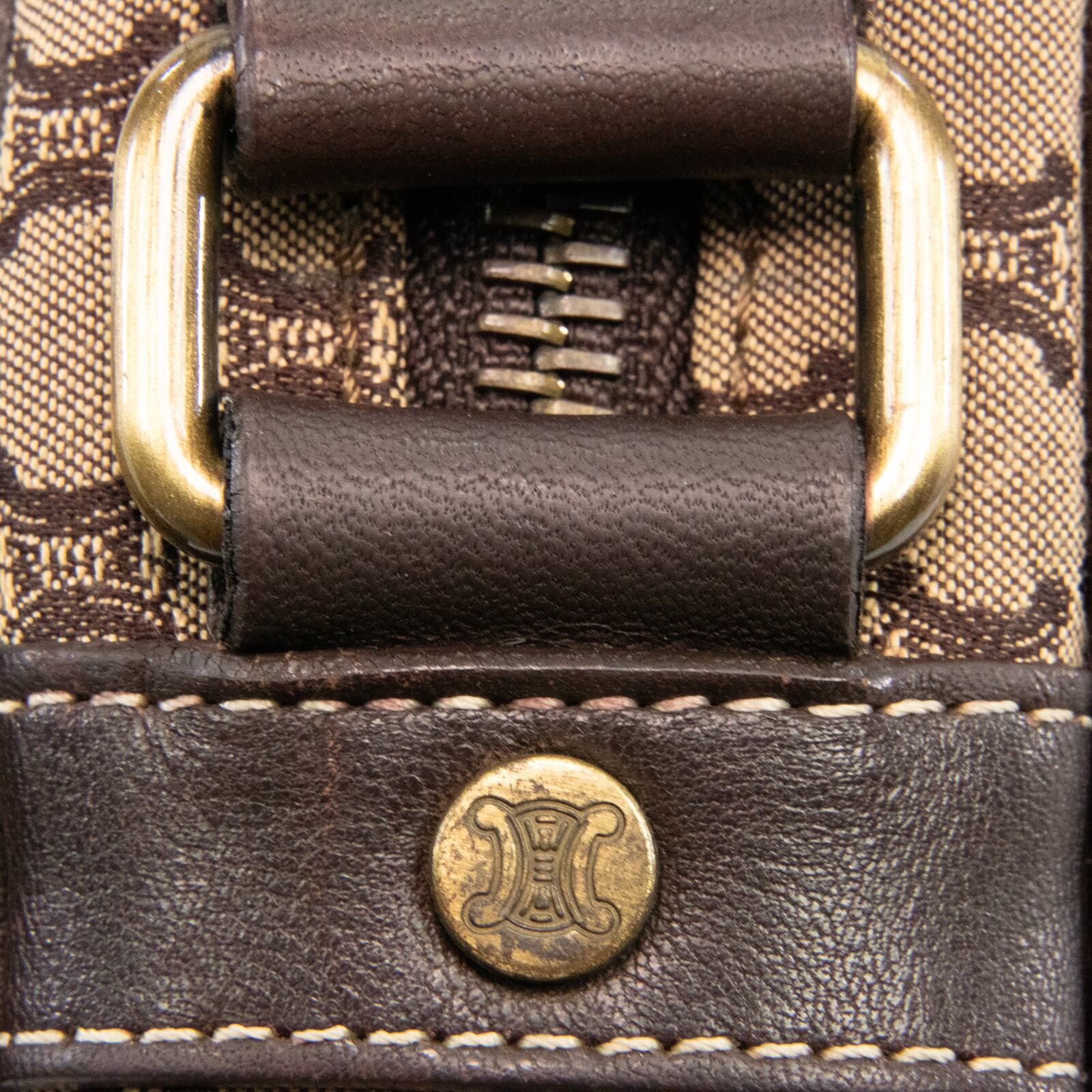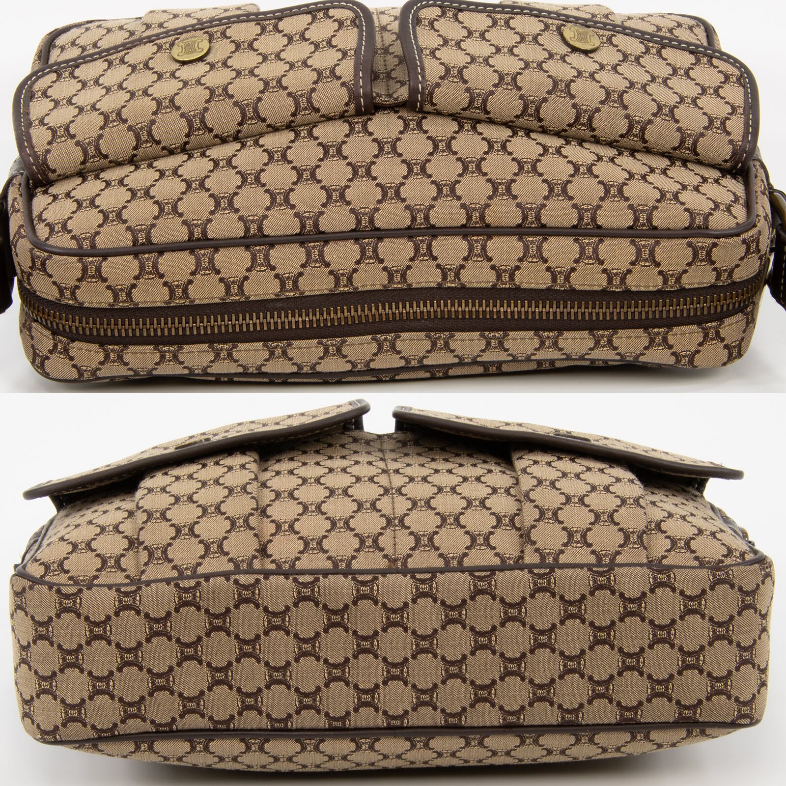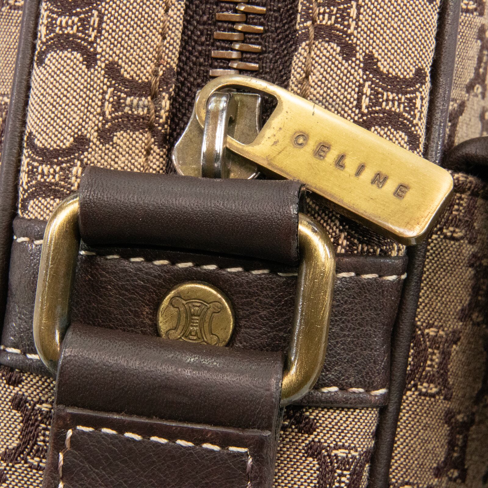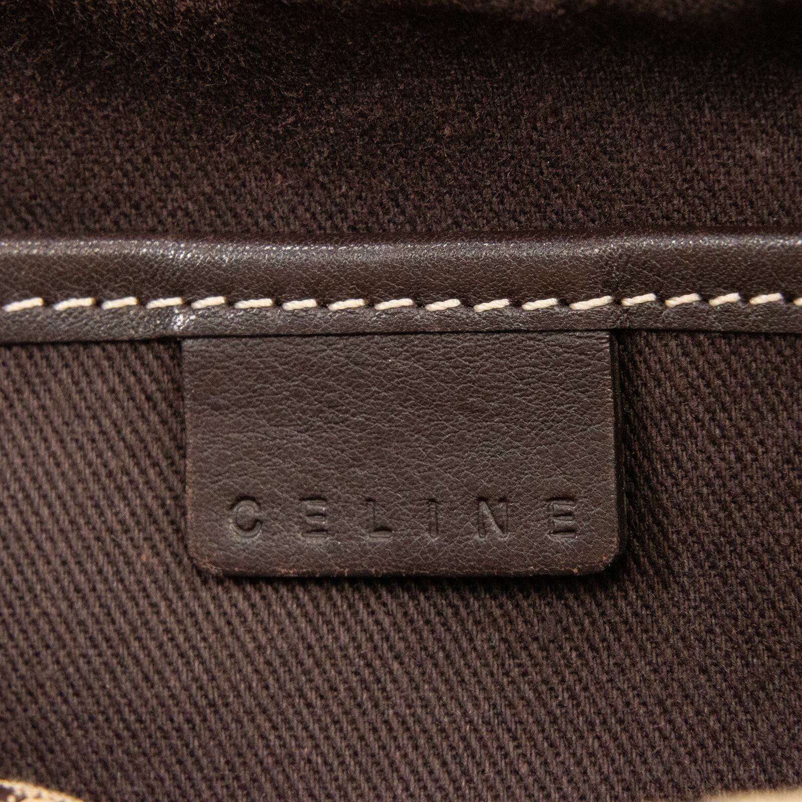 セリーヌのロゴをモノグラムのようにあしらったマカダム総柄が特徴で、一目でセリーヌとわかる存在感がありながら、落ち着いた配色のキャンバスと高級皮革が相まって、エレガントで落ち着いた大人の魅力が感じられる逸品でございます。