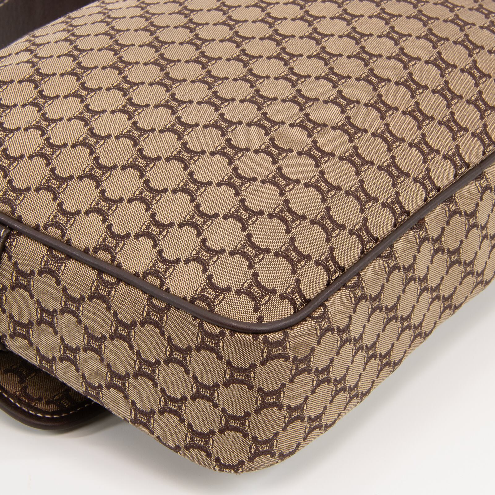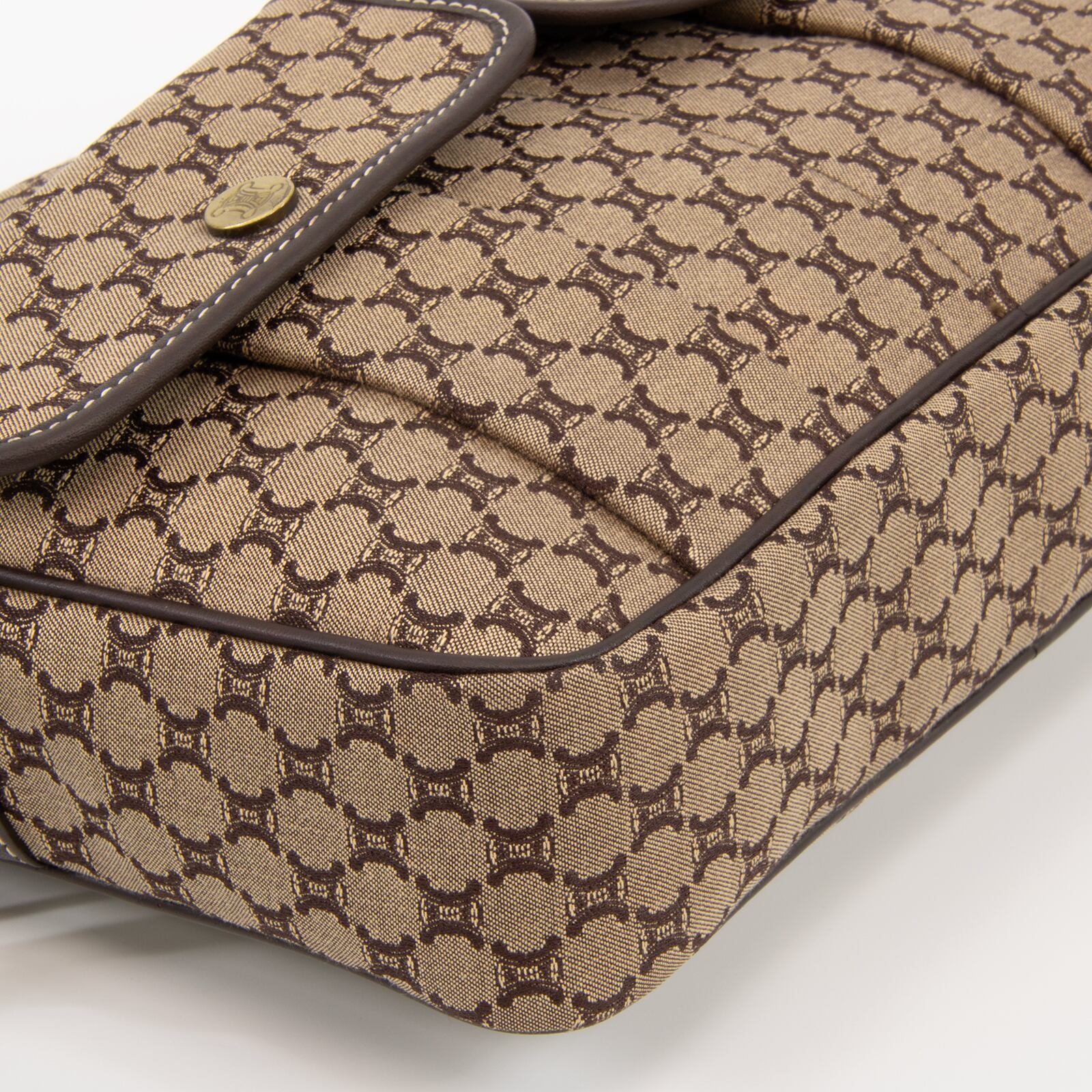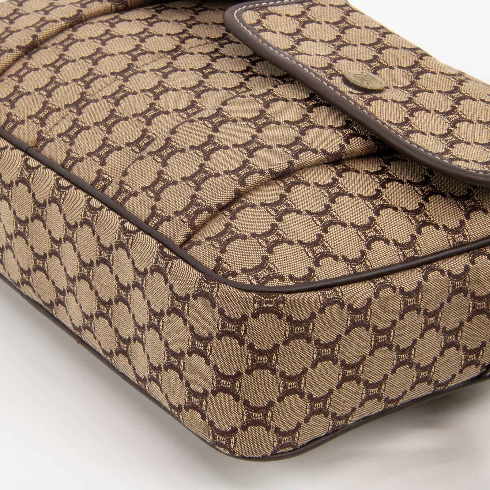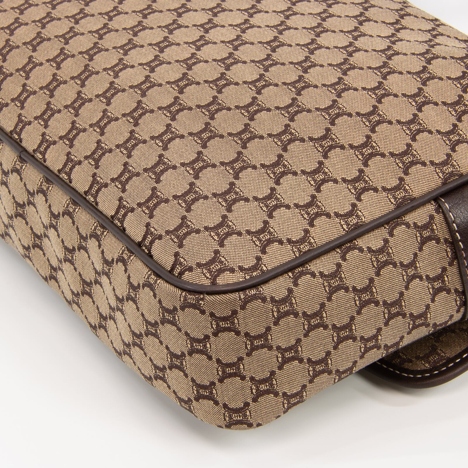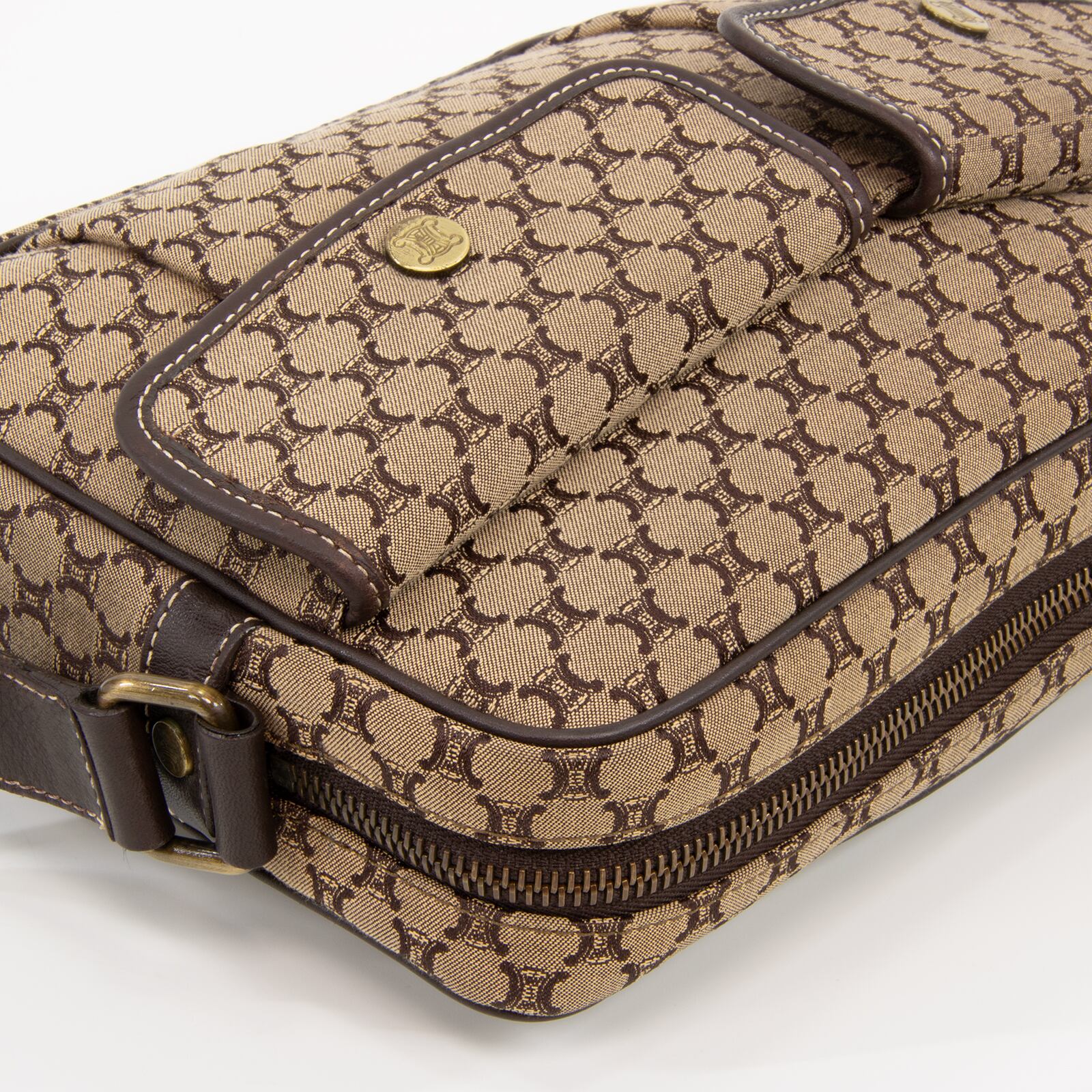 セリーヌのロゴをモノグラムのようにあしらったマカダム総柄が特徴で、一目でセリーヌとわかる存在感がありながら、落ち着いた配色のキャンバスと高級皮革が相まって、エレガントで落ち着いた大人の魅力が感じられる逸品でございます。