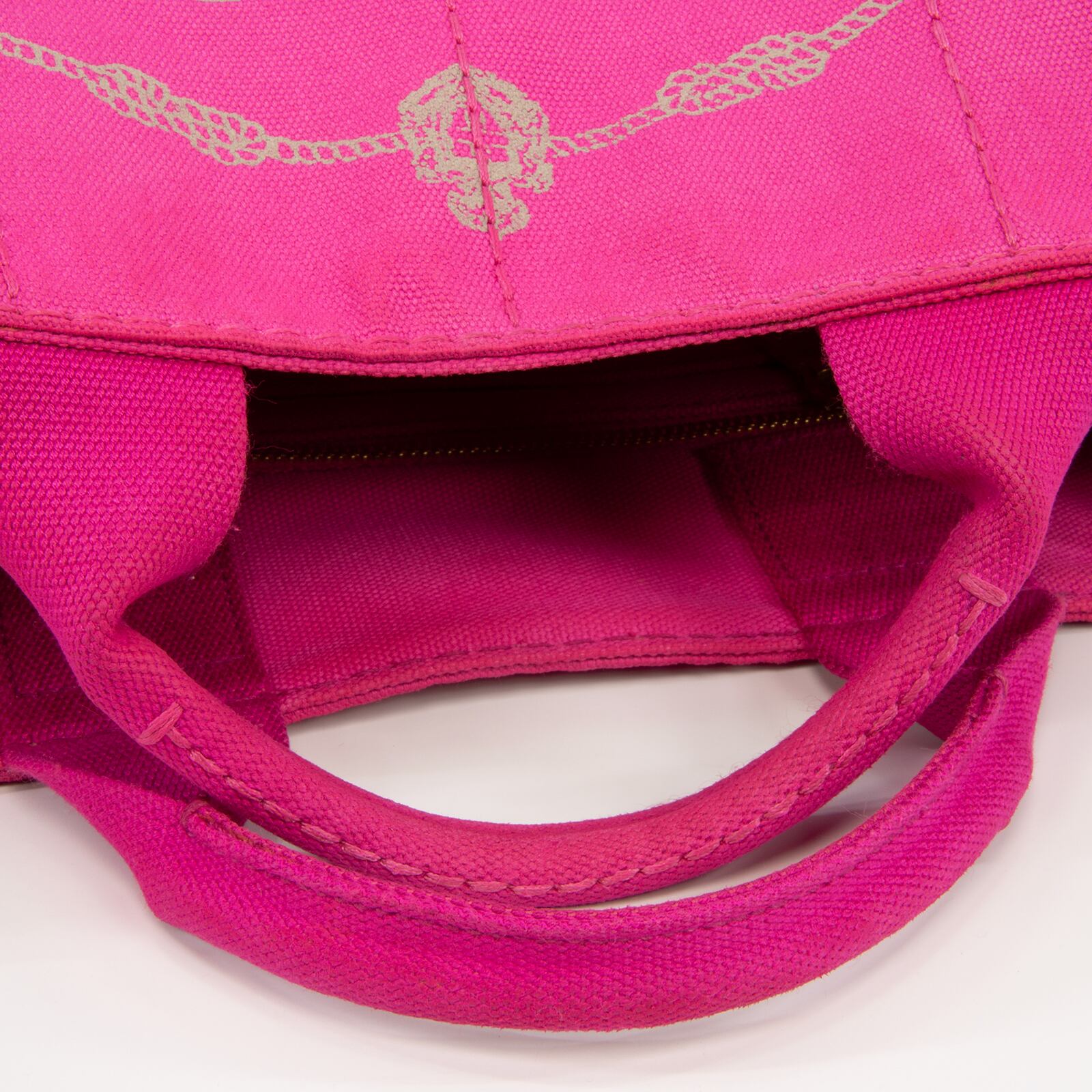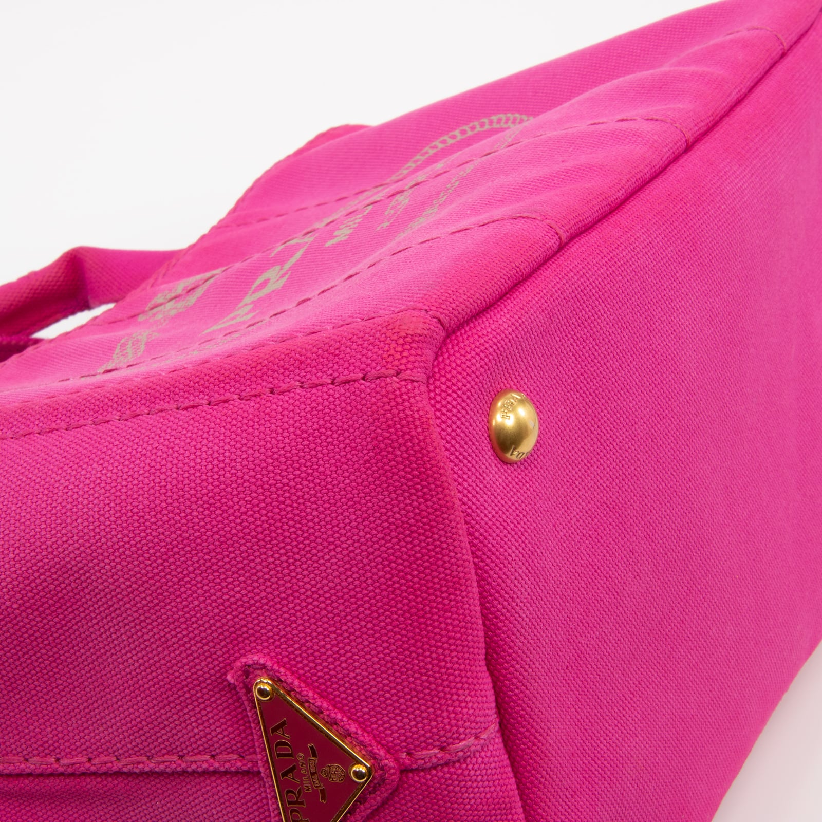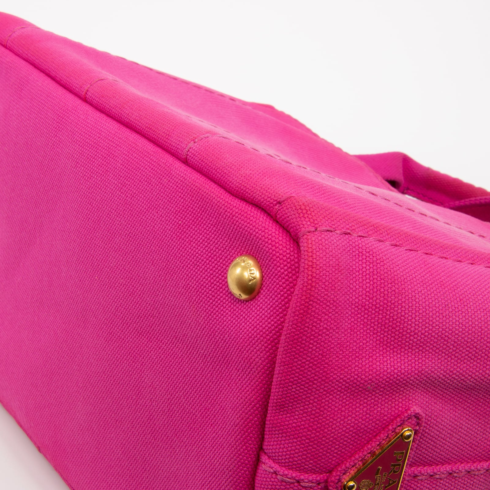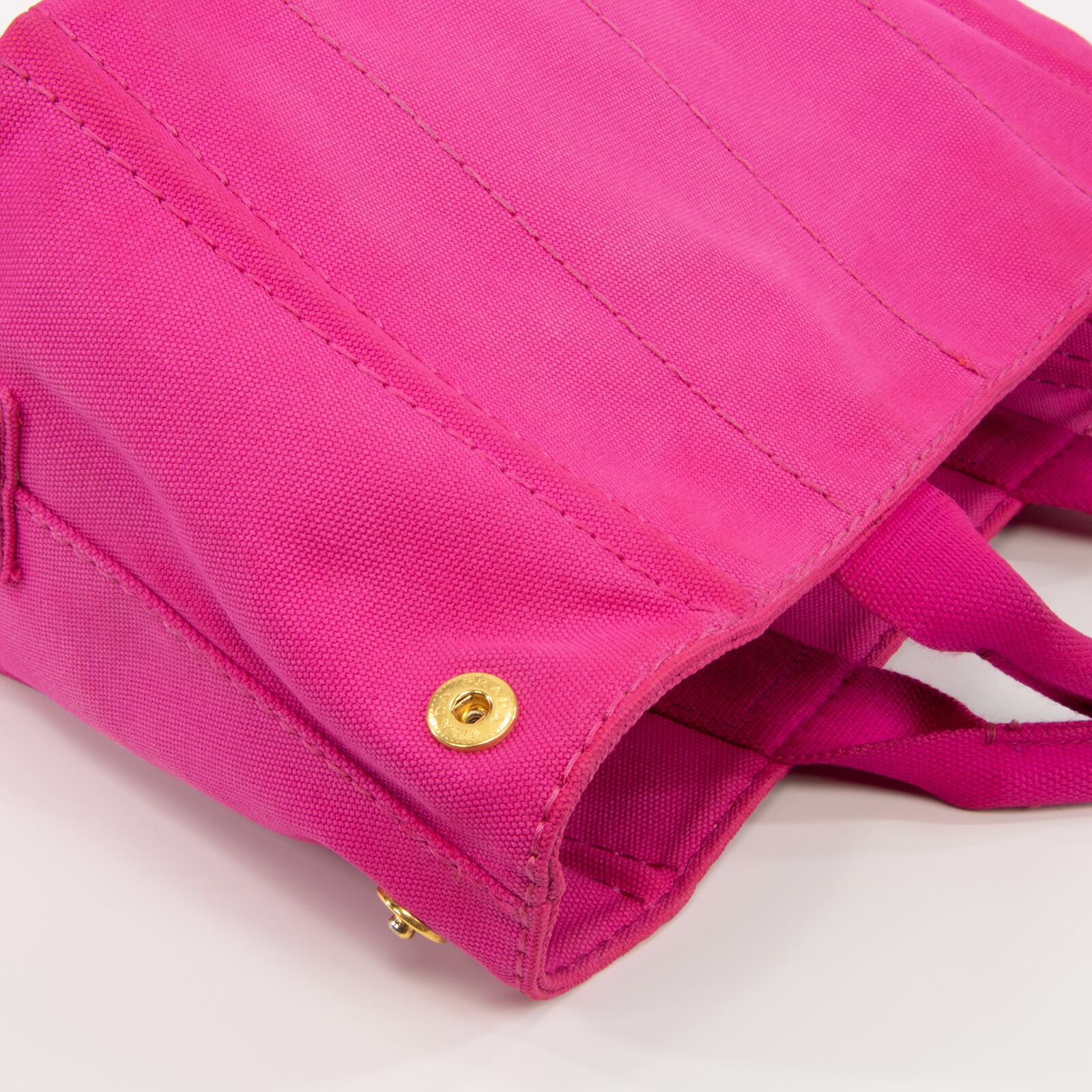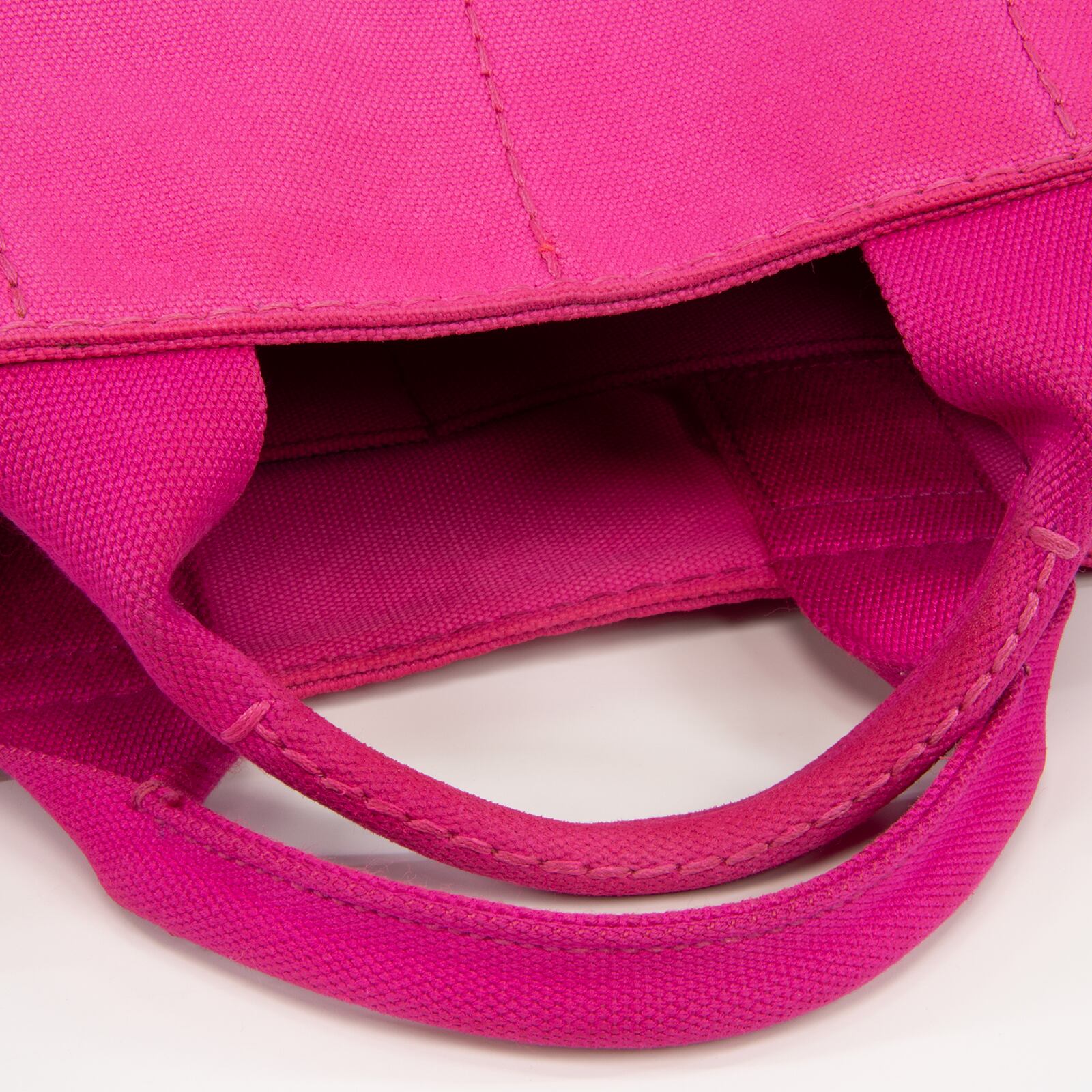 カナパ(SSサイズ・MINI)は女性に大人気のサイズ、さらにフューシャピンクは一番人気のカラーで、前面の「PRADA」の特大ロゴがフューシャピンクのキャンバスによって際立っており、一目でプラダとわかる圧倒的存在感にうっとりさせられます。