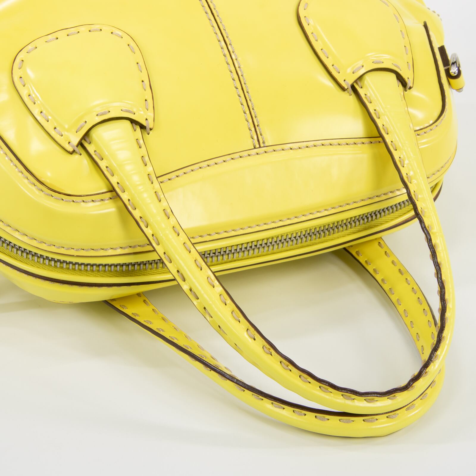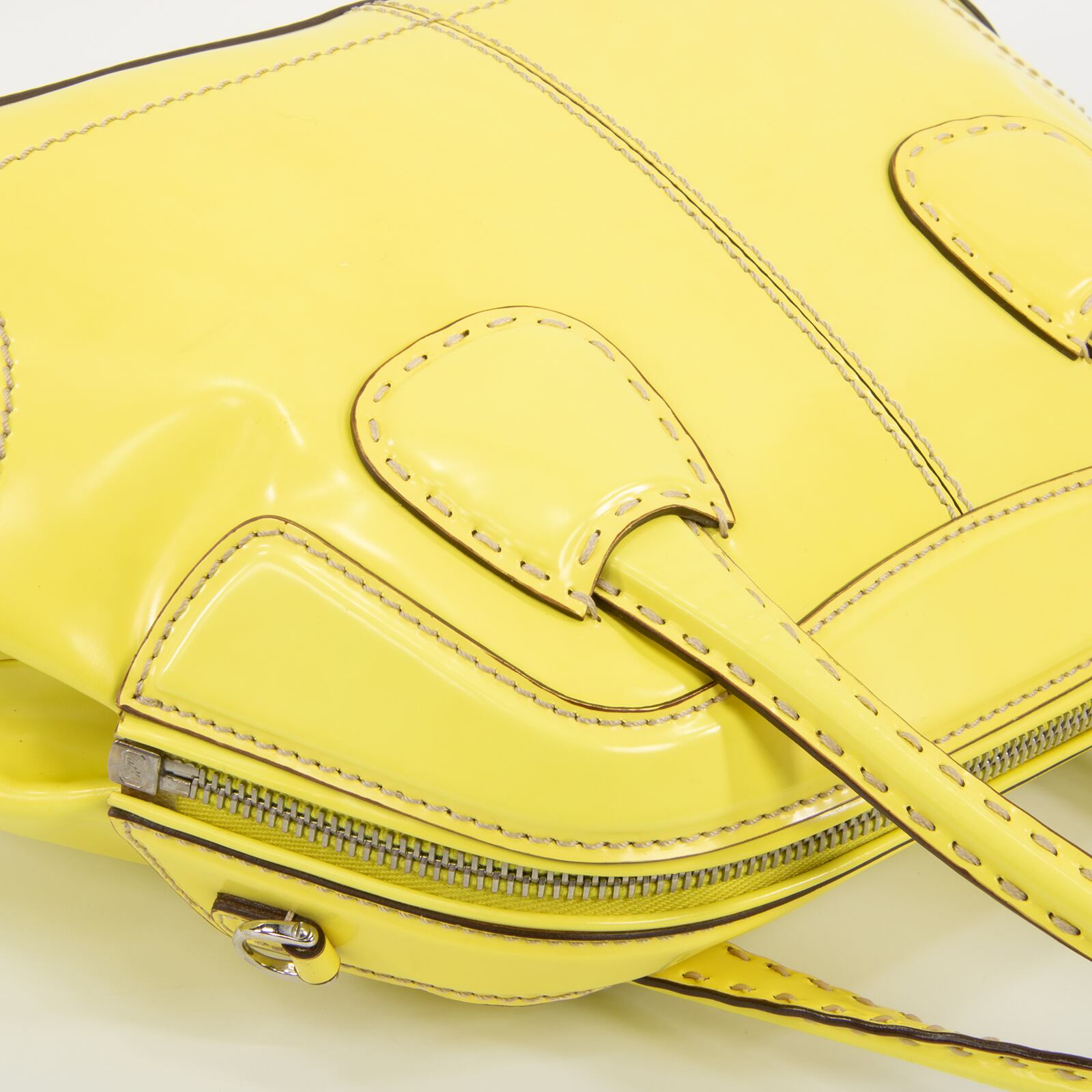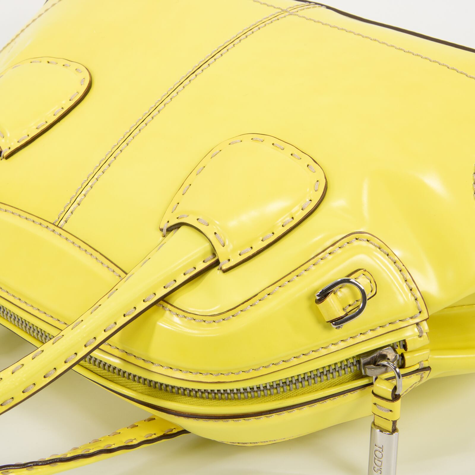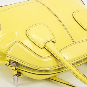 ファスナープルとサイドロゴ(左側)に「TOD'S」が刻印されており、トッズらしくブランドアピールは控えめでありながら、レモンを彷彿とさせるビタミンカラーの艶が美しいパテントレザーと相まって、一目でハイブランドとわかる存在感がございます。