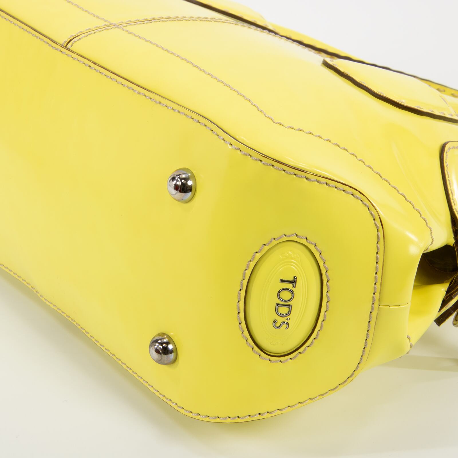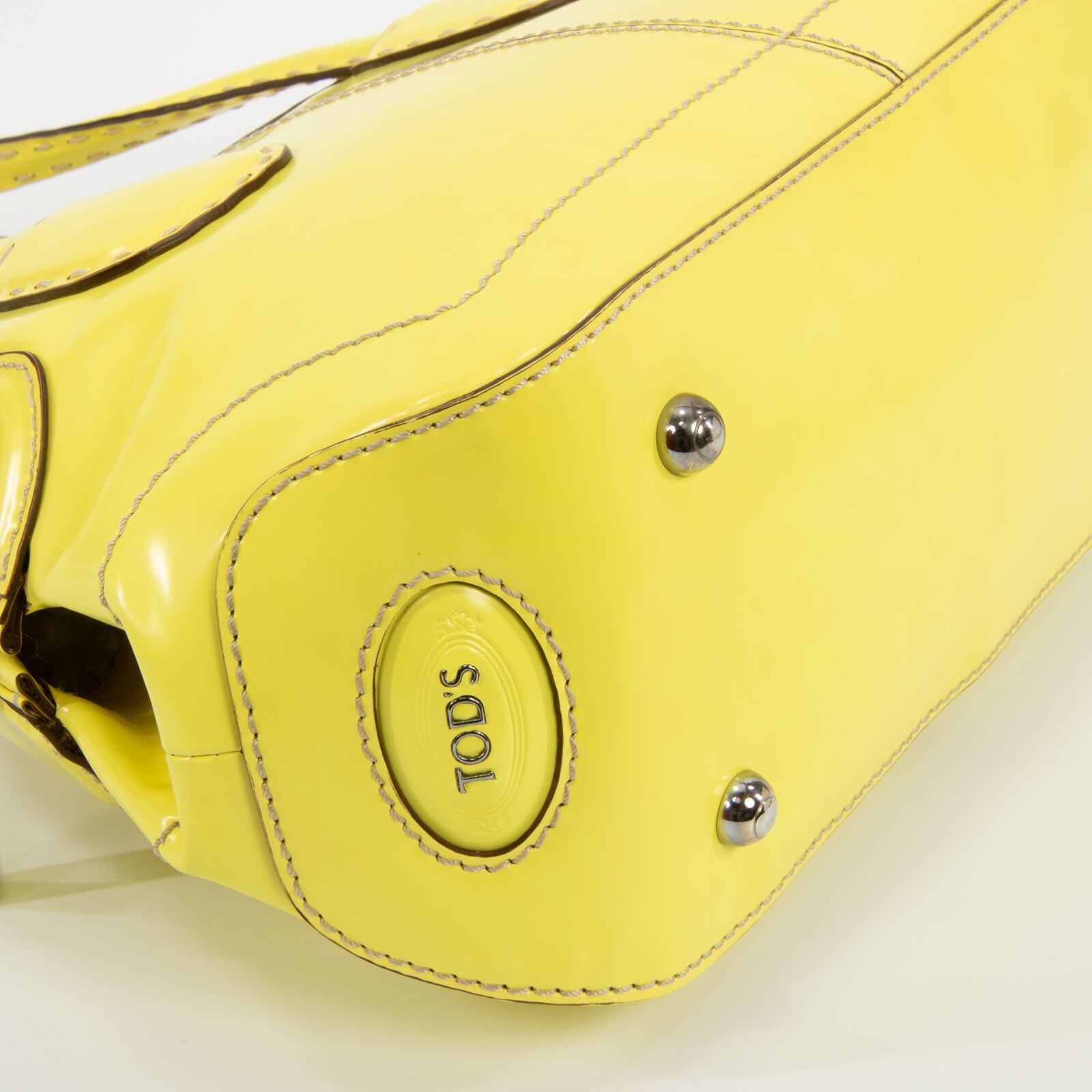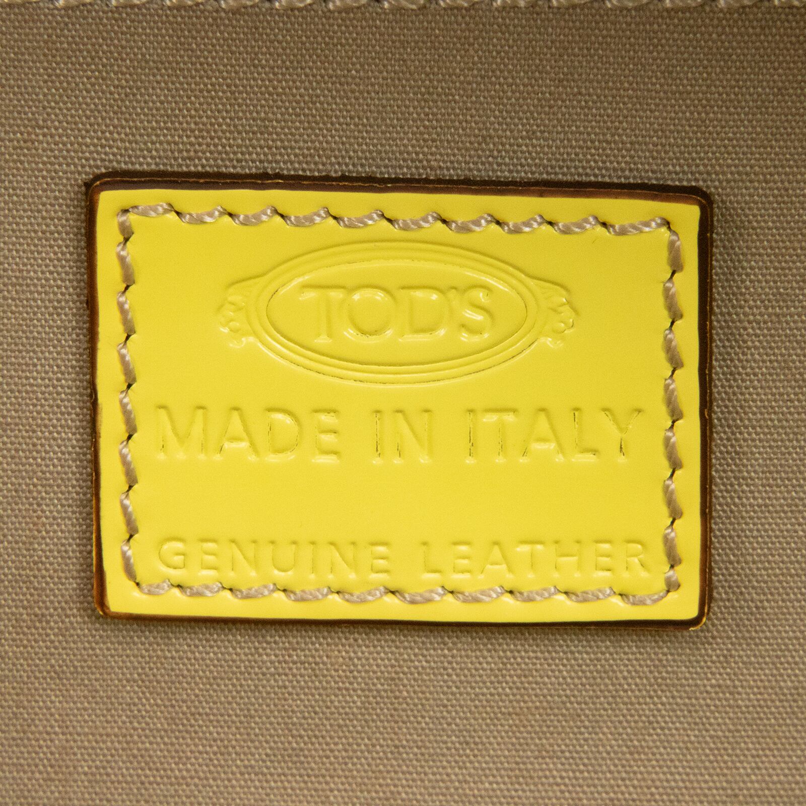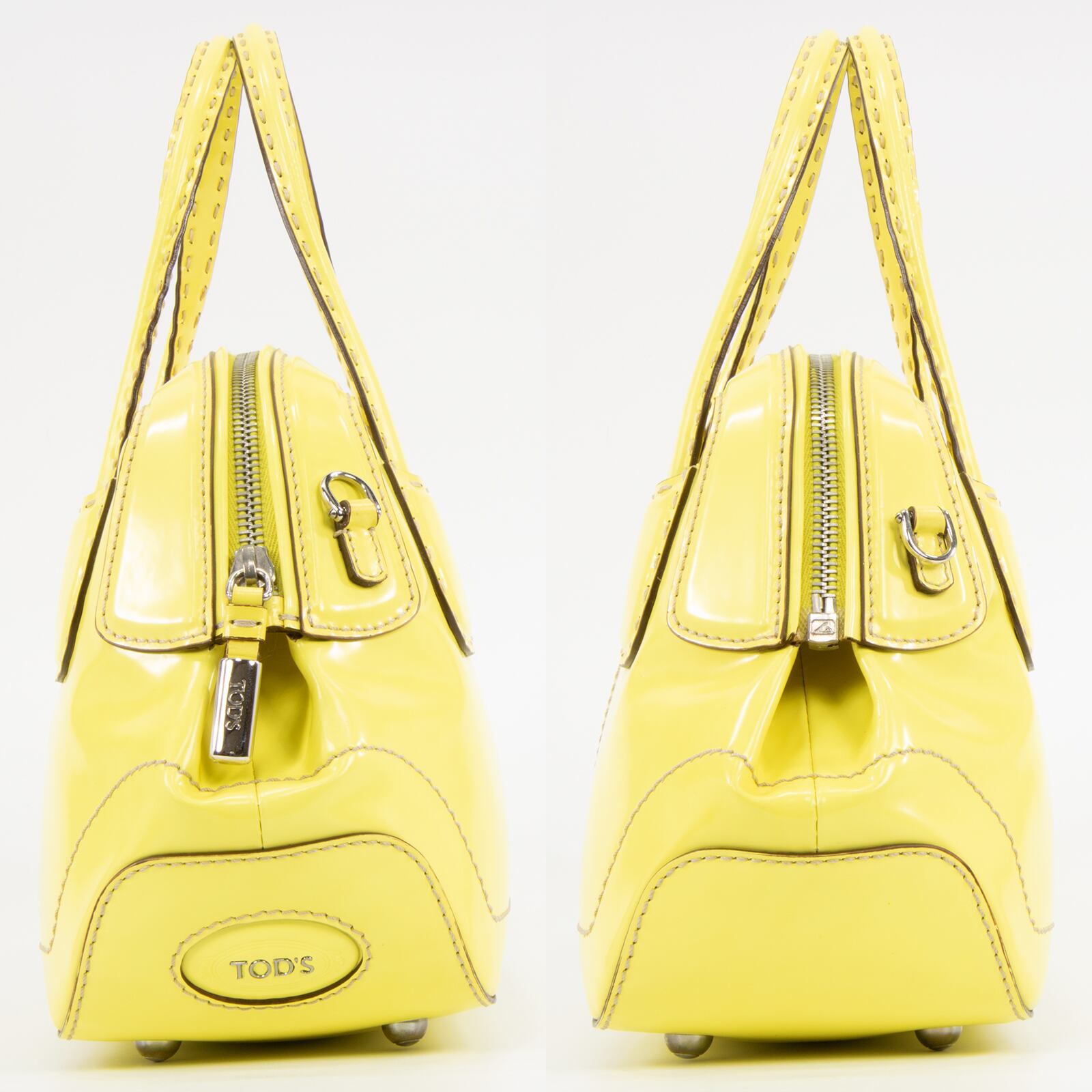 ファスナープルとサイドロゴ(左側)に「TOD'S」が刻印されており、トッズらしくブランドアピールは控えめでありながら、レモンを彷彿とさせるビタミンカラーの艶が美しいパテントレザーと相まって、一目でハイブランドとわかる存在感がございます。