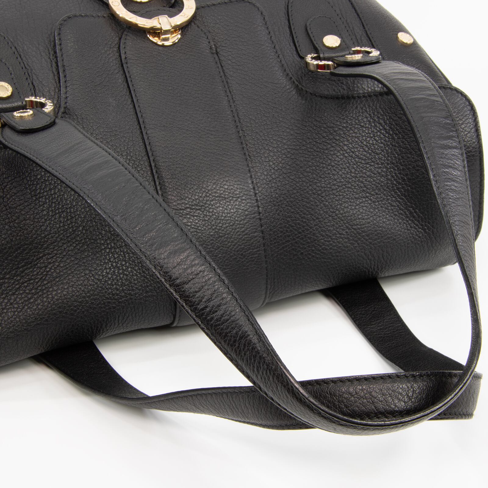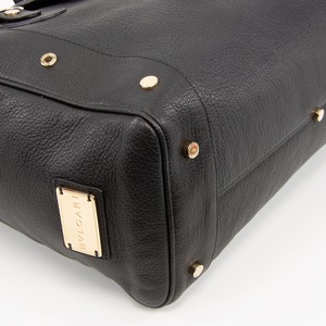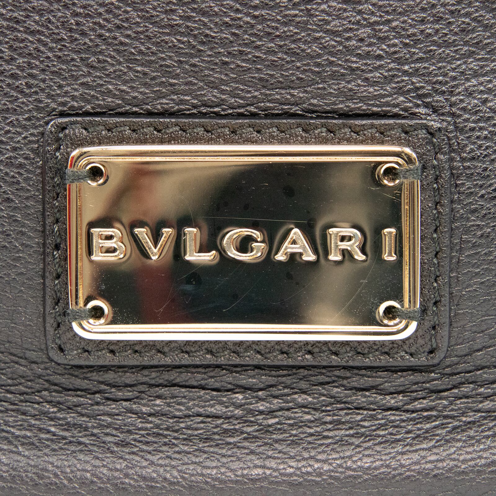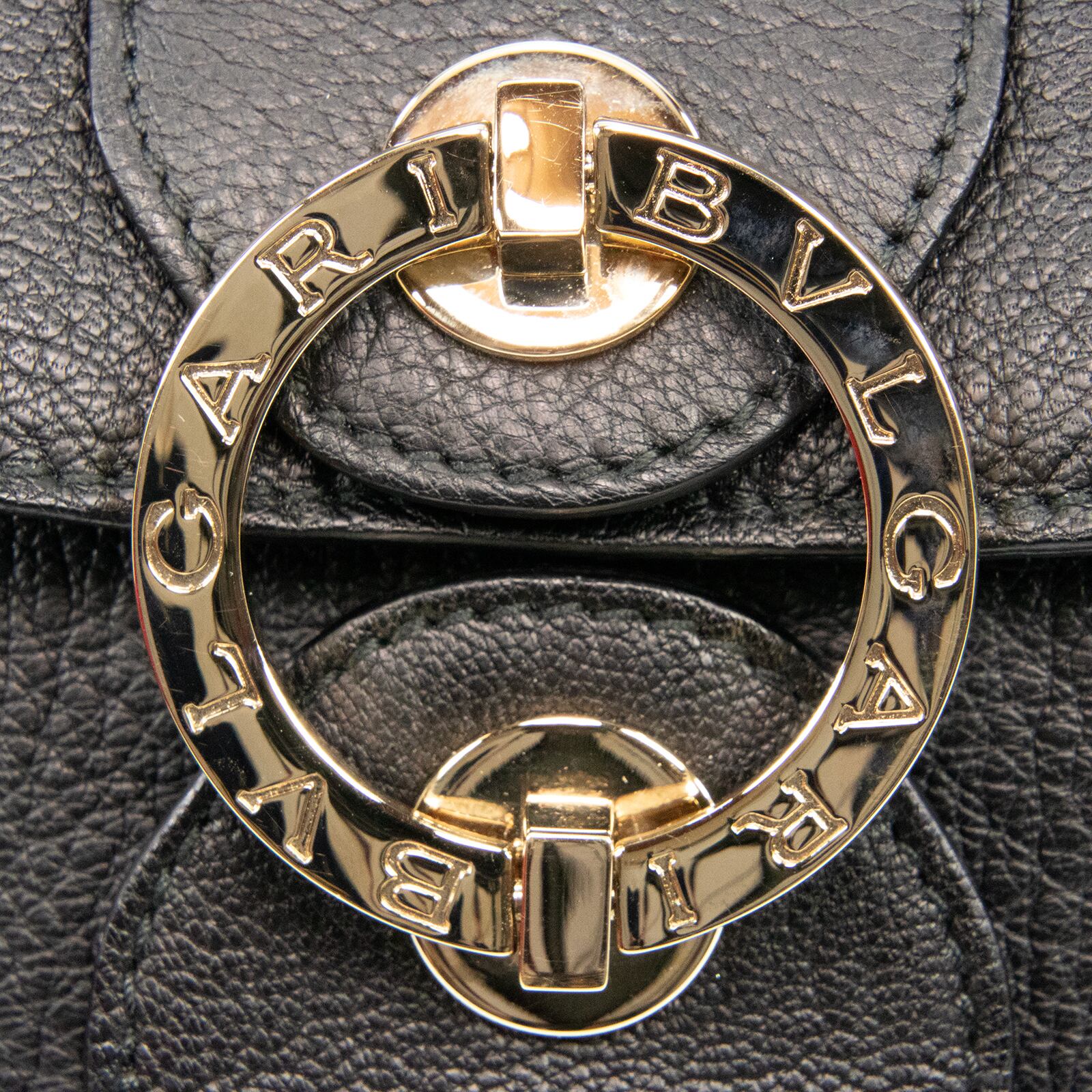 「BVLGARI」が刻印された、ゴールドカラーの金具やサークルロゴが多数あしらわれており、ブラックカラーの高級皮革と相まって、一目でブルガリとわかる存在感とエレガントな大人の女性の魅力が感じられる逸品でございます。