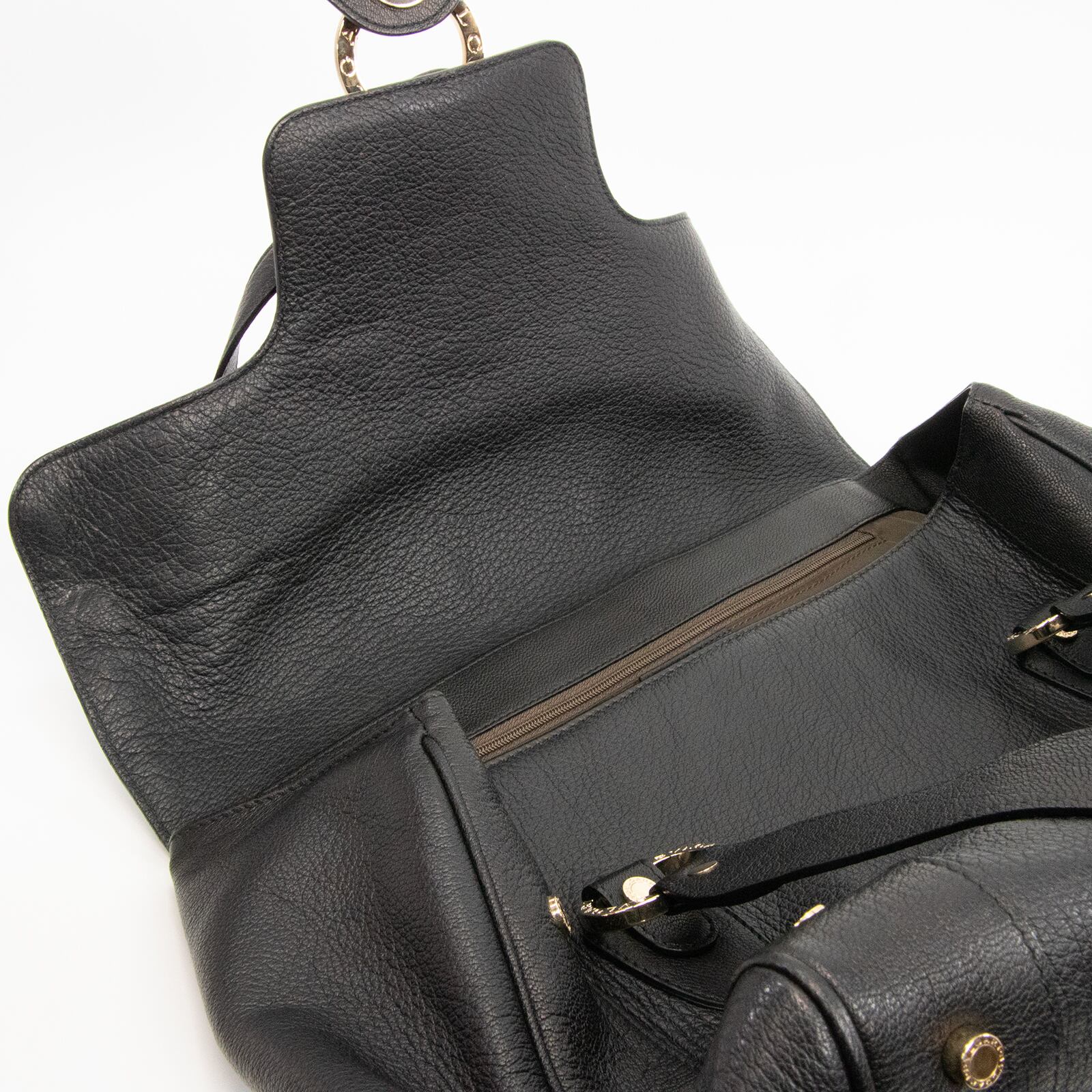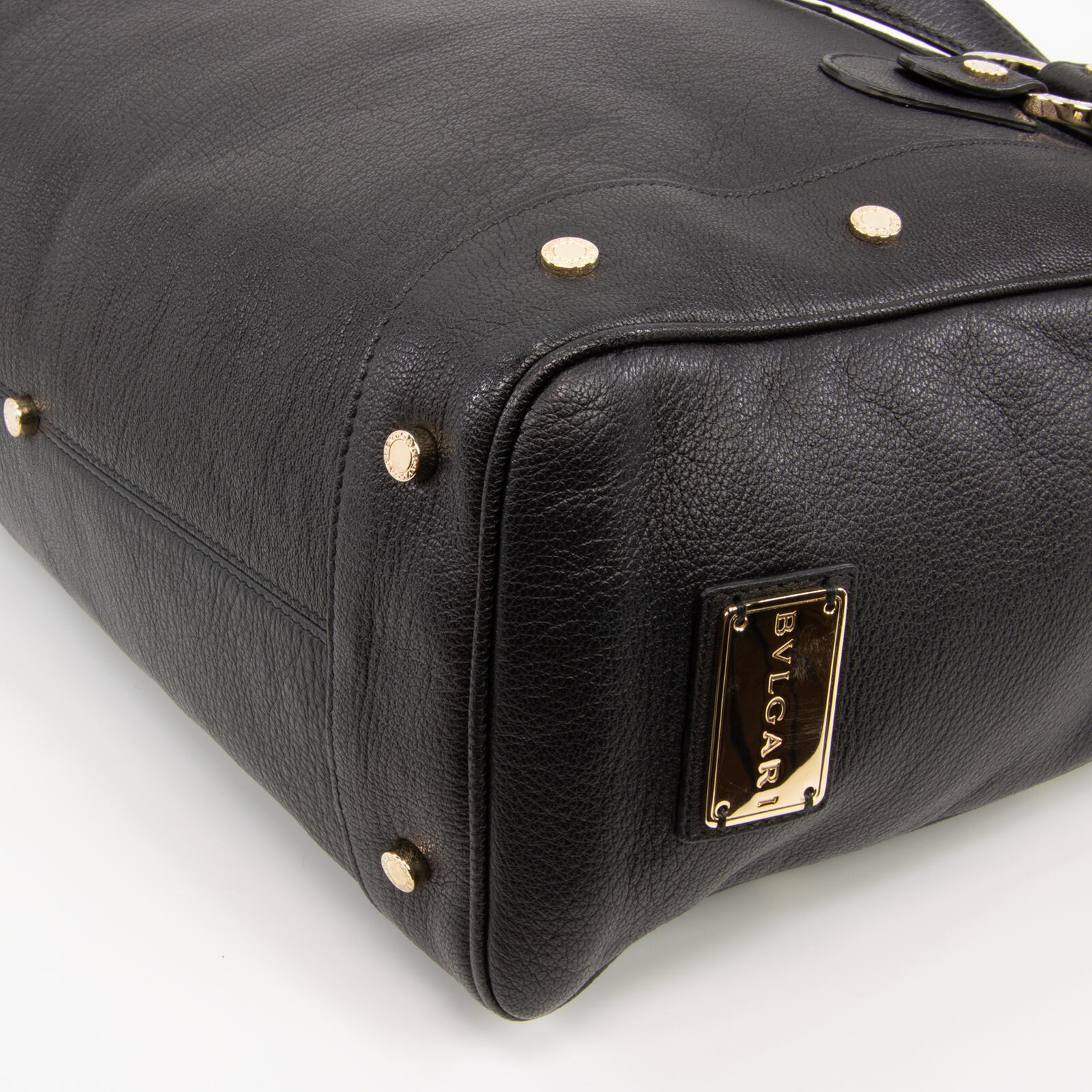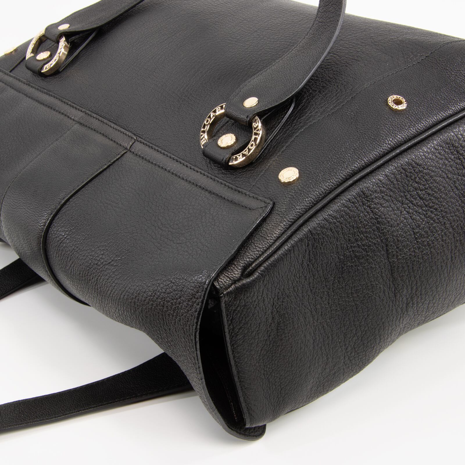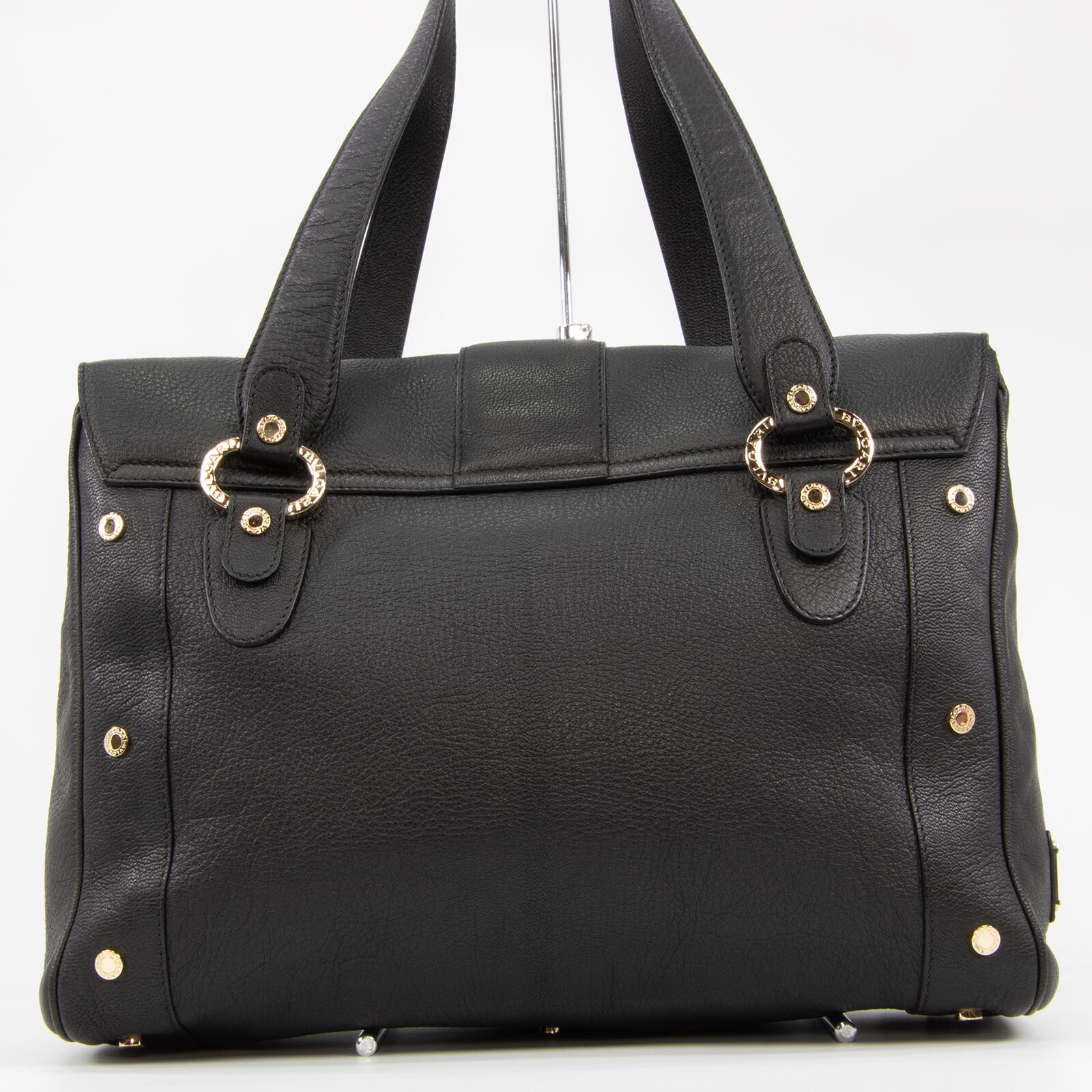 「BVLGARI」が刻印された、ゴールドカラーの金具やサークルロゴが多数あしらわれており、ブラックカラーの高級皮革と相まって、一目でブルガリとわかる存在感とエレガントな大人の女性の魅力が感じられる逸品でございます。