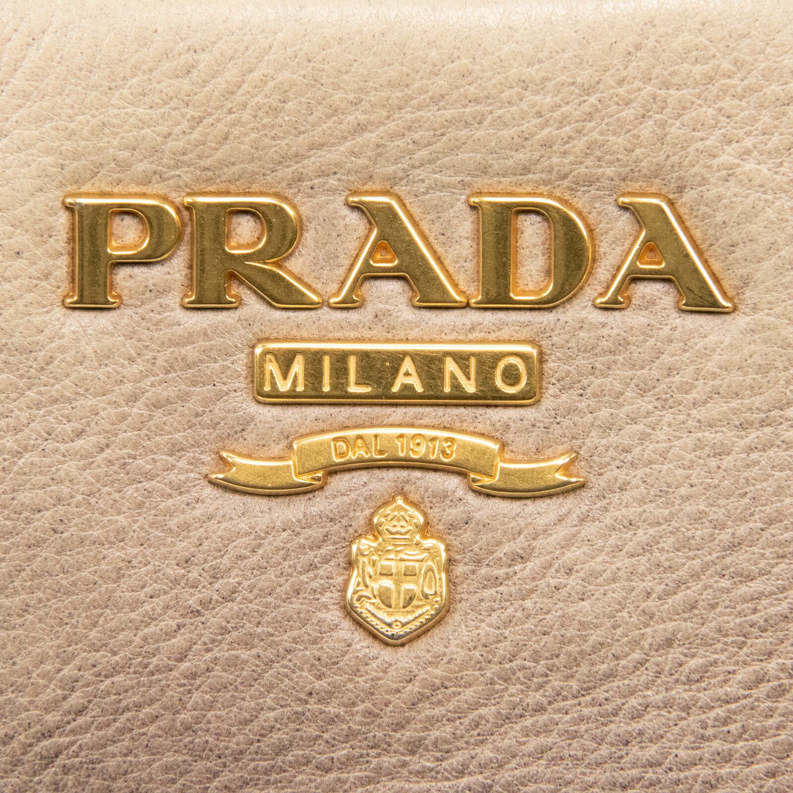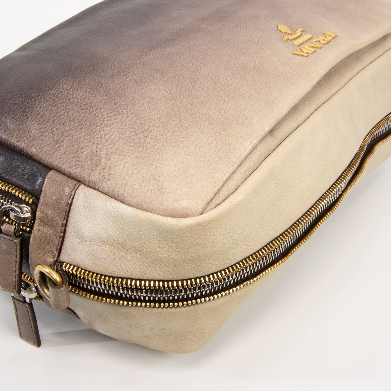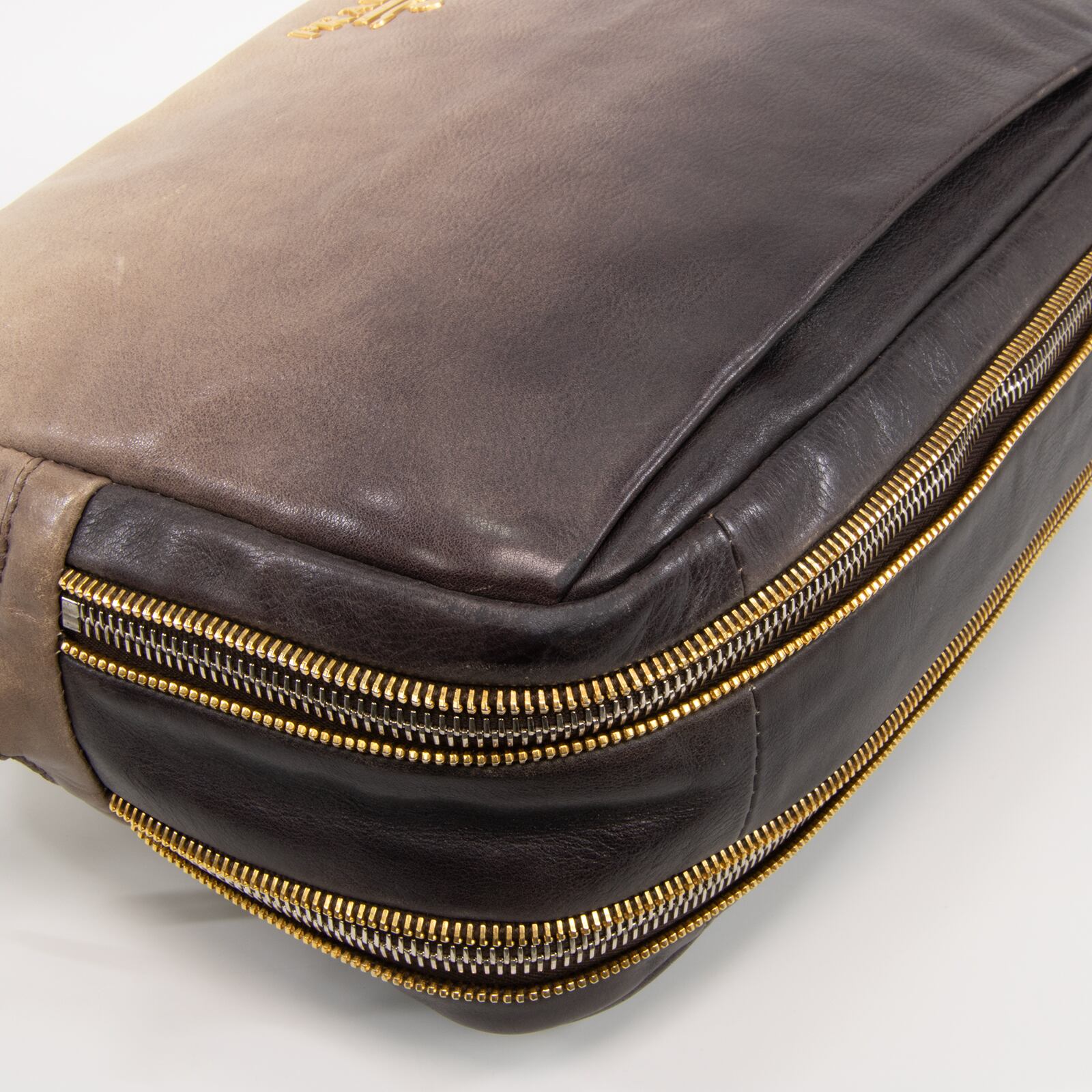 金具がゴールドとシルバーのバイカラー、エレガンスで洗練された都会的な印象のグラデーションレザーが特徴で、前面の大きなPRADAのロゴと相まって、一目でプラダとわかる存在感とただならぬ雰囲気が感じられる逸品でございます。プラダならではの最高級皮革の深い味わいにうっとりさせられます。