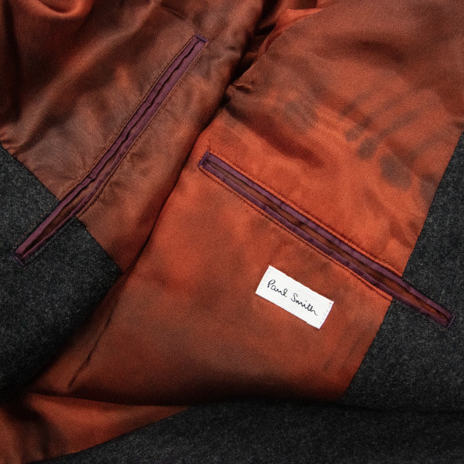 ジャケットの内側全面には、夕焼けのようなバーミリオンカラーに薄黒いカラーリングがされており、ジャケットを広げるたびに、ただならぬ雰囲気を感じさせうっとりさせられます。どのような場面でもお客様の洗練された美しさを引き立ててくれます。