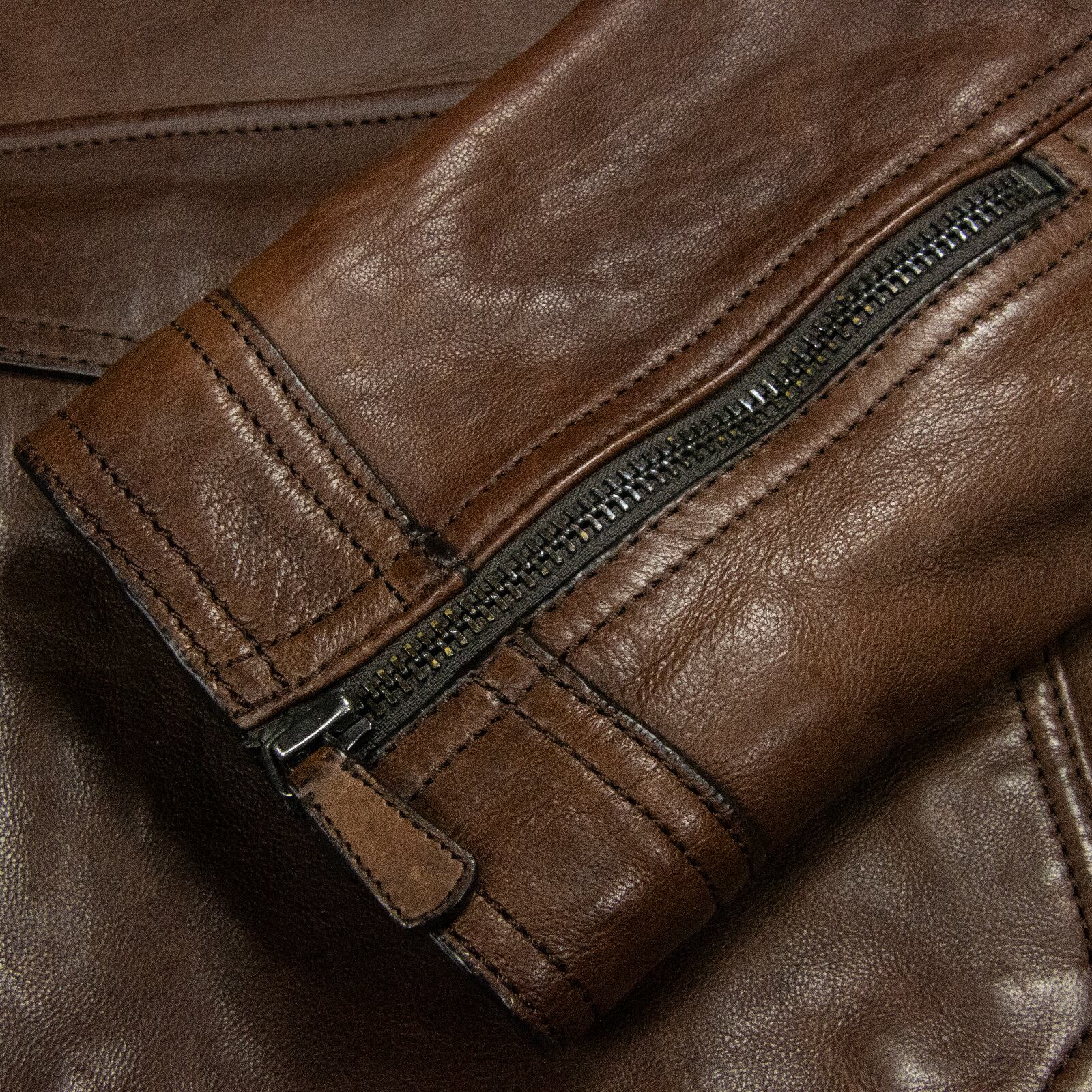 掲載写真のように、程良い通気性と腕が動かしやすい脇裏構造になっていながら、絶妙に防寒性に優れており、収納力の高いポケットが多くあるため、実用性・着心地の良さがとても素晴らしいです。本気で末永く最高の革ジャンを使い続けたいお客様にピッタリでございます。