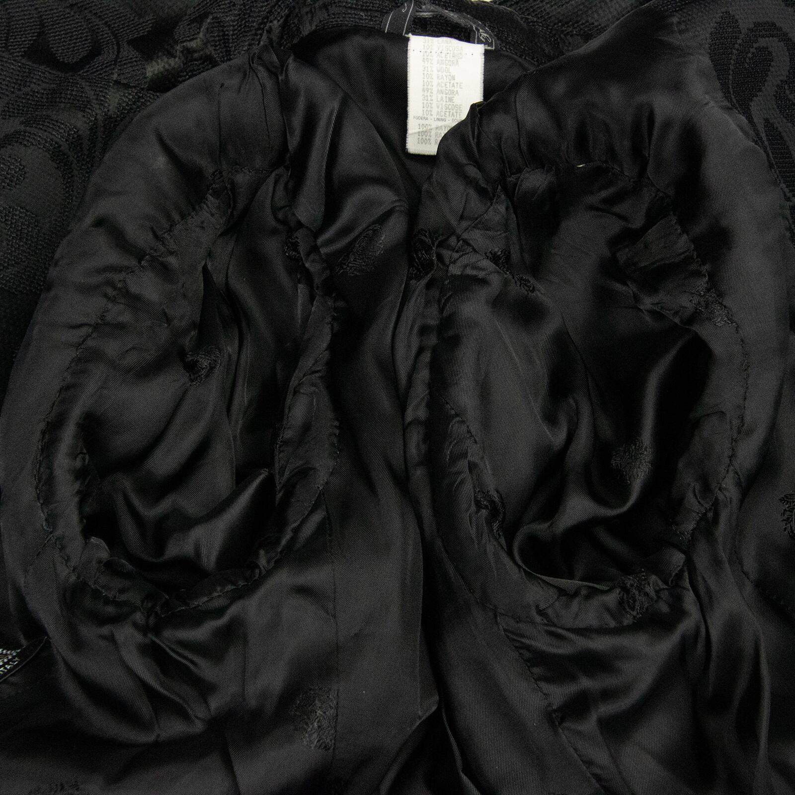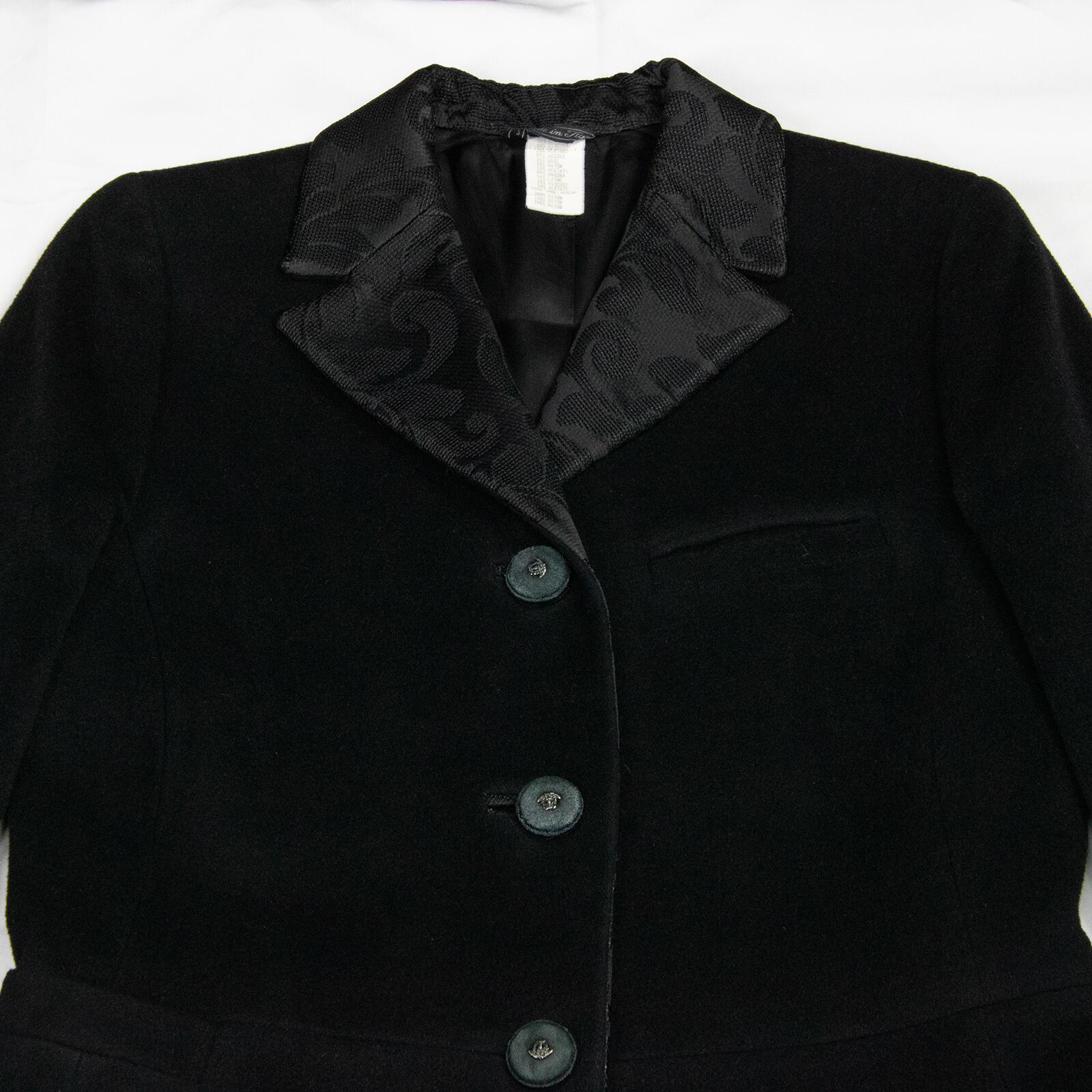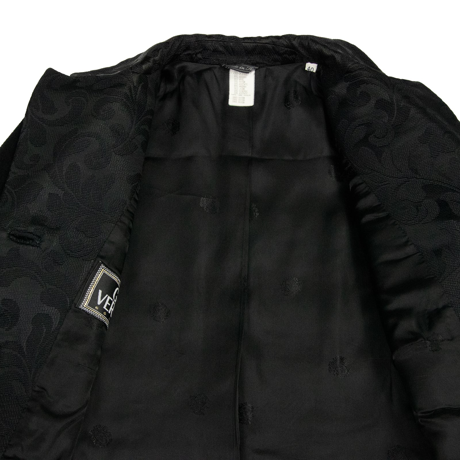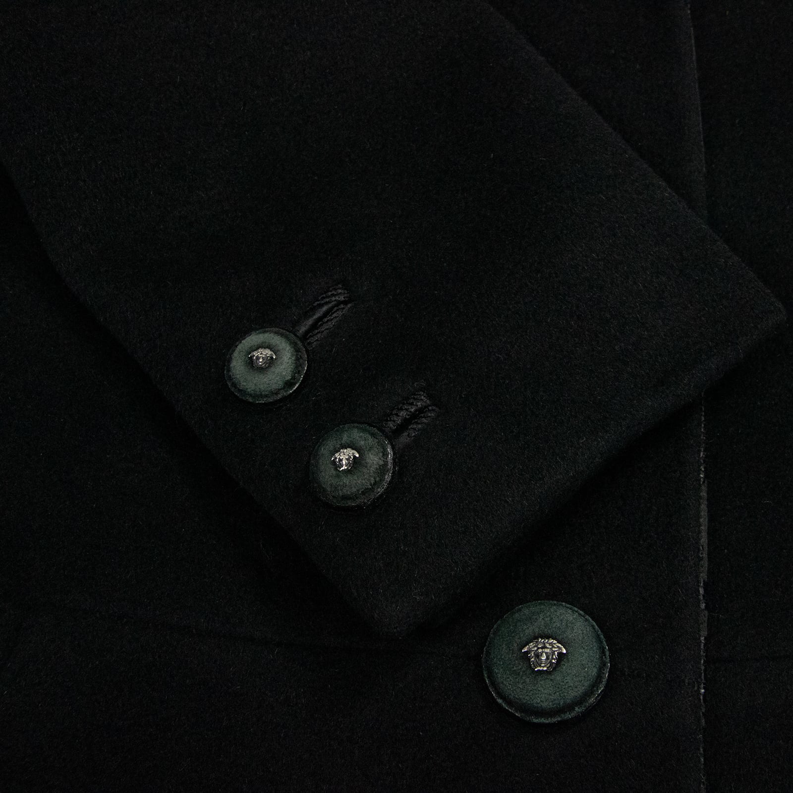 表地にアンゴラやウールなどを混紡させた贅沢な生地をあしらっており、フロントと袖のメドゥーサボタン・襟のアカンサス柄によって、一目でヴェルサーチェとわかる存在感とただならぬ雰囲気が感じられる逸品でございます。