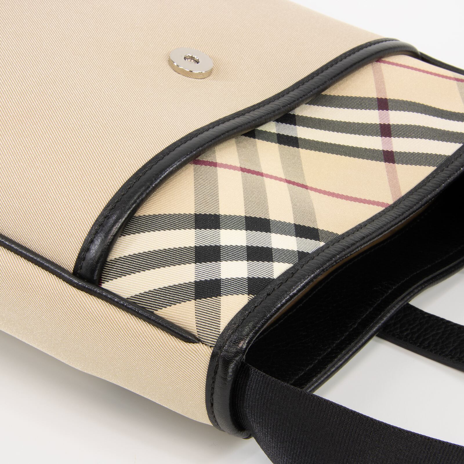 バッグの外側はブランドアピールを控えめに、全体的にベージュのナイロンがあしらわれており、バッグの前面から覗かせているノバチェックが相まって、一目でバーバリーとわかる存在感と落ち着いた大人の魅力にうっとりさせられます。開け口はフラップマグネットタイプで、安心して物の出し入れができます。