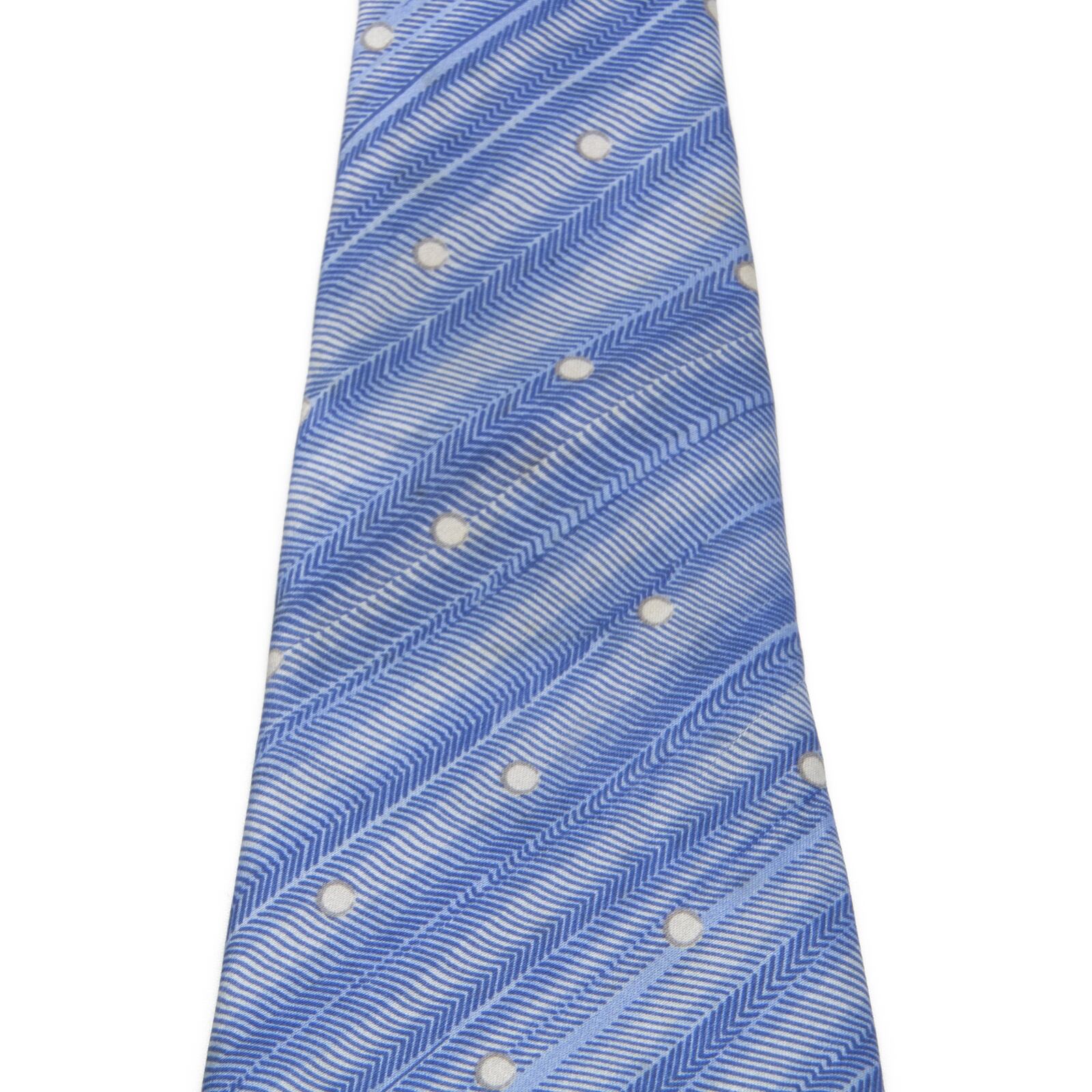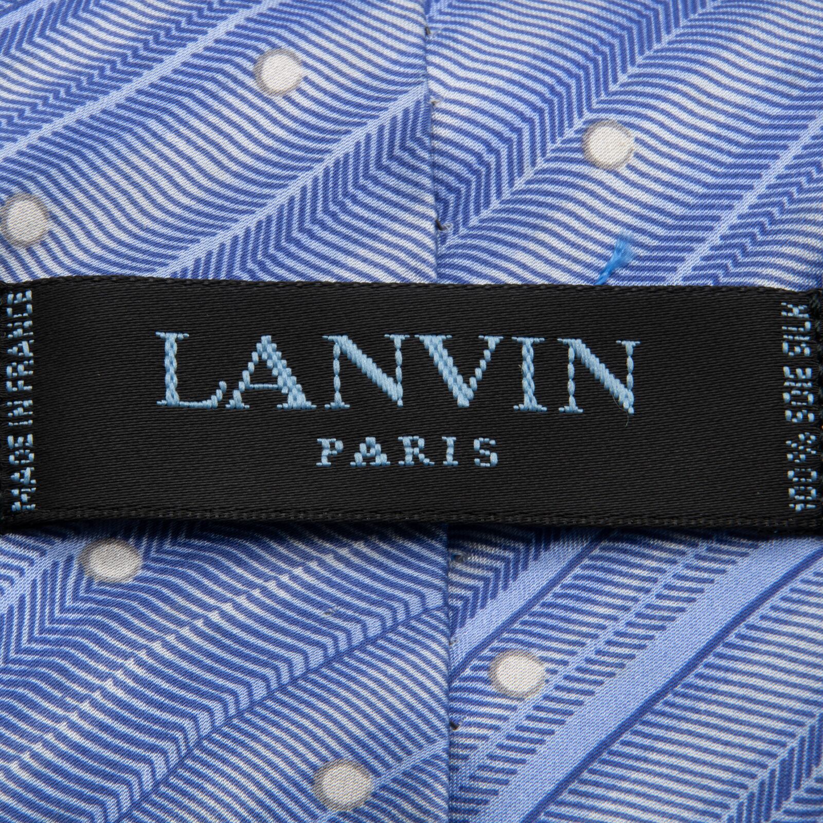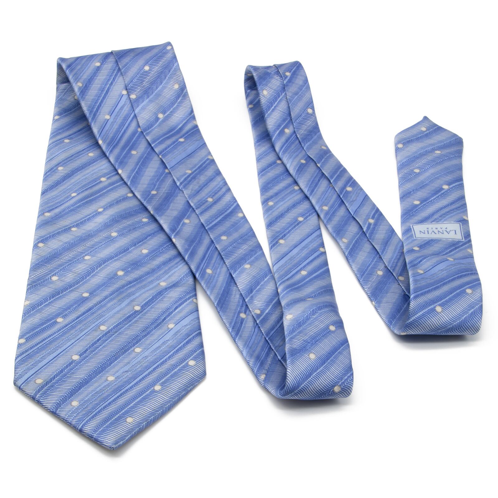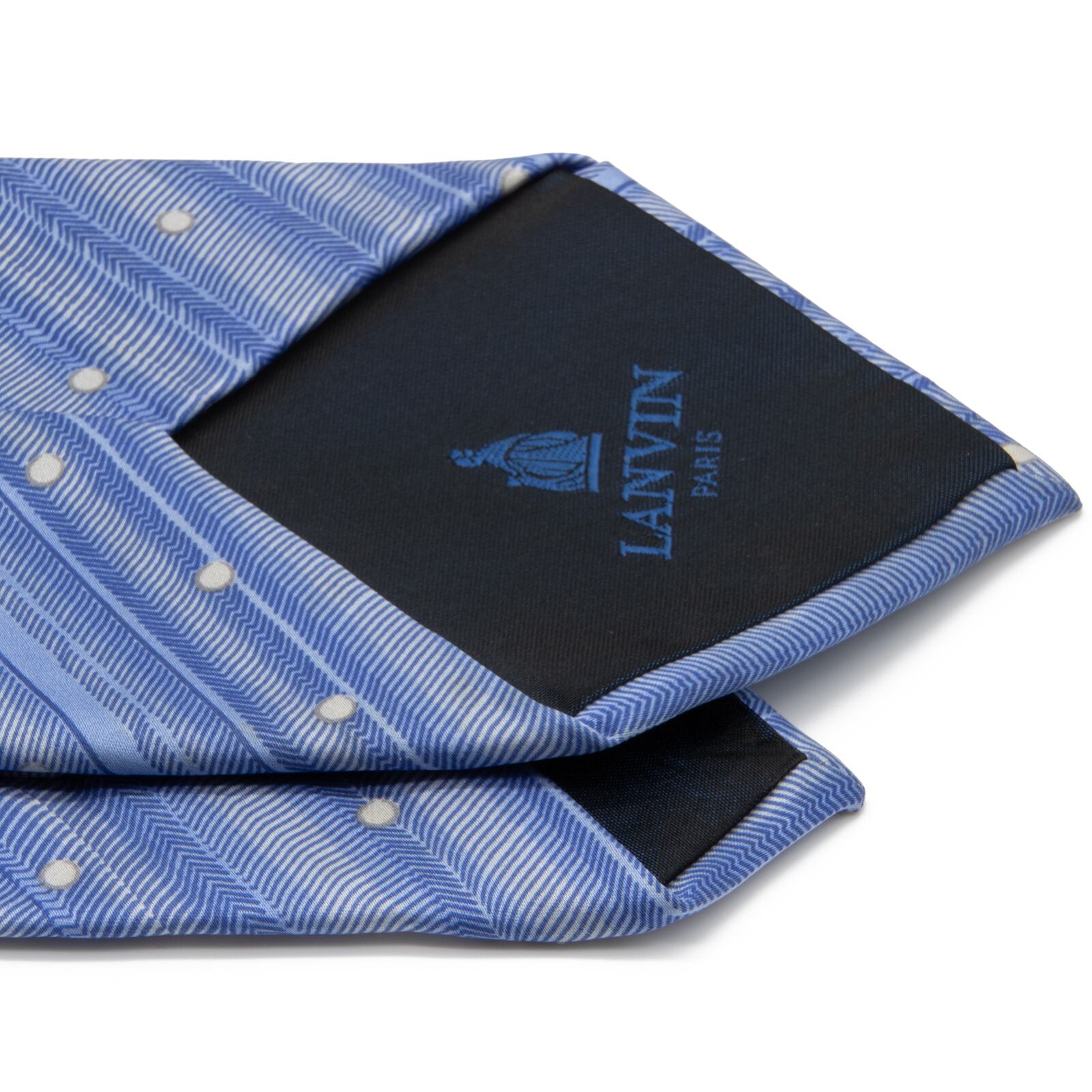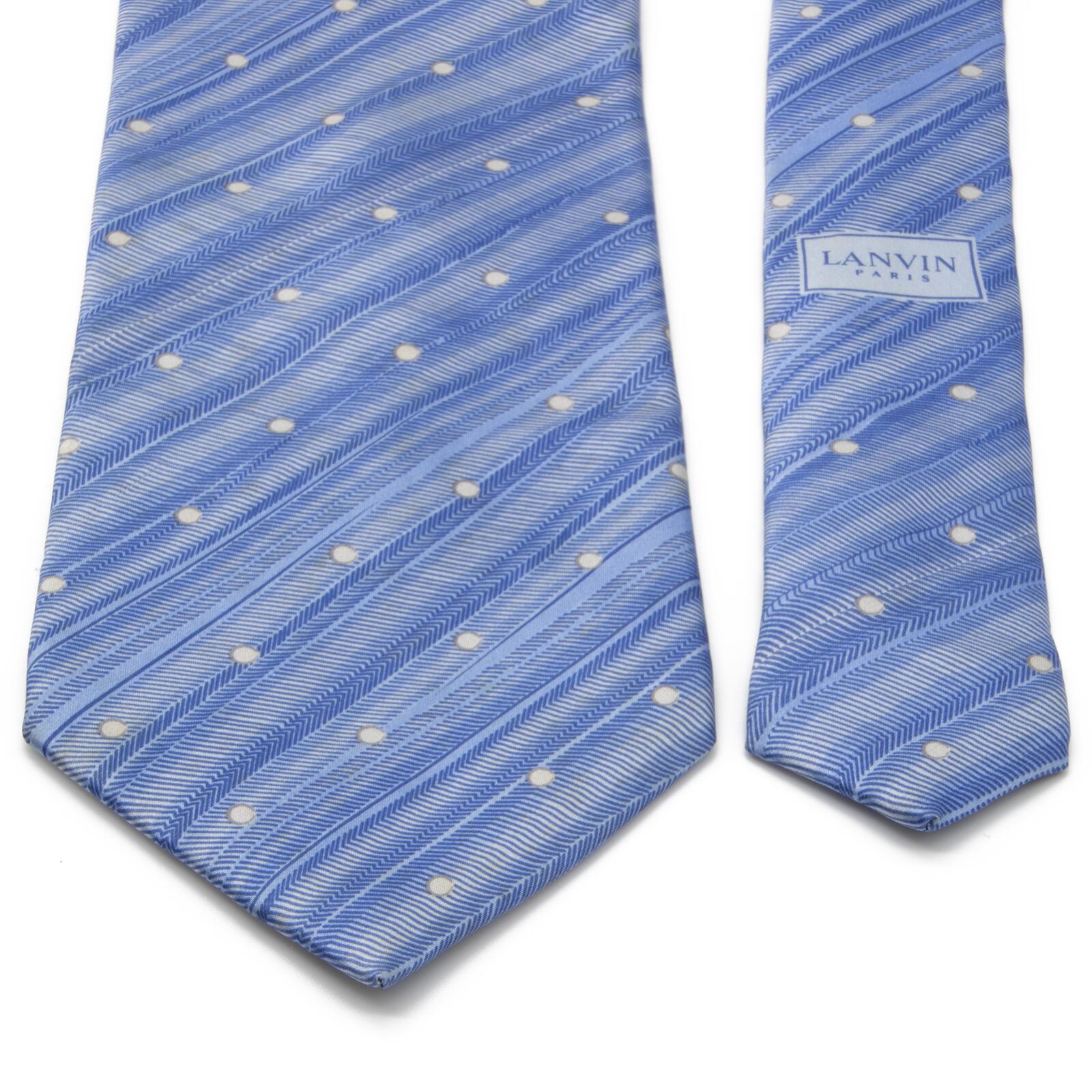 ランバンのストライプネクタイの中でも大変希少なモデルで、爽やかな印象のブルー系ストライプと、ホワイト系の水玉が全面にあしらわれており、最高級シルクのふっくらとした柔らかい肌触りと光沢が相まって、洗練された美しさとただならぬ雰囲気にうっとりさせられます。