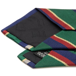 ダンヒルのマルチストライプネクタイの中でも大変希少なモデルで、大剣と小剣の裏には「dunhill」のロゴ、大剣の表にはダンヒルの「d」マークがあしらわれており、最高級シルクのふっくらとした柔らかい肌触りと光沢が相まって、洗練された美しさと落ち着いた大人の魅力にうっとりさせられます。