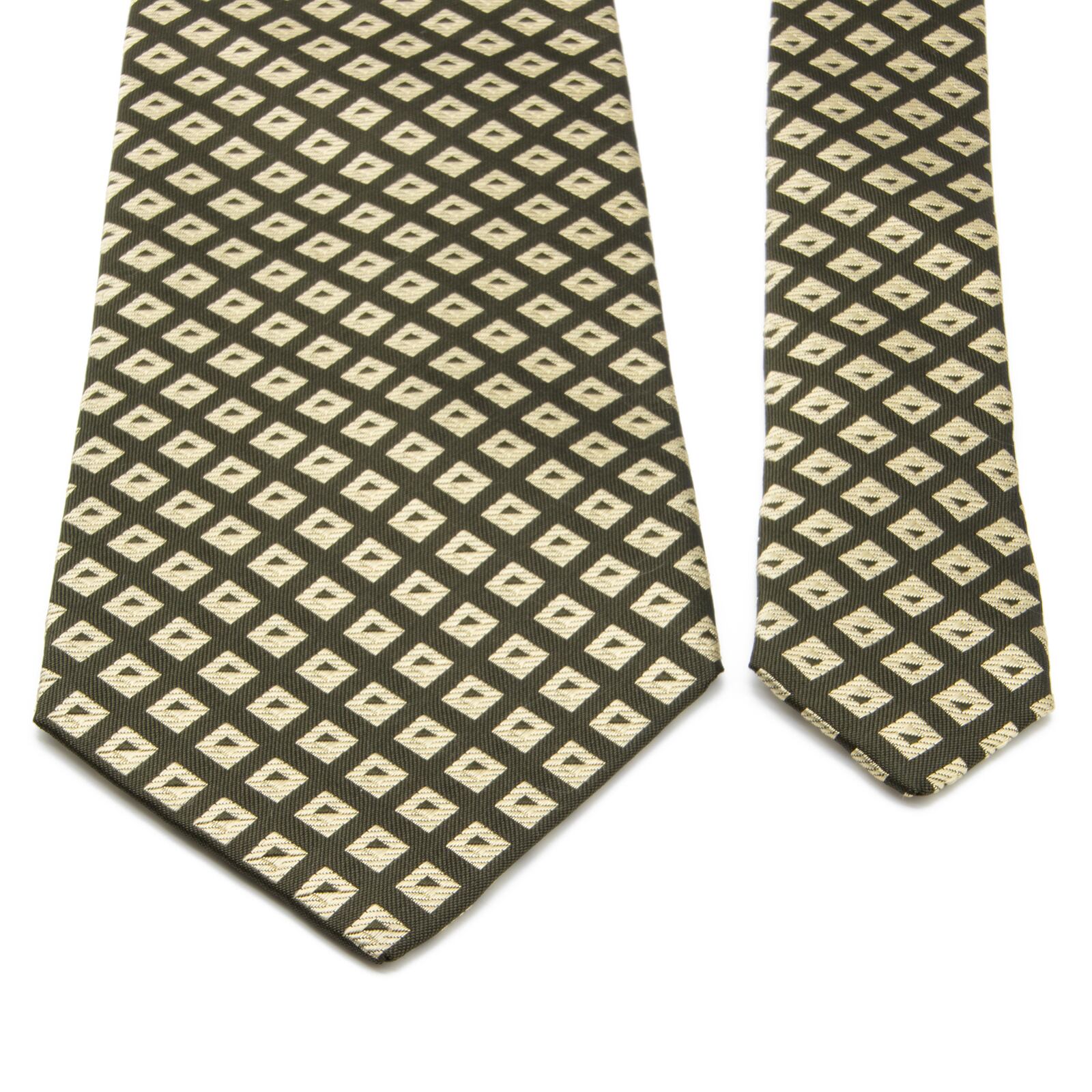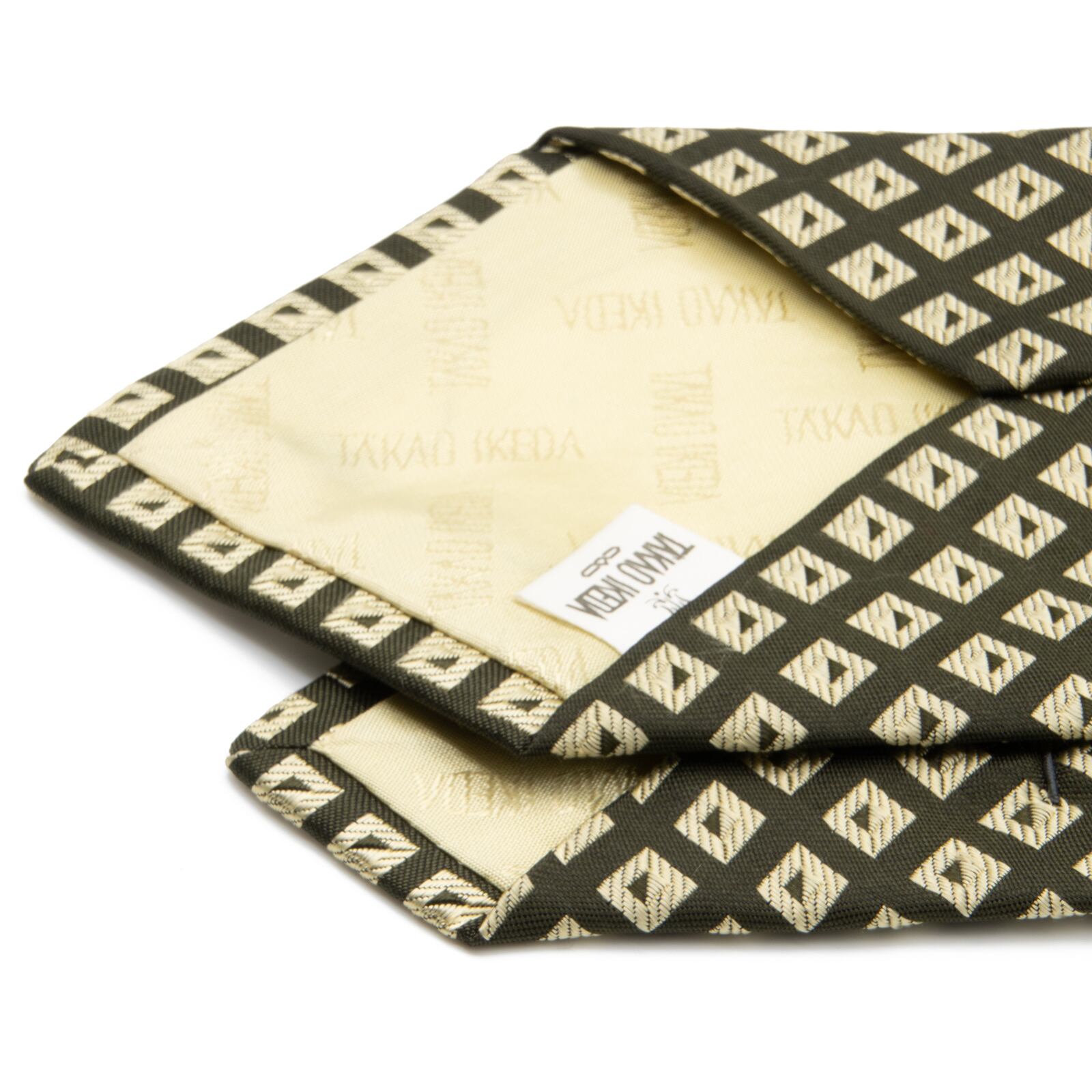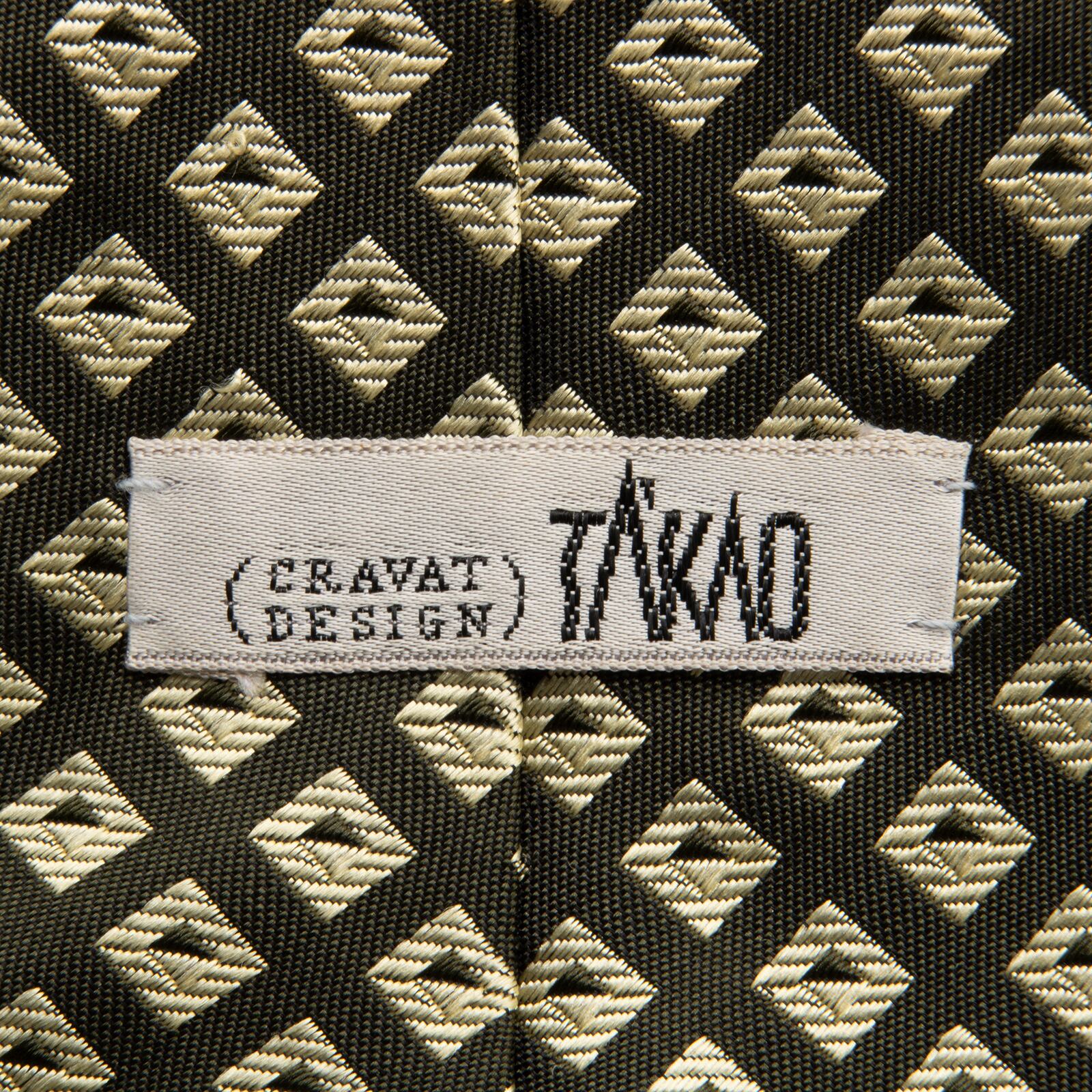 タカオ イケダの小紋ネクタイの中でも大変希少なモデルで、その中でも新品同様のものはさらにとても珍しいです。大剣と小剣の裏には「TAKEO IKEDA」があしらわれており、全体的にメタリックカラーでありながら、最高級シルクのふっくらとした柔らかい肌触りと光沢が相まって、洗練された美しさと存在感にうっとりさせられます。