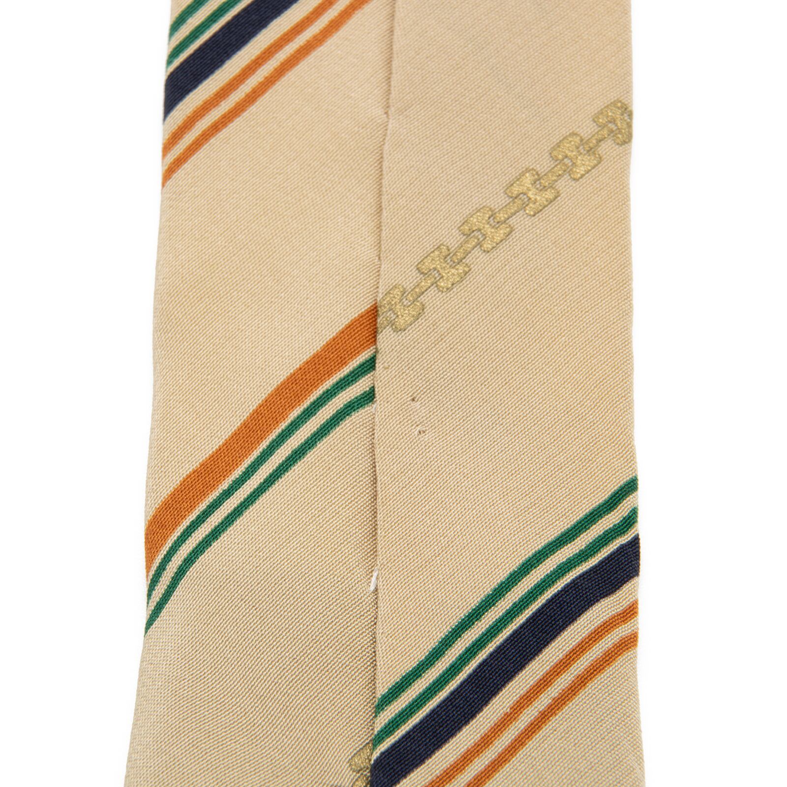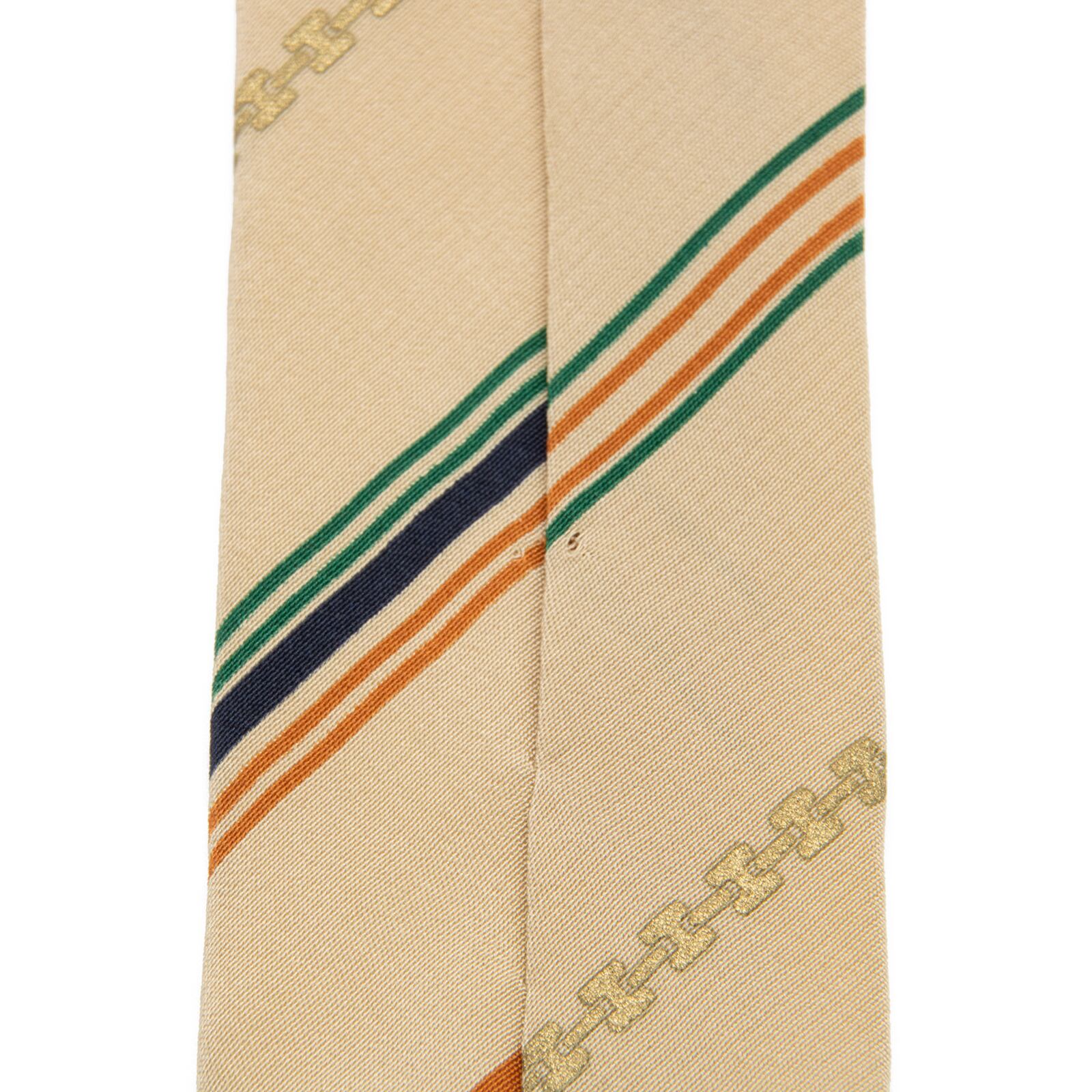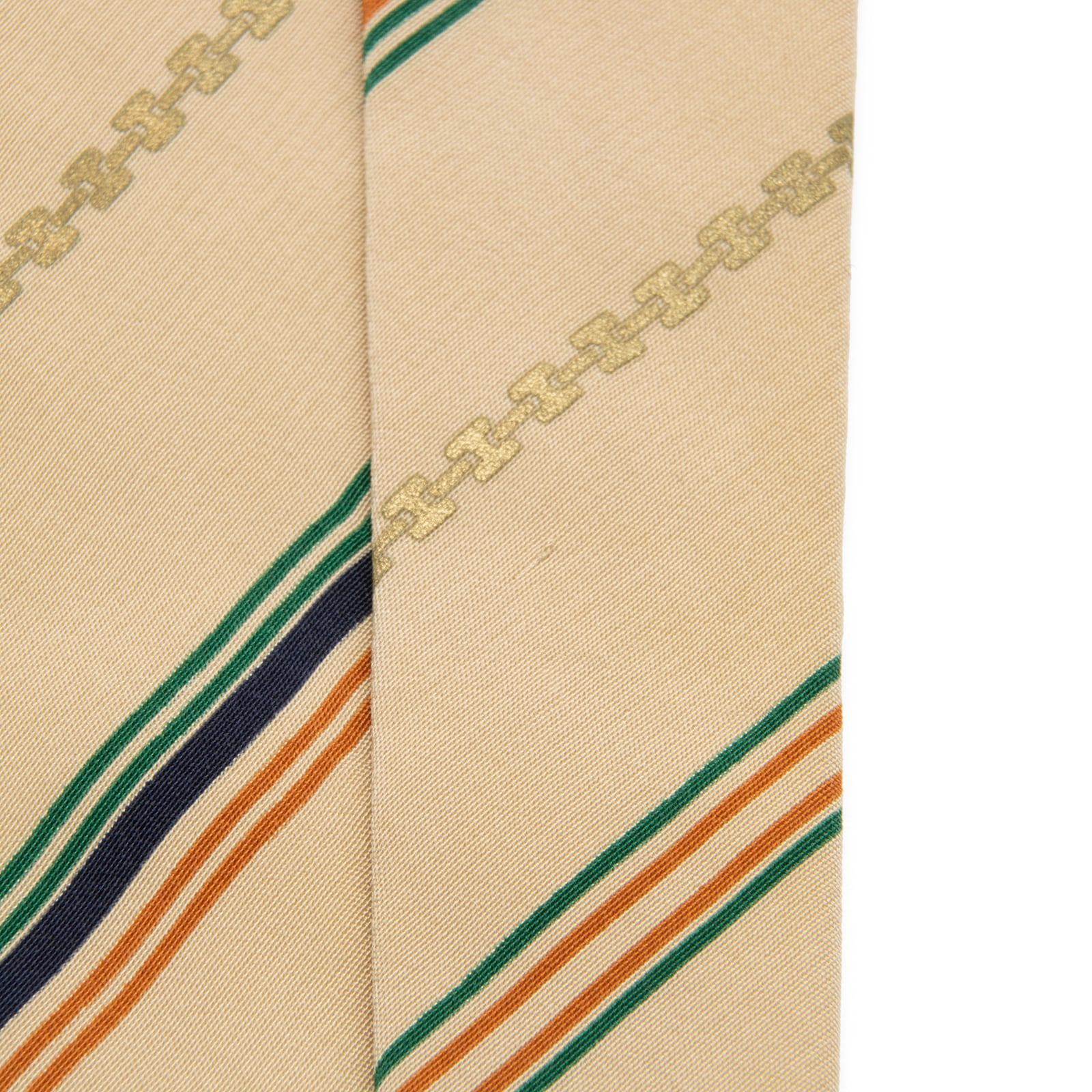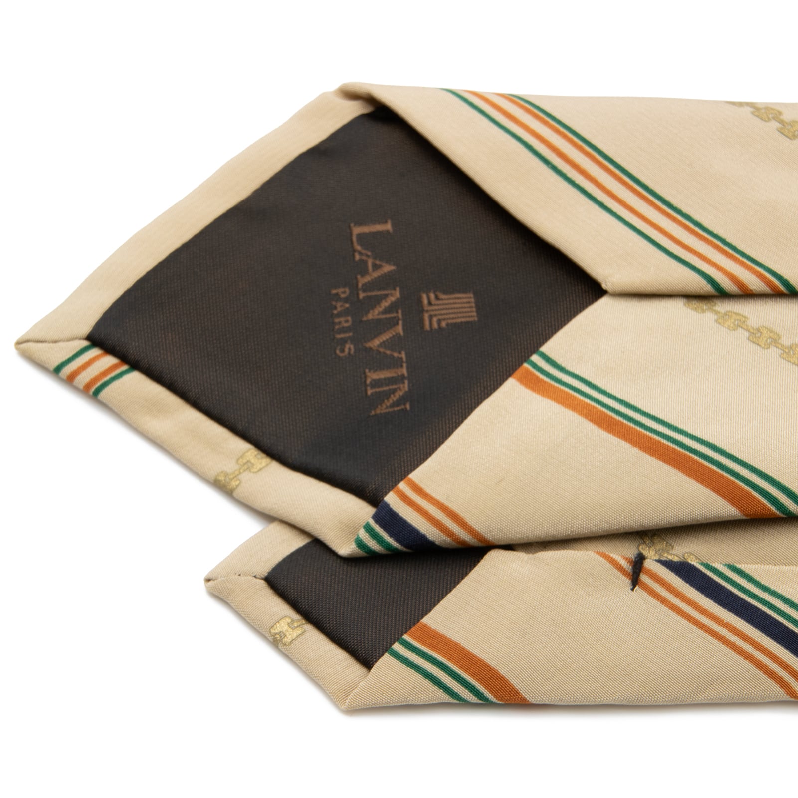 ランバンのストライプネクタイの中でも大変希少なモデルで、落ち着いた配色でありながら、全面にゴールドチェーンのストライプ・大剣の表と裏に「LANVIN」のロゴがあり、ただならぬ雰囲気を感じさせるデザインで、最高級シルクのふっくらとした柔らかい肌触りと光沢が相まって、洗練された美しさと存在感にうっとりさせられます。