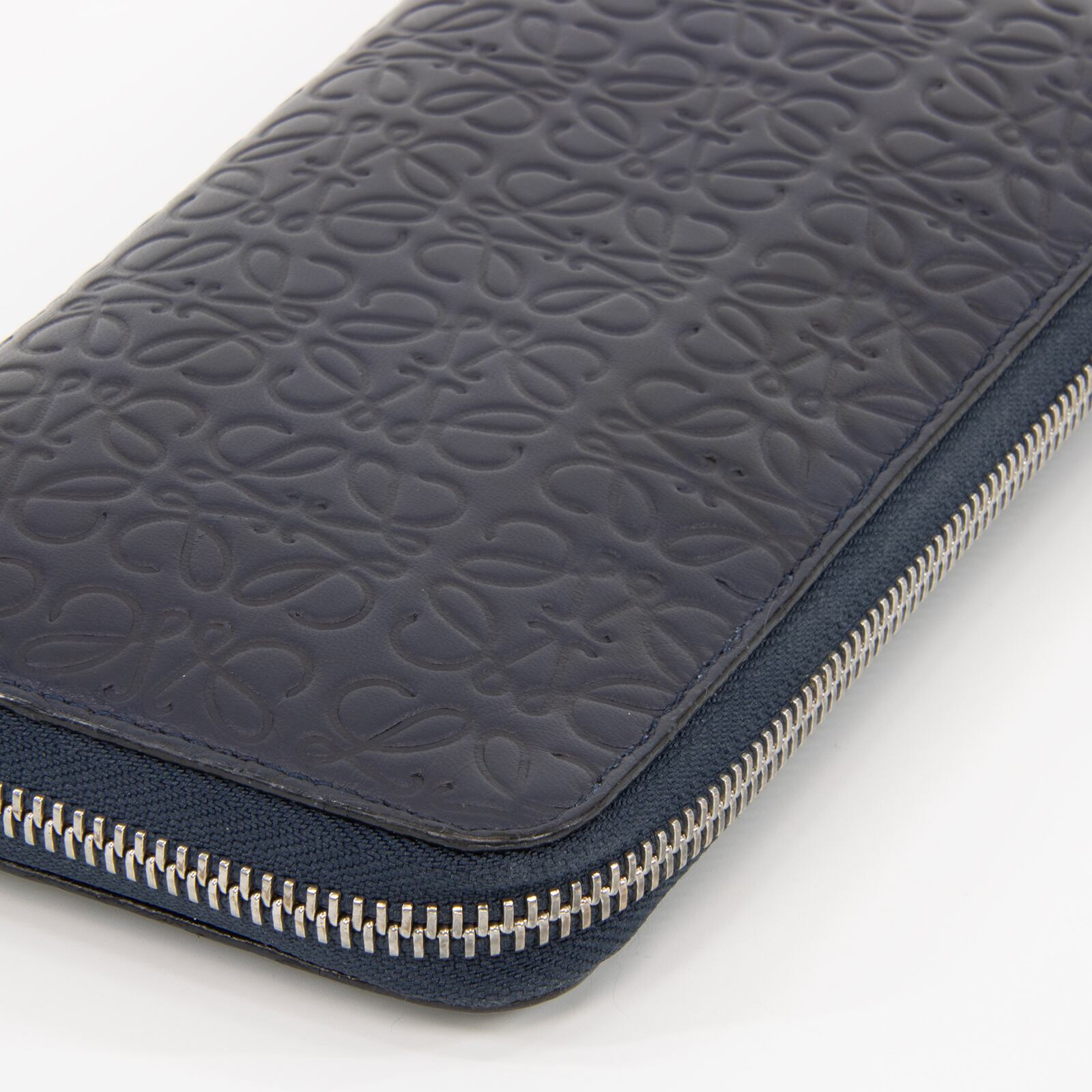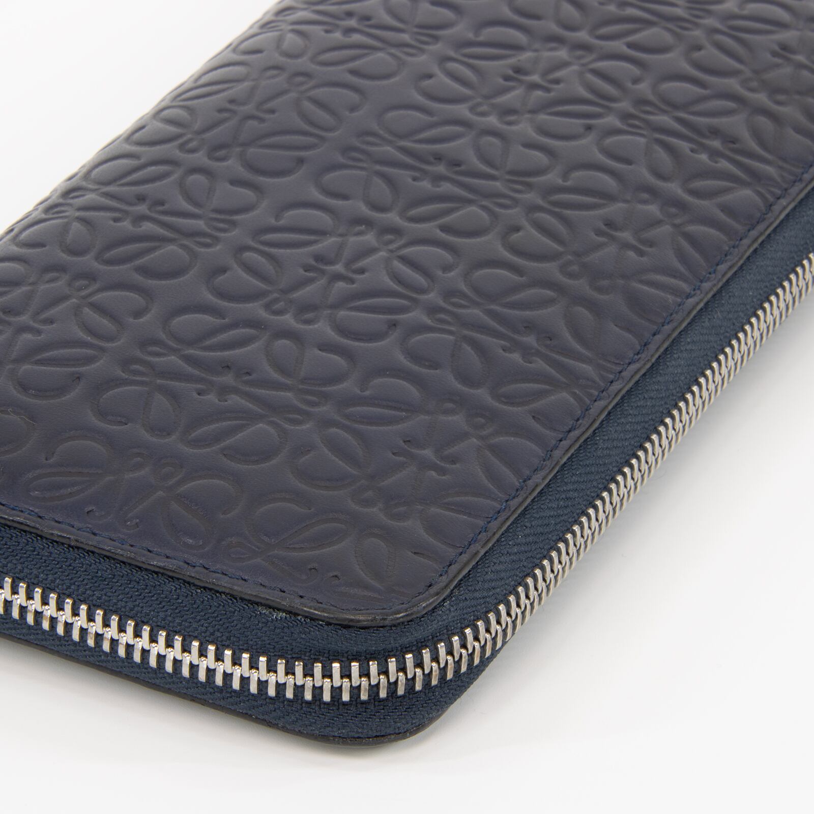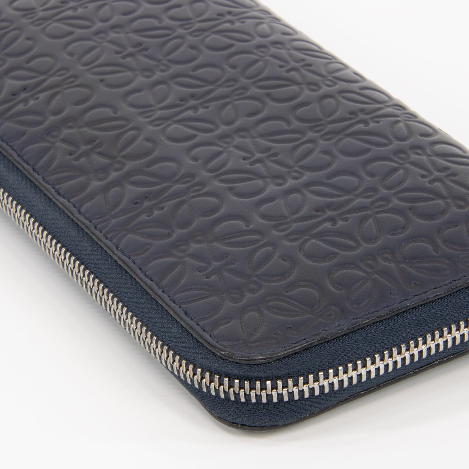 リピートはロエベのブランドロゴであるアナグラムを、いくつも組み合わせてモノグラム調にエンボス加工したラインで、最高級カーフスキンに繊細なタッチで型押しされたこちらの財布は、エレガントで高級感溢れる逸品でございます。