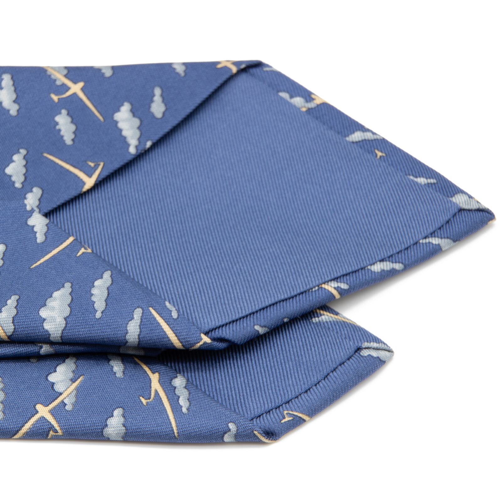 エルメスの小紋ネクタイの中でも大変希少なモデルで、空を駆け抜ける飛行機と雲が全体的にあしらわれており、爽やかで清涼感があるデザインで、最高級シルクのふっくらとした柔らかい肌触りと光沢が相まって、洗練された美しさと存在感にうっとりさせられます。