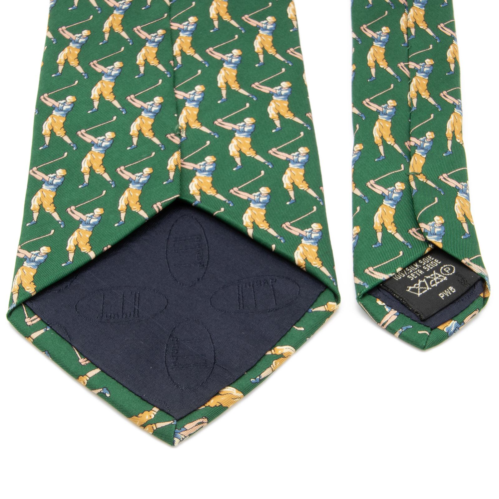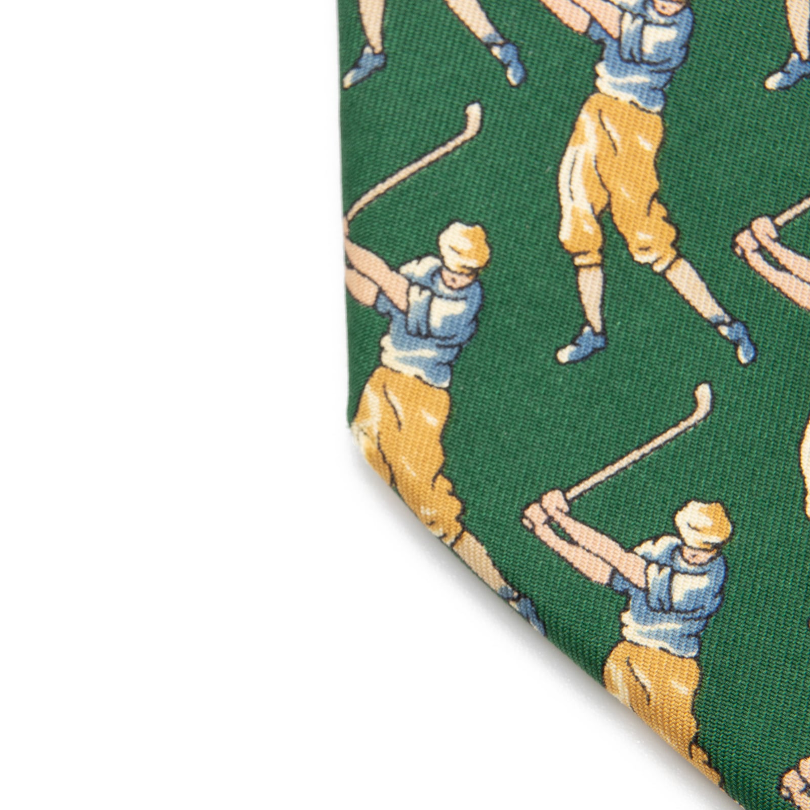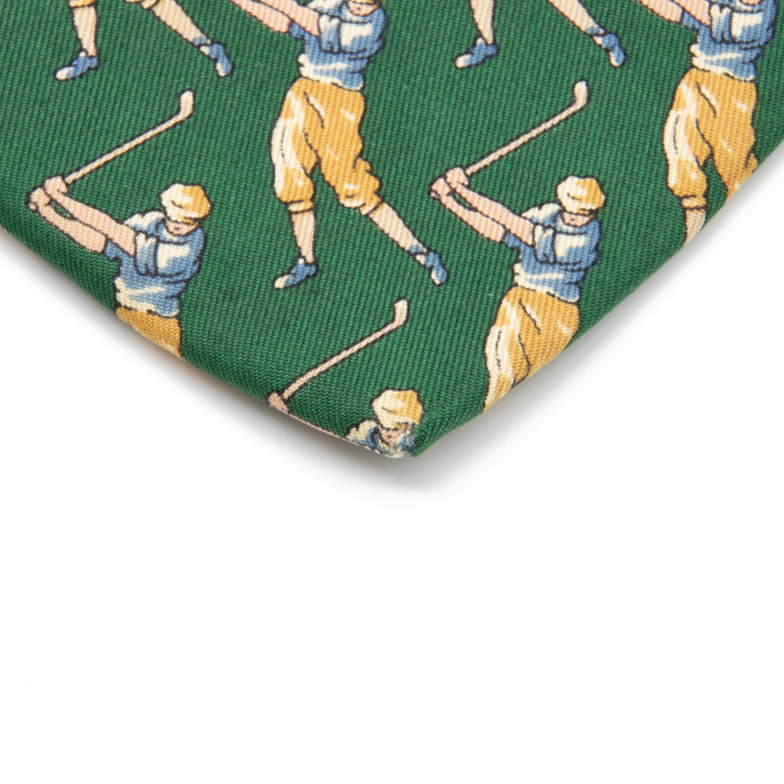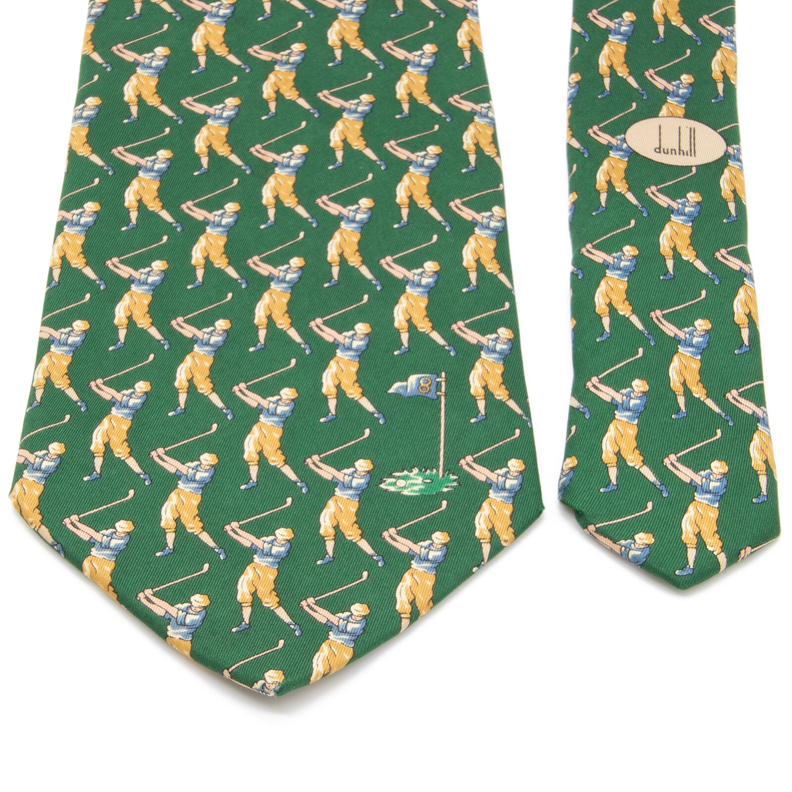 ダンヒルの小紋ネクタイの中でも大変希少なモデルで、大剣の表には8番フラッグとカップ、ネクタイの全面には今まさにスイングしようとするゴルファーがあしらわれており、最高級シルクのふっくらとした柔らかい肌触りと光沢が相まって、洗練された美しさと存在感にうっとりさせられます。
