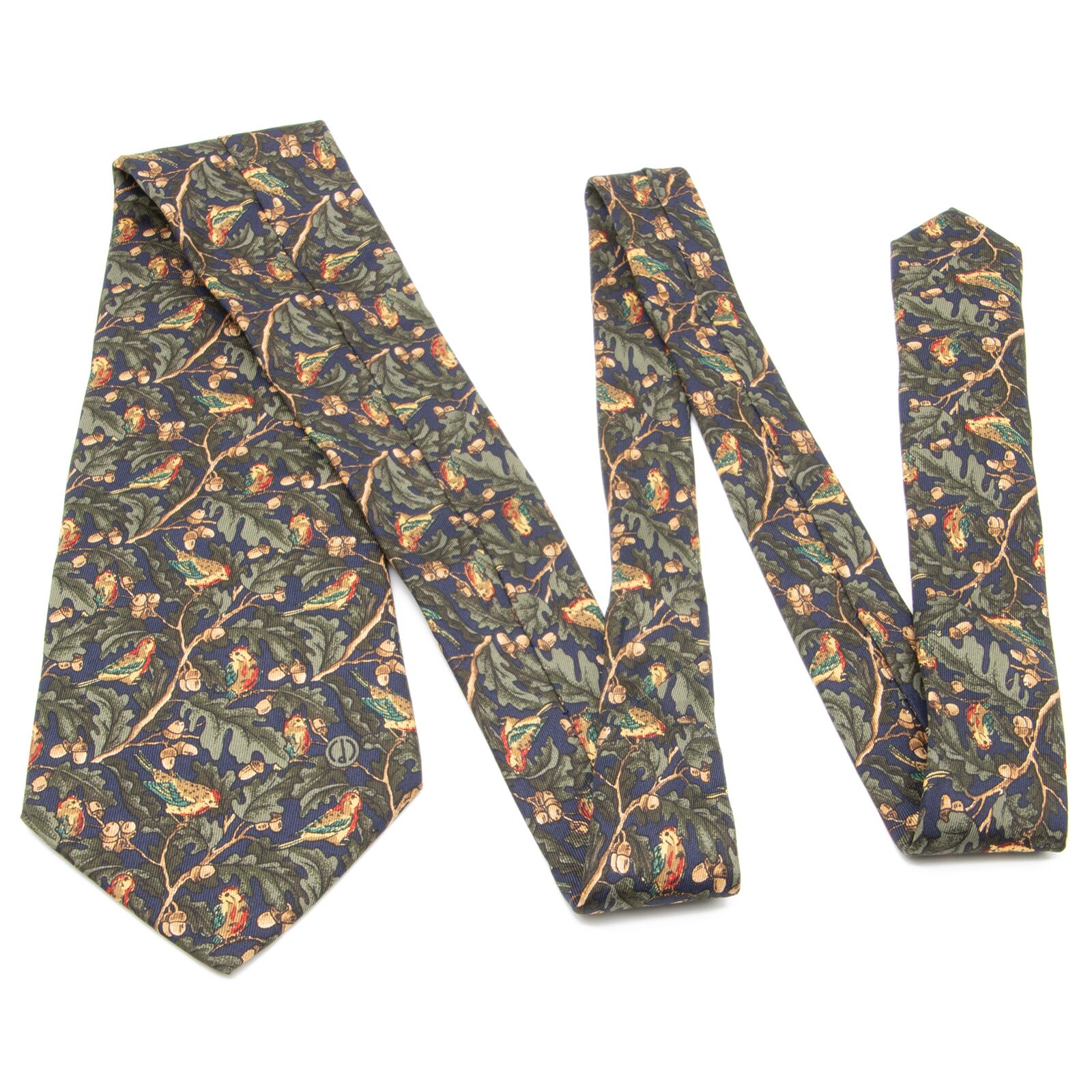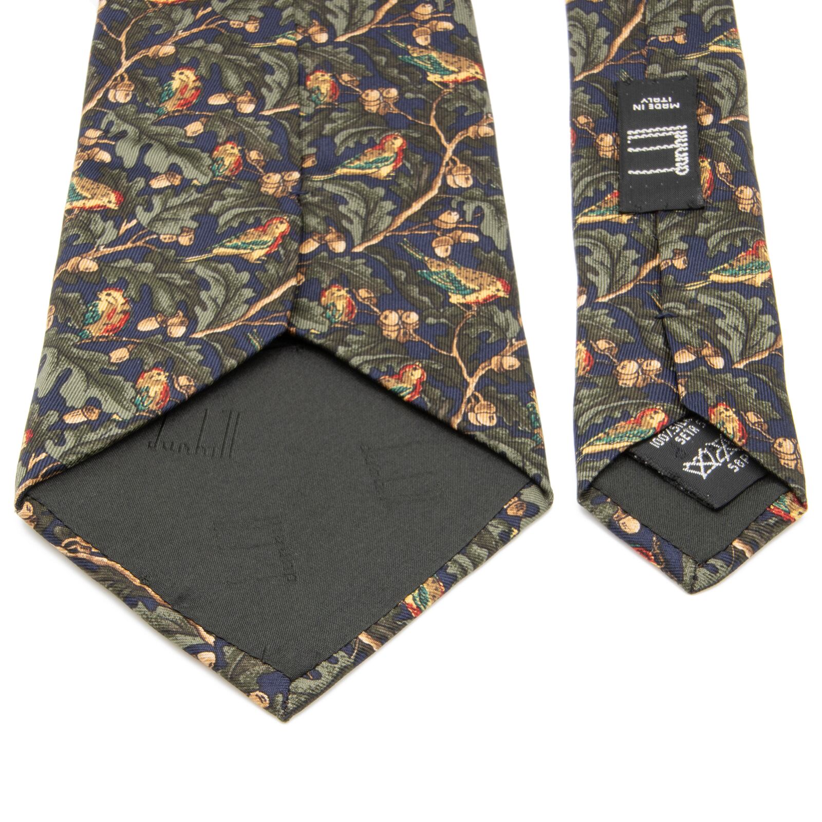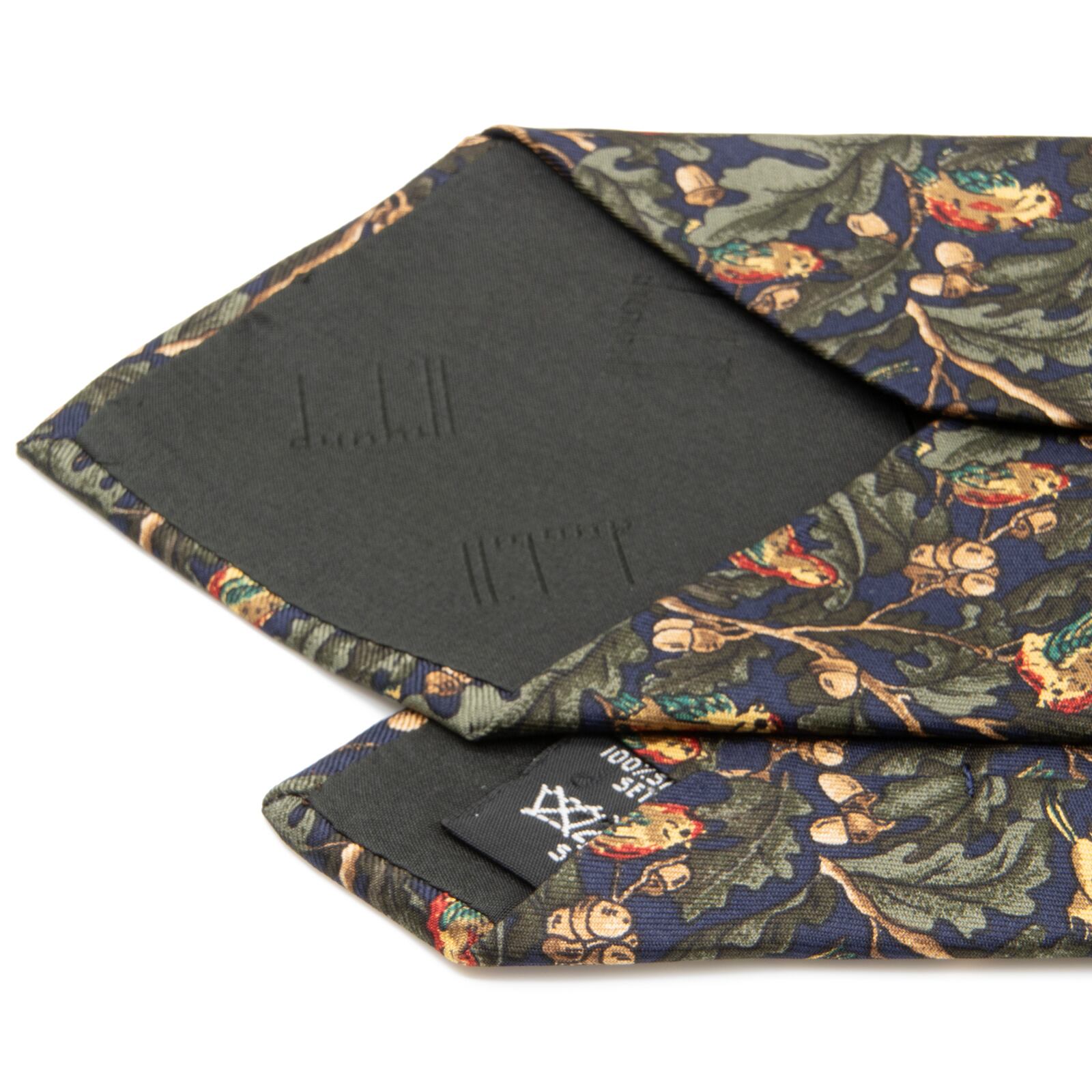ダンヒルのオールオーバーネクタイの中でも大変希少なモデルで、その中でも新品同様のものはさらにとても珍しいです。ネクタイの全面に落ち着いた配色で、どんぐりの木とアカゲラのような鳥があしらわれており、最高級シルクのふっくらとした柔らかい肌触りと光沢が相まって、洗練された美しさと存在感にうっとりさせられます。
