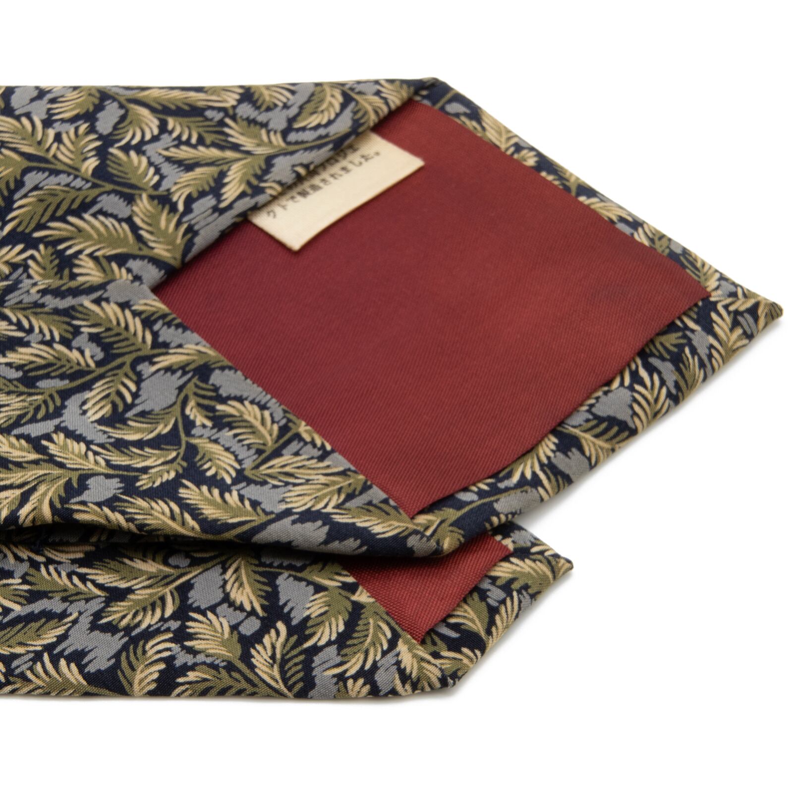 ワイエヌケー セレス ニューヨークのエスニックパターンネクタイの中でも大変希少なモデルで、落ち着いた配色で葉が全面にあしらわれており、最高級シルクのふっくらとした柔らかい肌触りと光沢が相まって、洗練された美しさと存在感にうっとりさせられます。