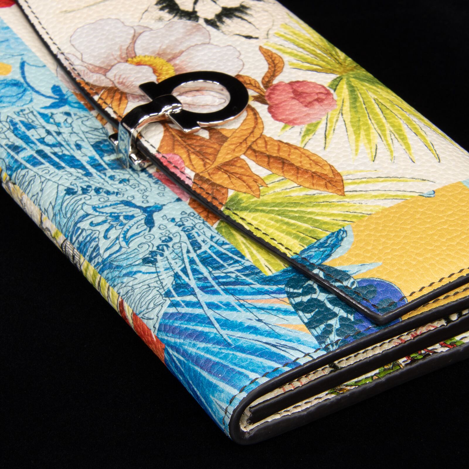 本物 送料無料 フェラガモ 長財布 二つ折り財布 レディース ガンチーニ 白 青 黄色 赤 茶色 革 レザー 草花 チェーン 綺麗 G081