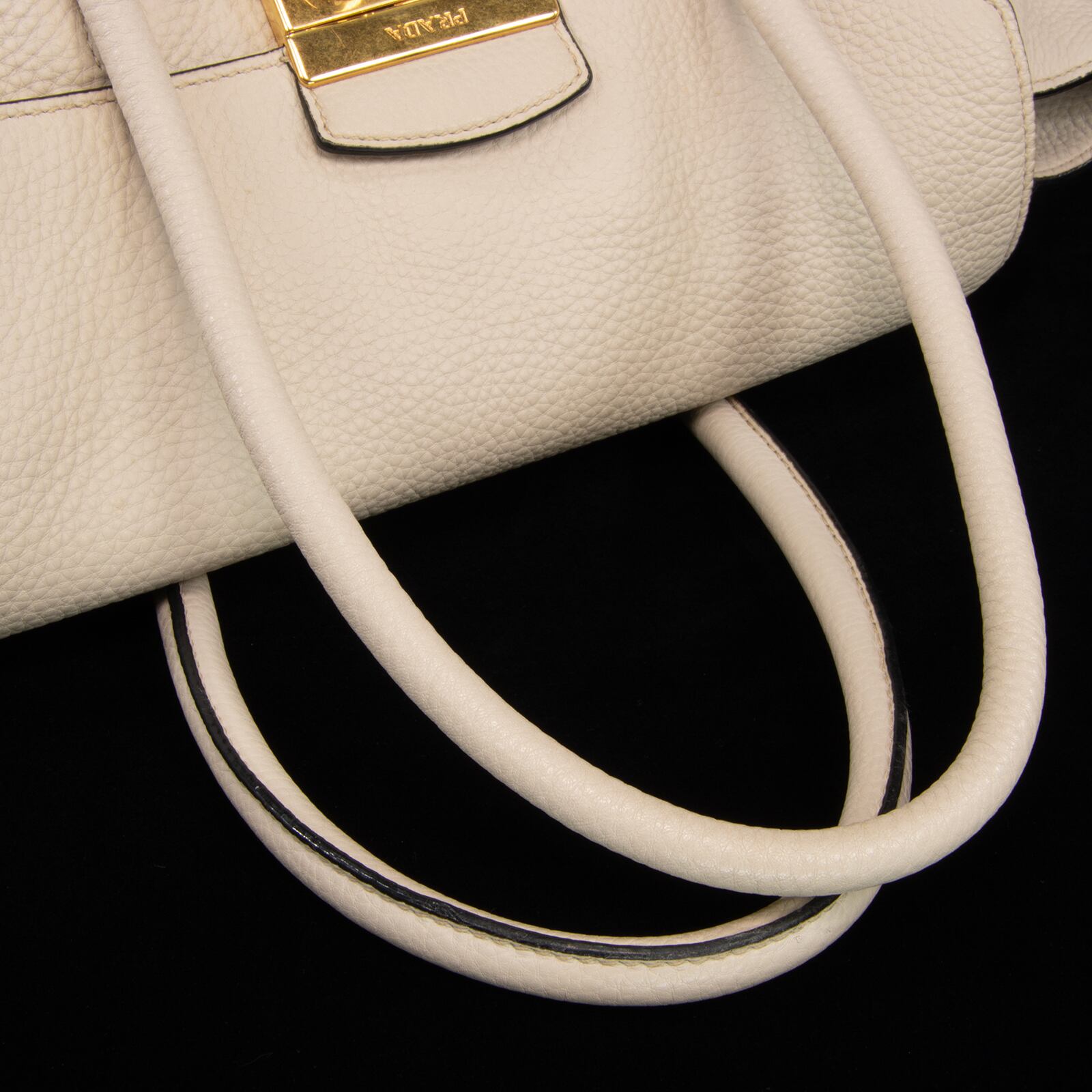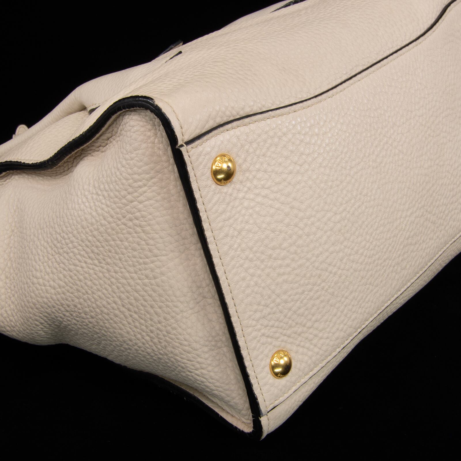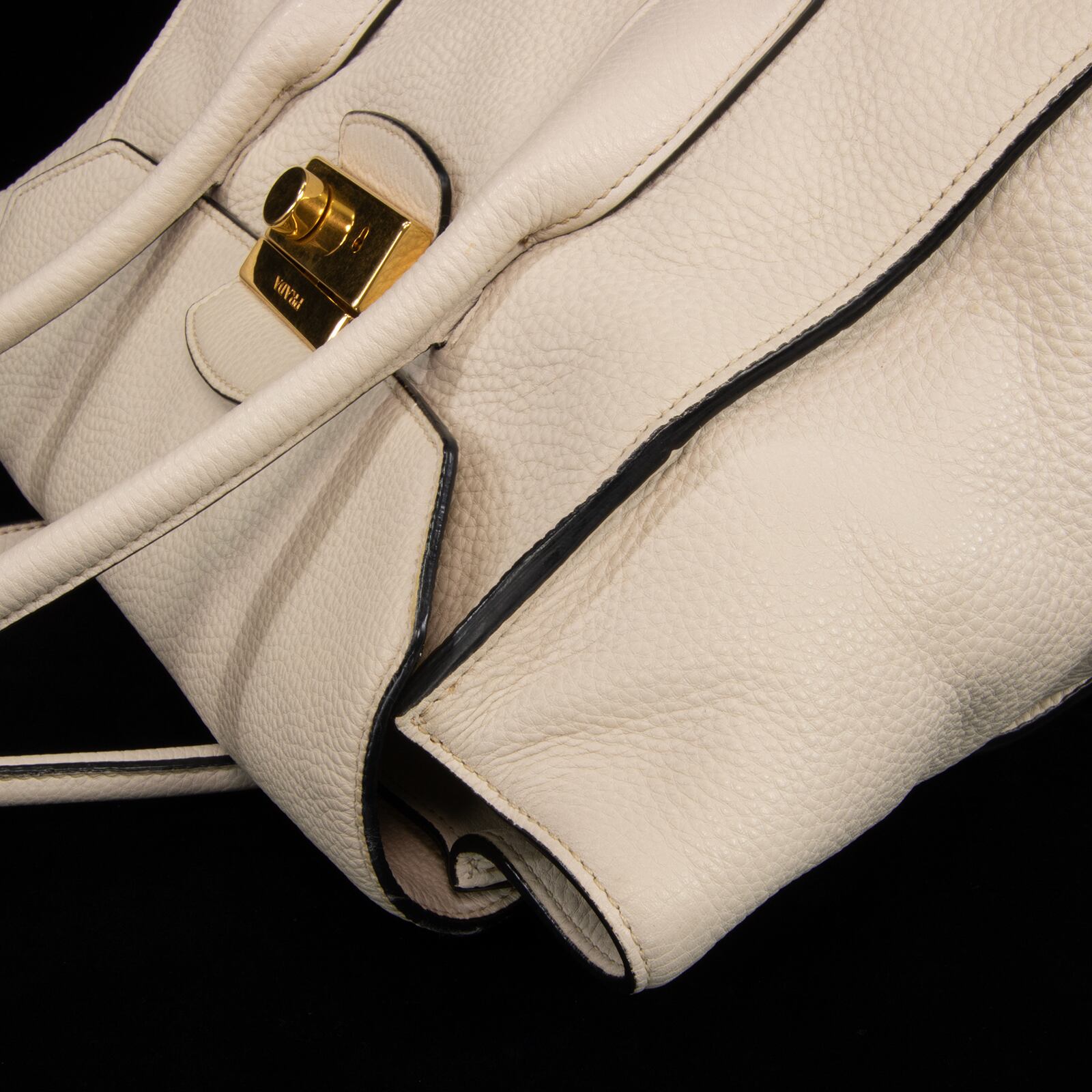 伝統製法で鞣した最高級子牛革をあしらっており、細部までシワがヴィンテージ風に仕上げられ、エレガンスで洗練された印象のホワイトカラーの子牛革・前面などのPRADAのロゴと相まって、一目でプラダとわかる存在感とただならぬ雰囲気にうっとりさせられます。