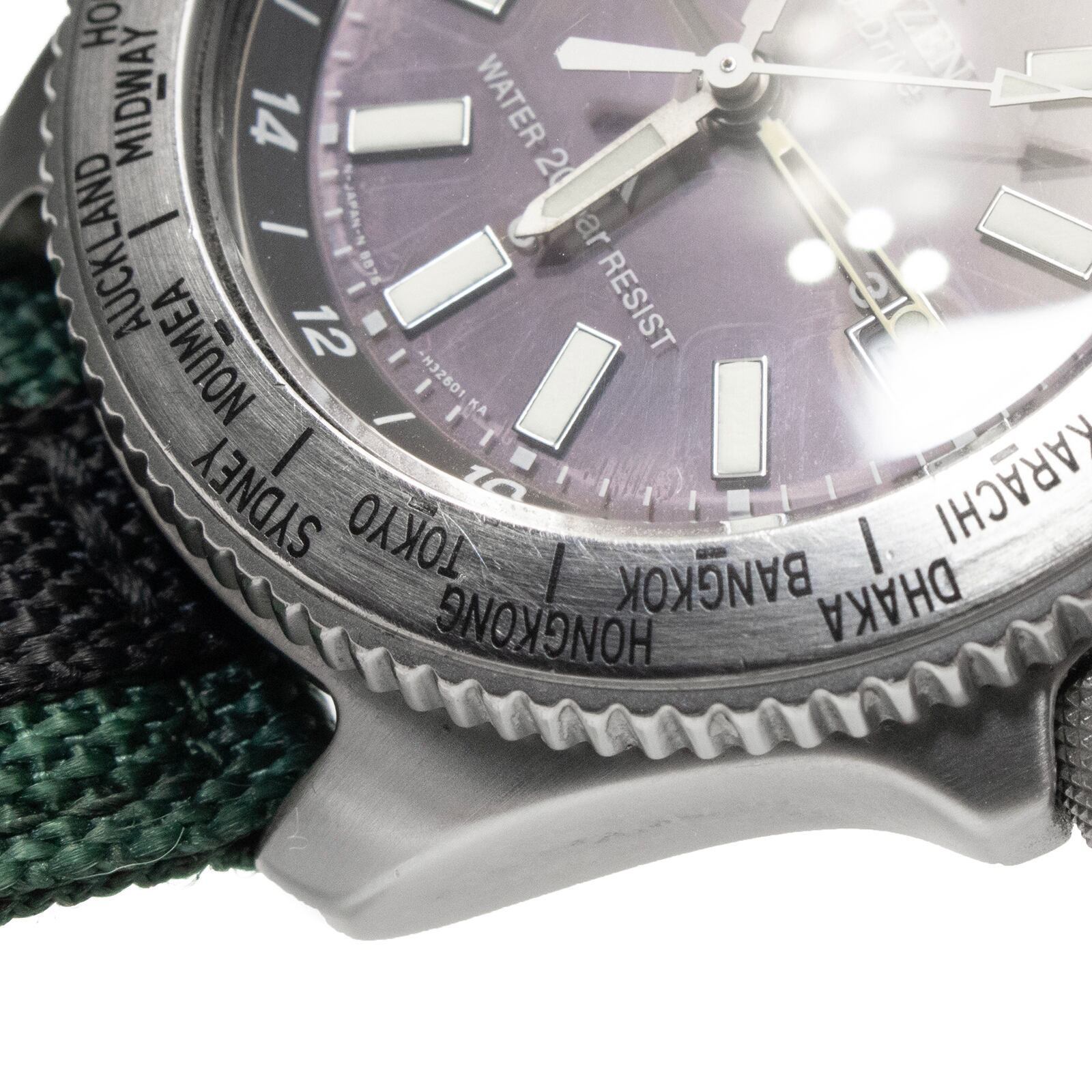 文字盤内部にくもり(中)、風防に薄擦れ(小)、社外ベルトに毛羽立ち(小)、使用感(中)