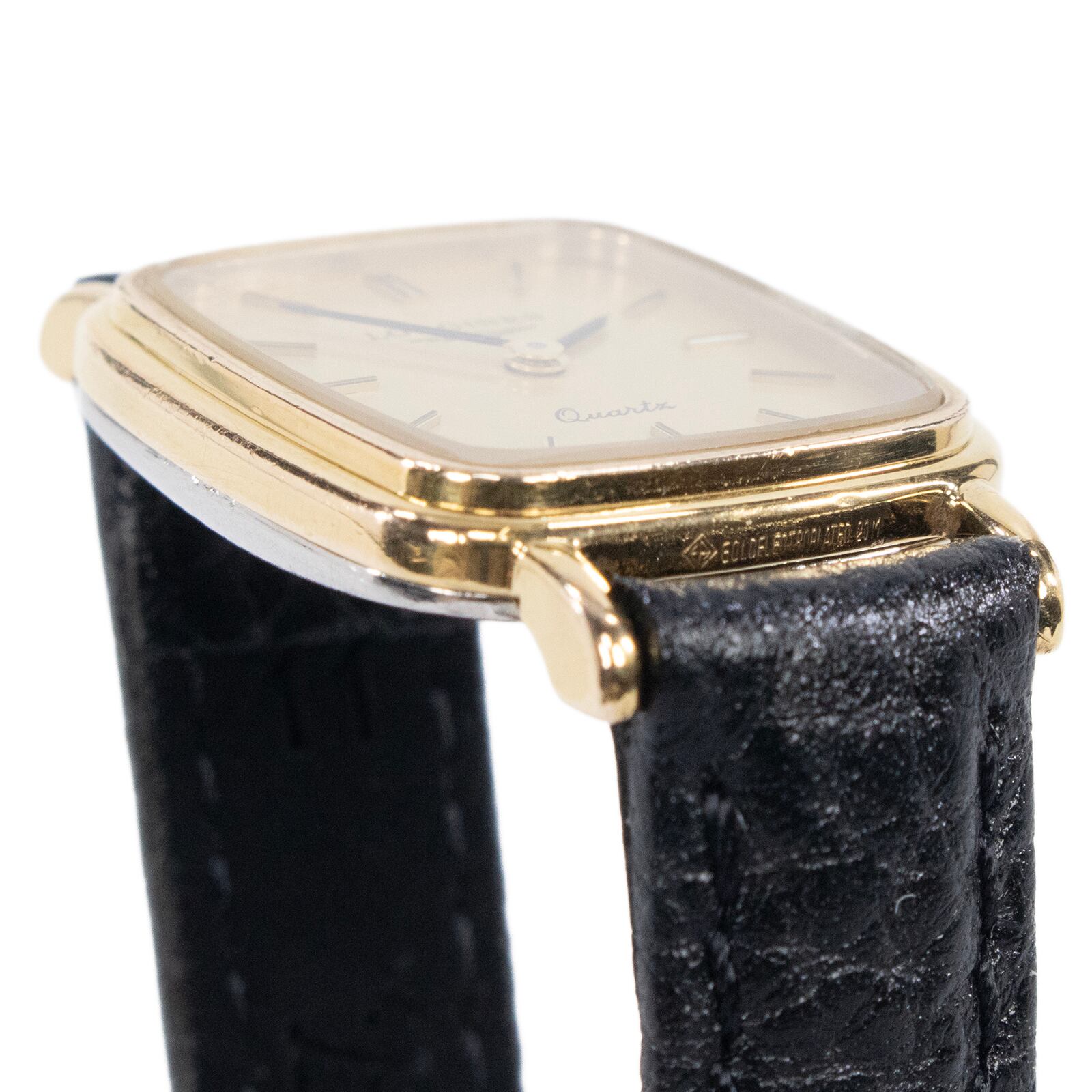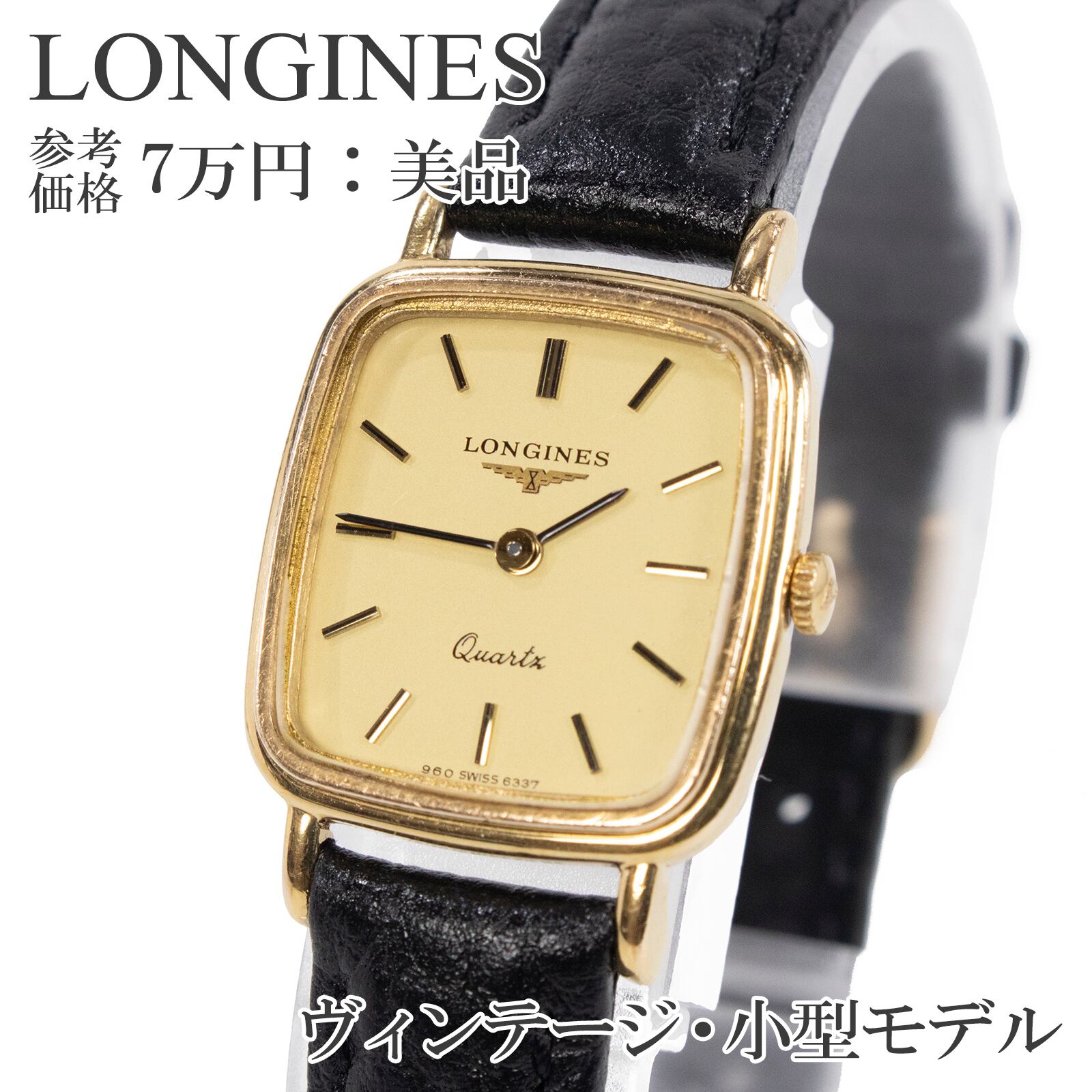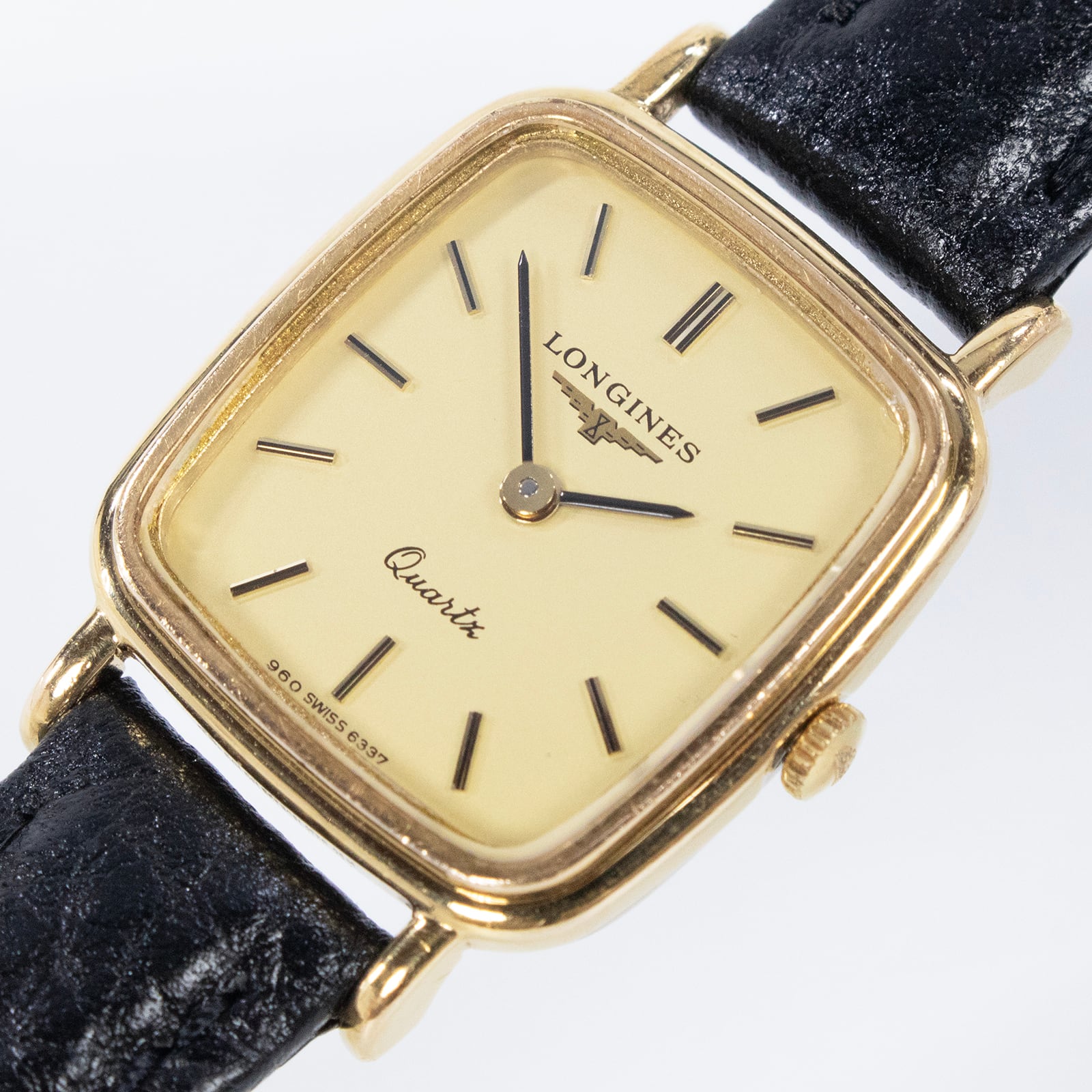 送料無料 ロンジン 腕時計 クォーツ レディース 黄色 ゴールド 黒 ヴィンテージ 珍しい ロゴ マーク 四角 スクエア 小型 小さめ 軽い X045