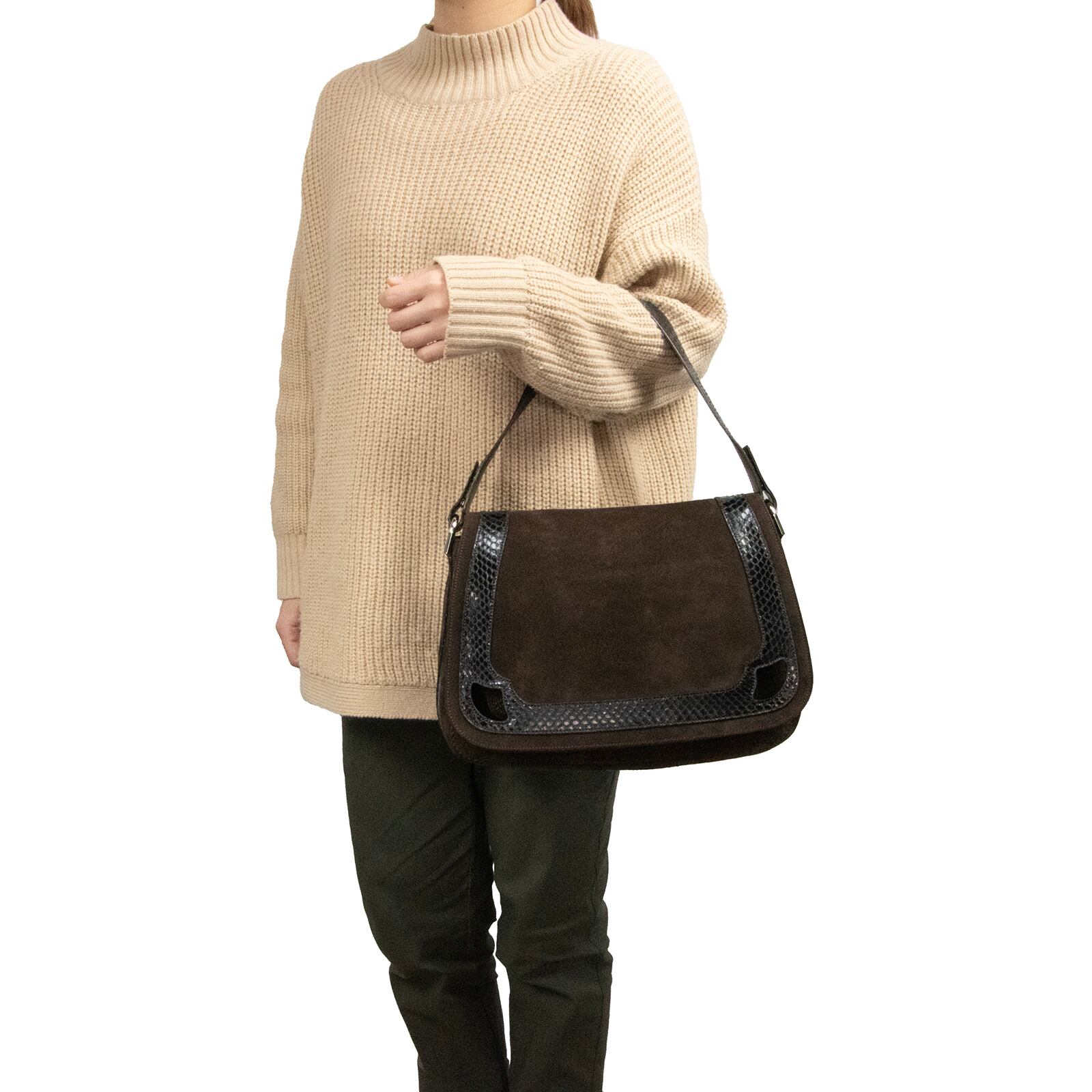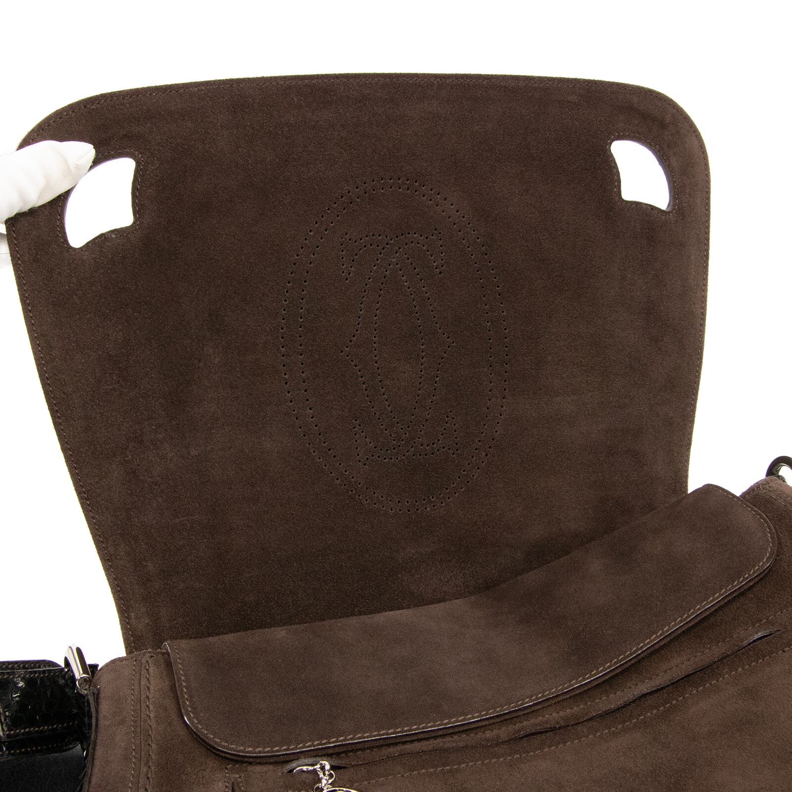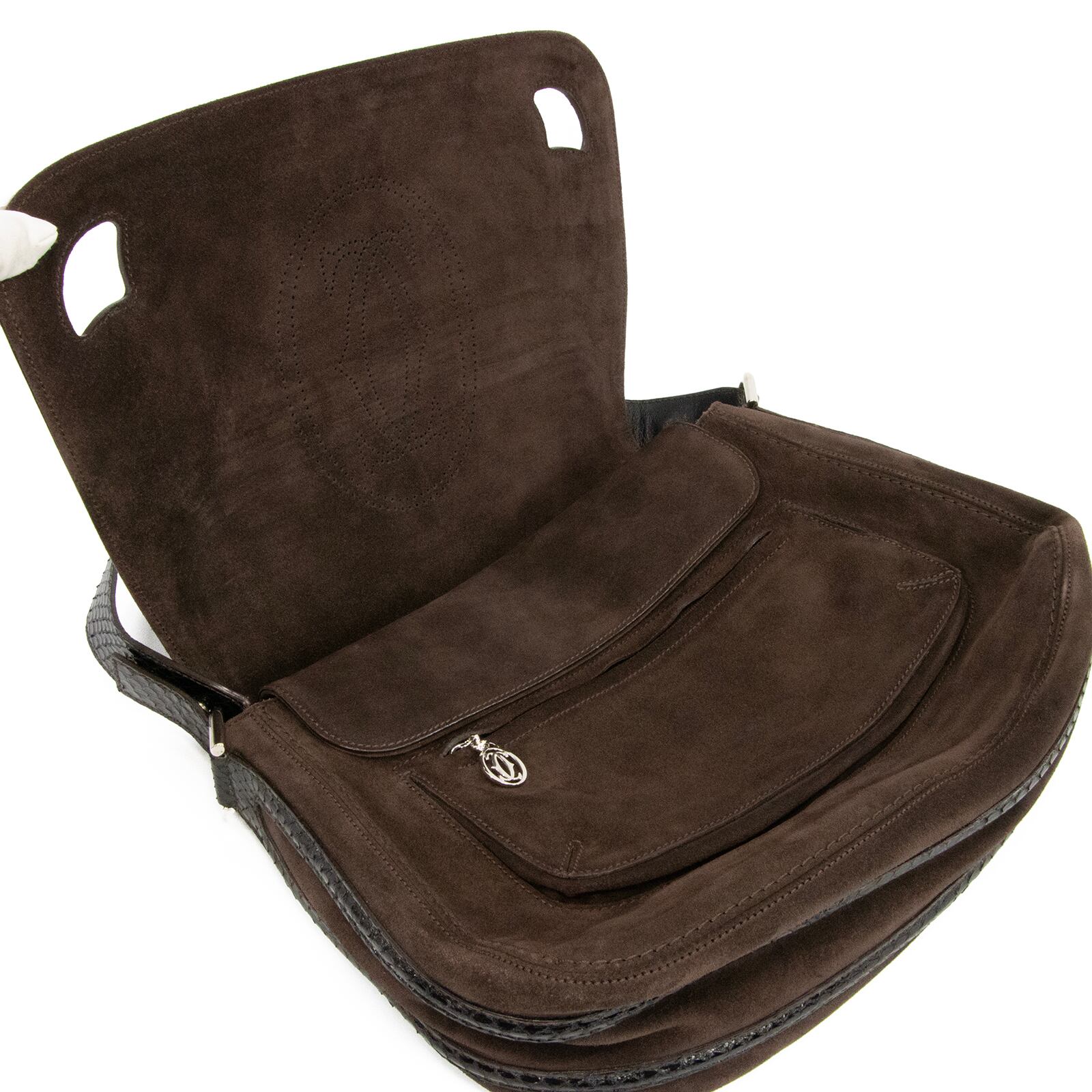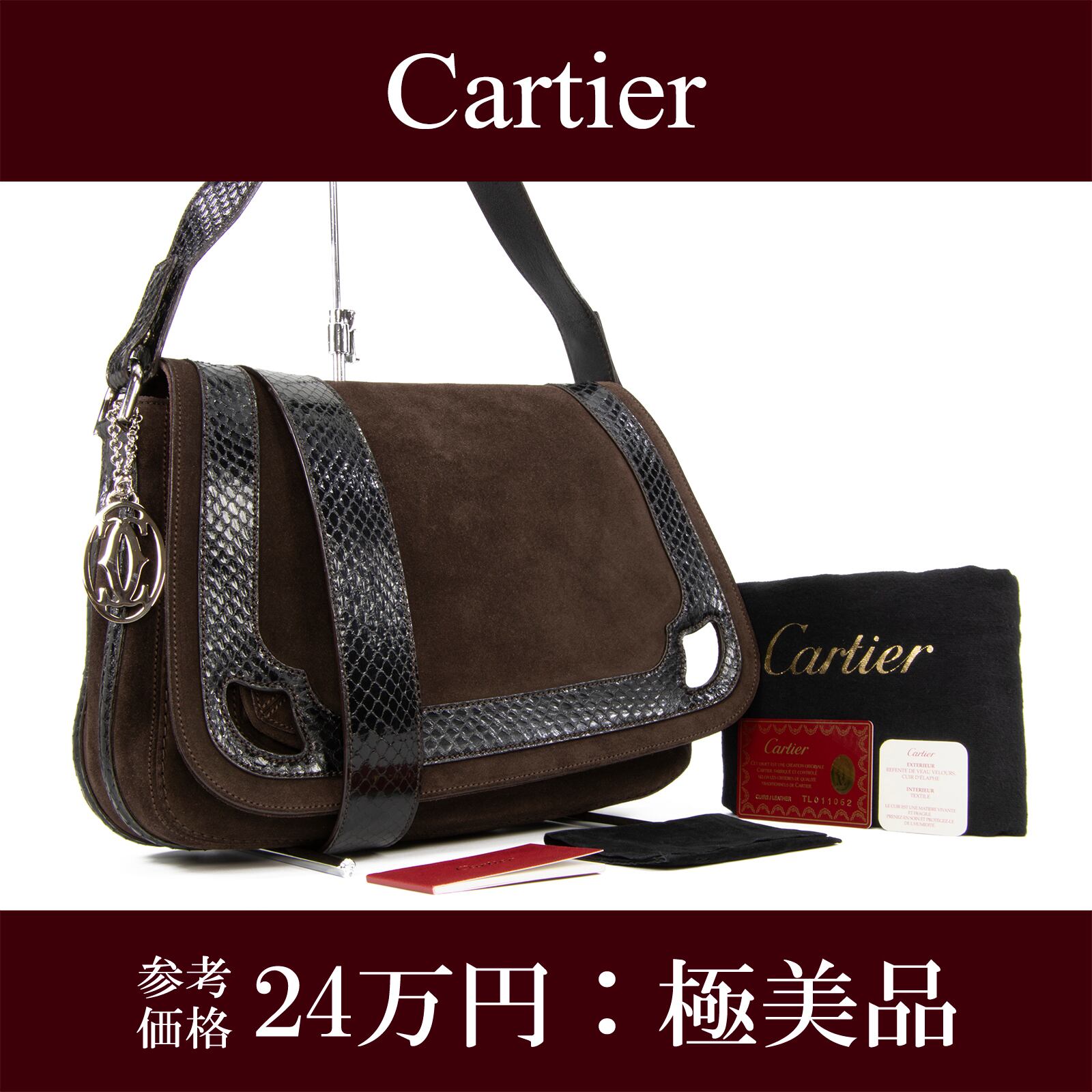 本物 送料無料 カルティエ 2WAYバッグ セミショルダーバッグ レディース パイソン スエード マルチェロドゥ 茶色 黒色 ロゴ マーク 綺麗 鞄 バック F212