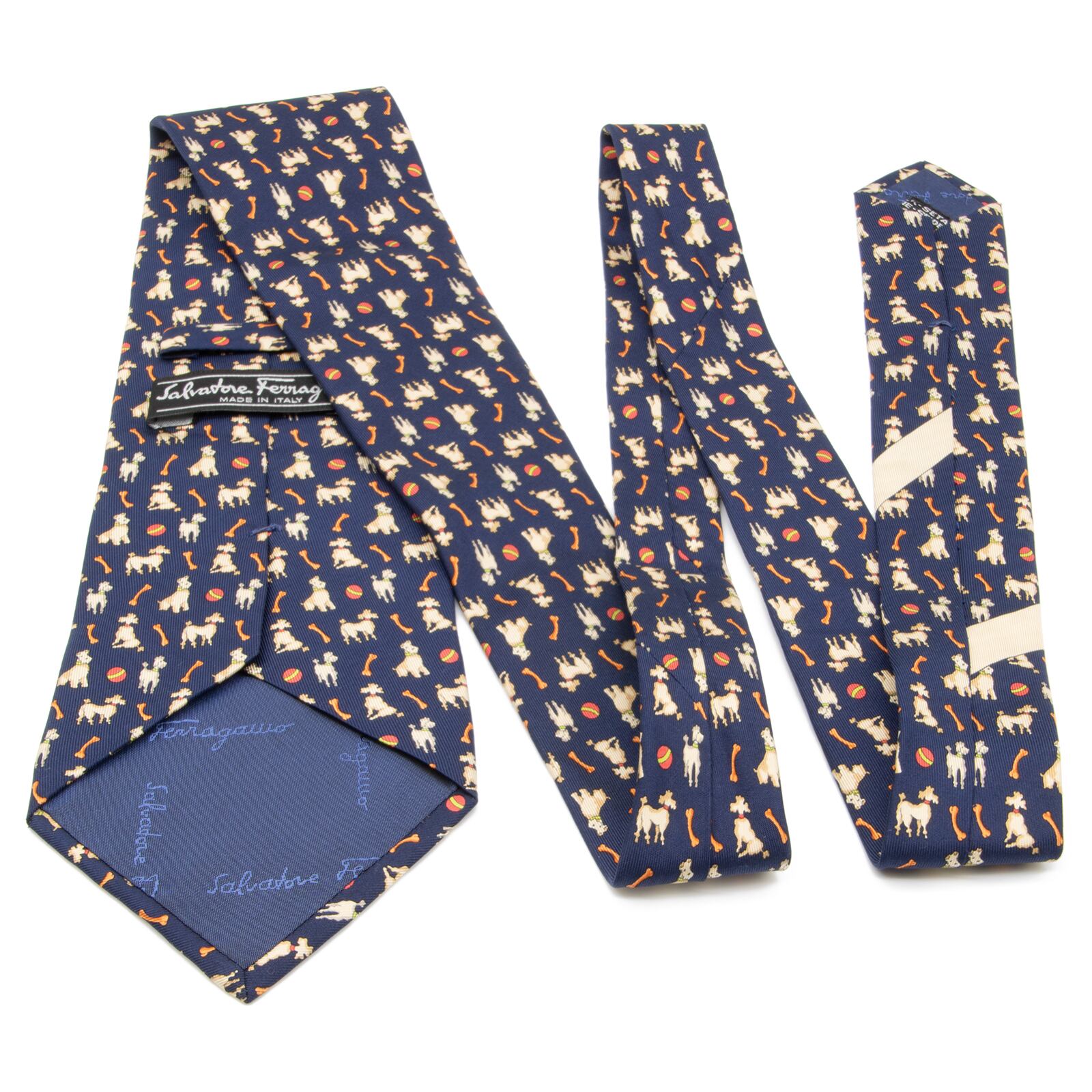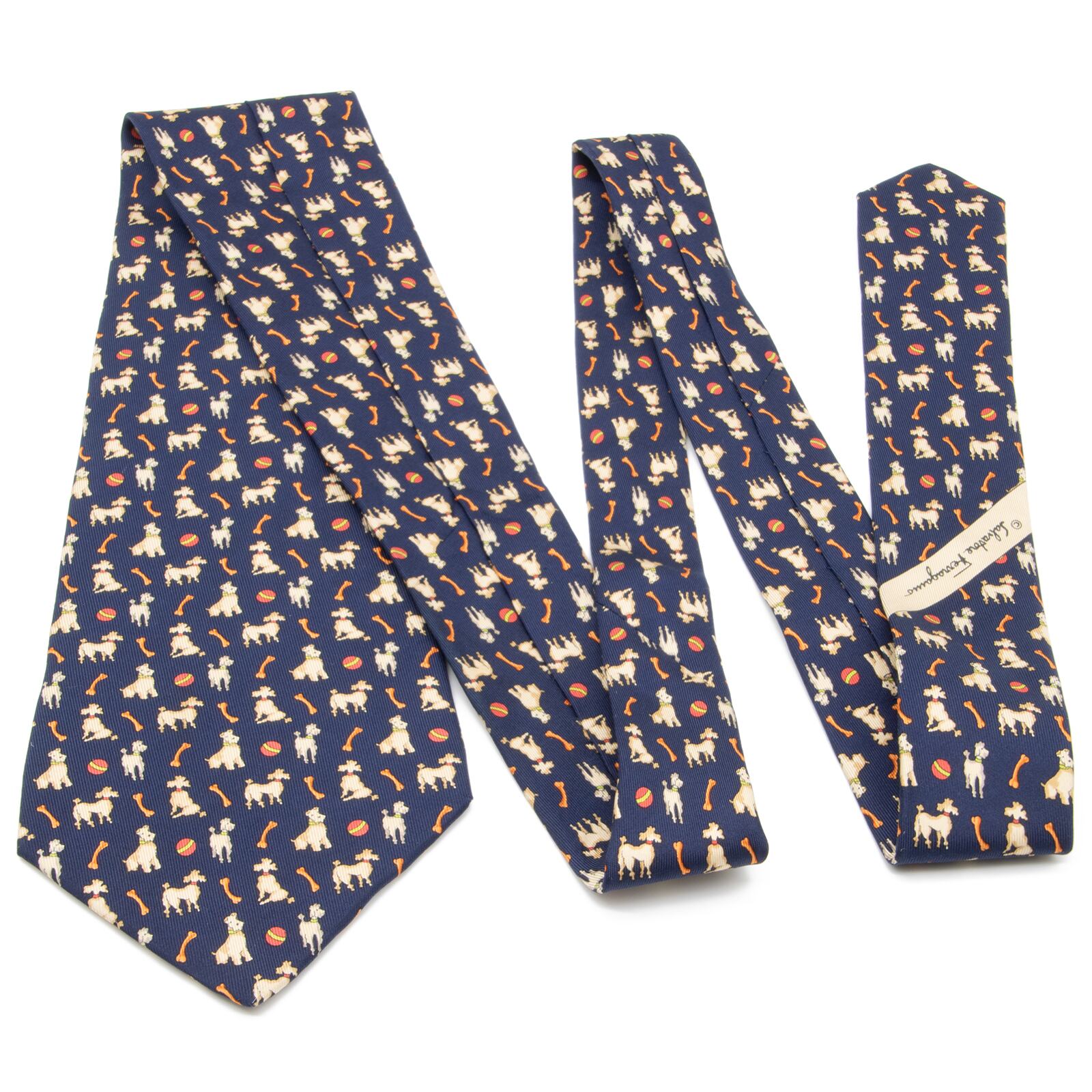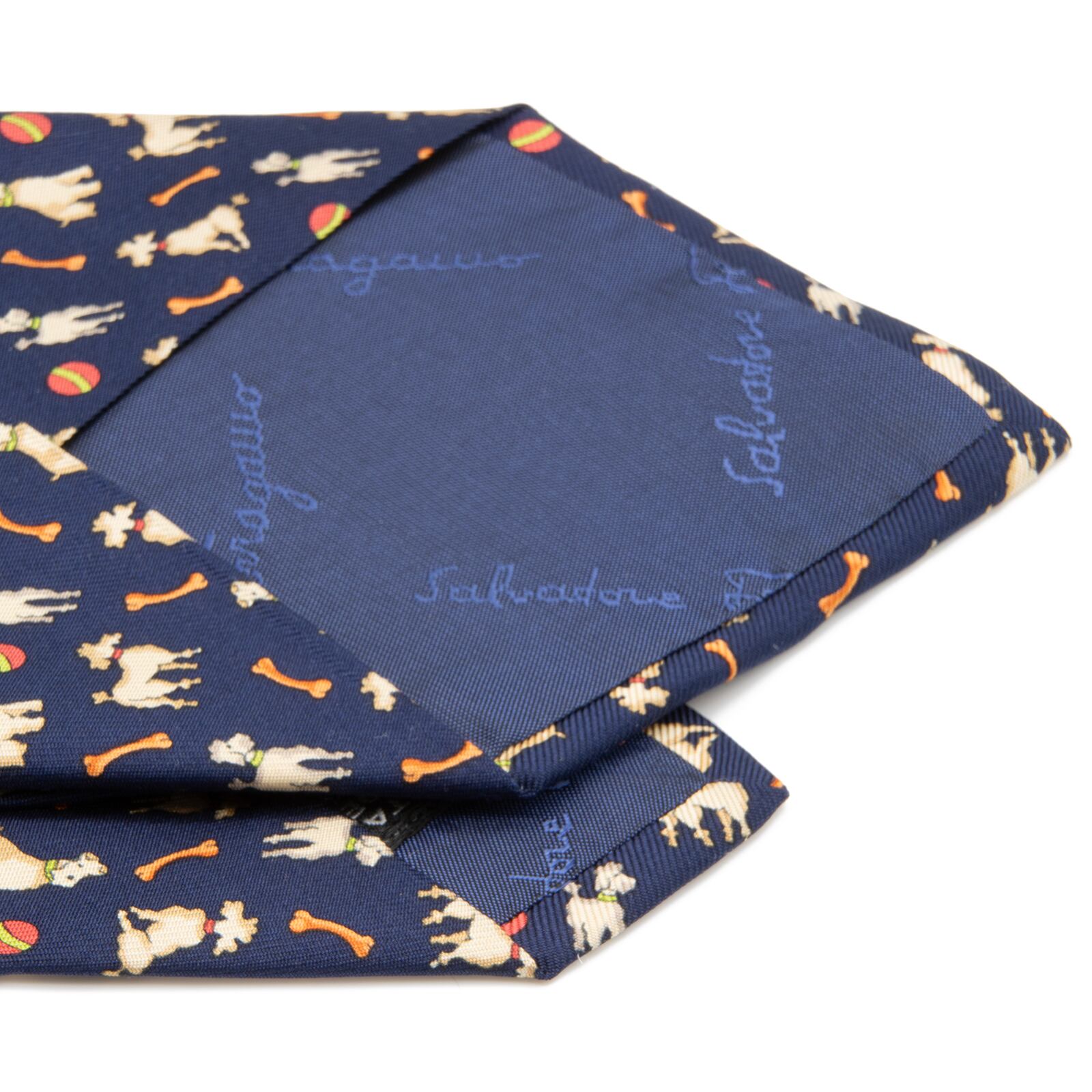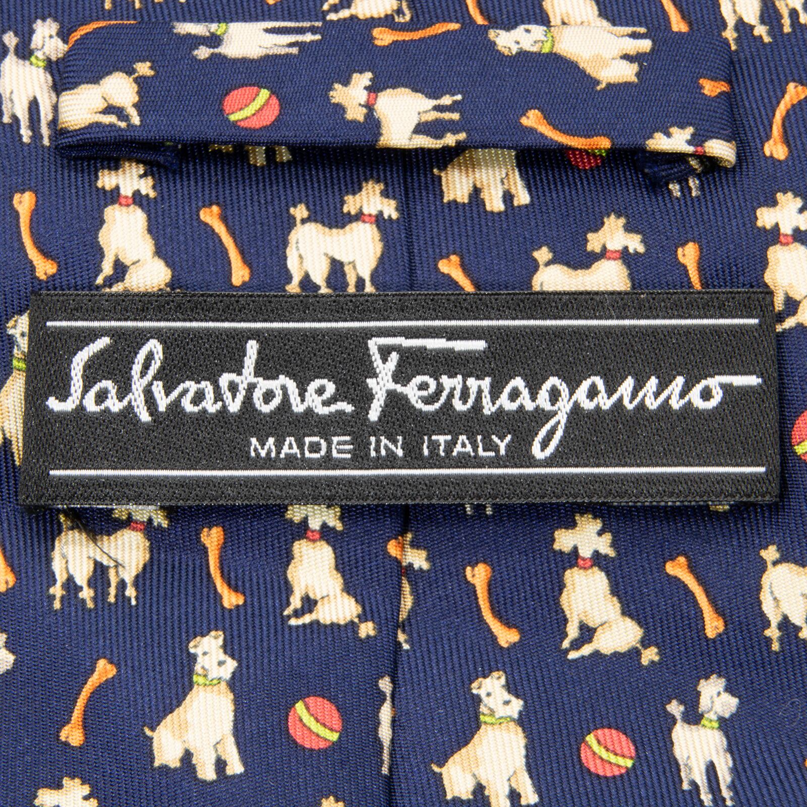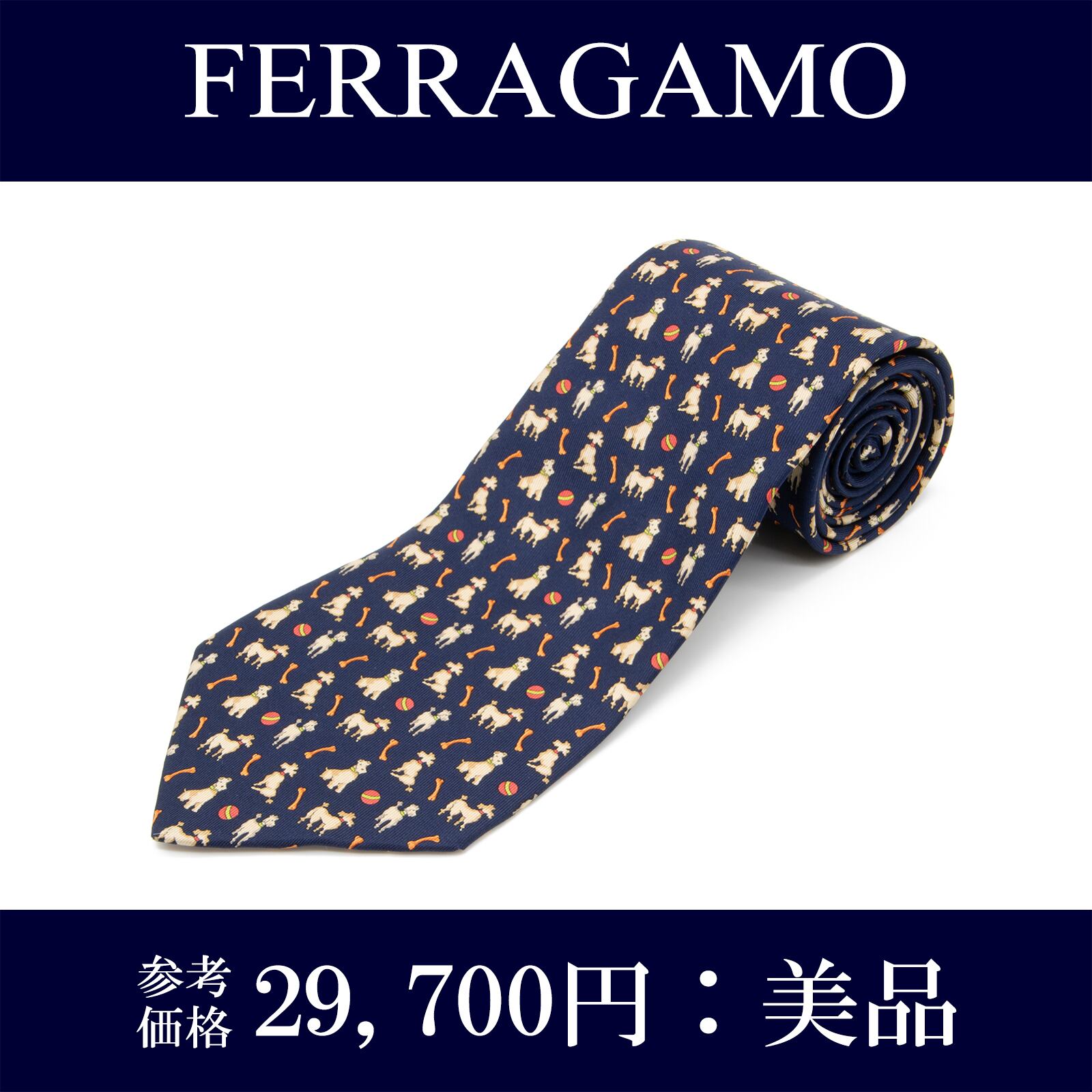 送料無料 フェラガモ ネクタイ ワイドタイ シルク ネイビーブルー オレンジ 赤 レッド ブランド 犬 アニマル 動物 かわいい レア 綺麗 N402