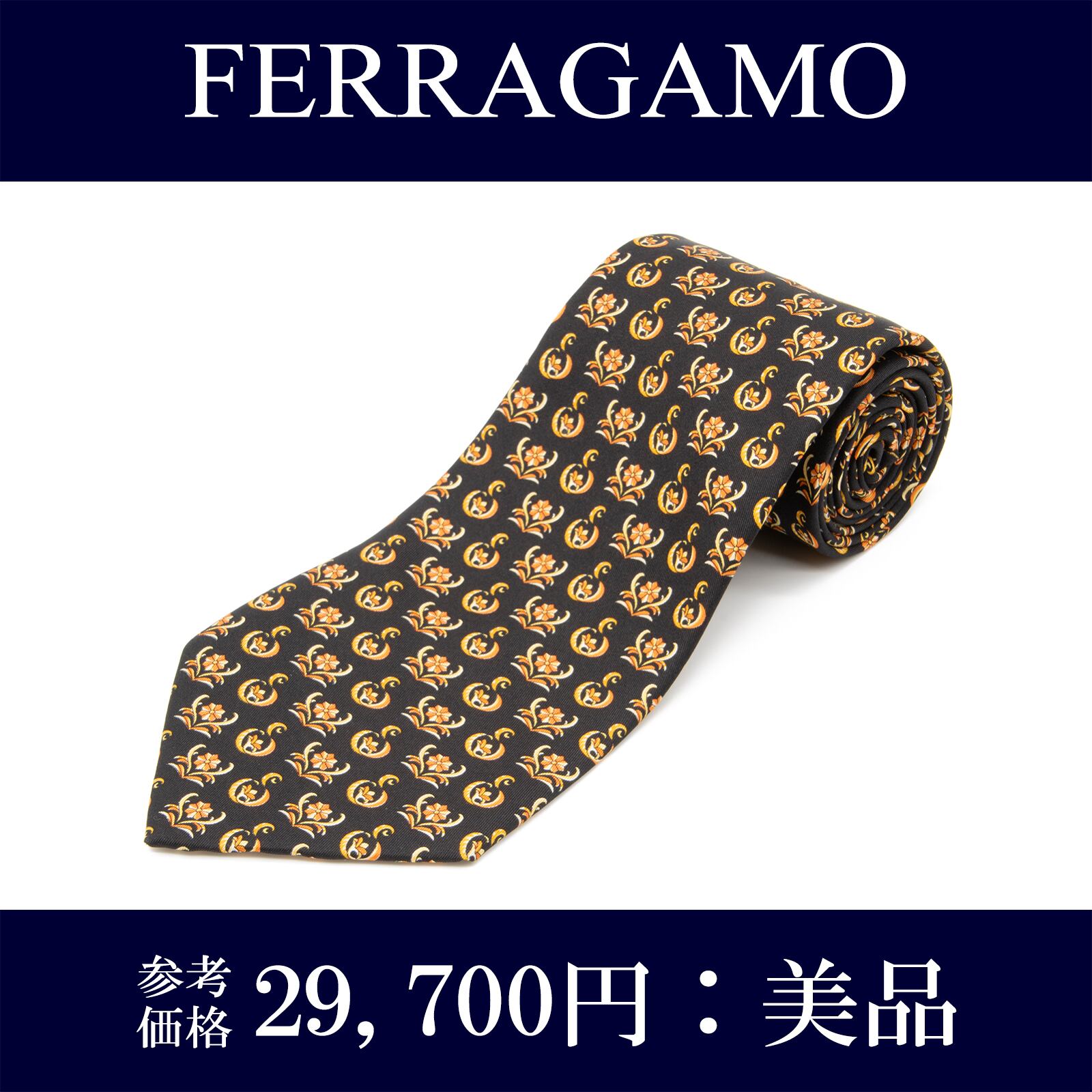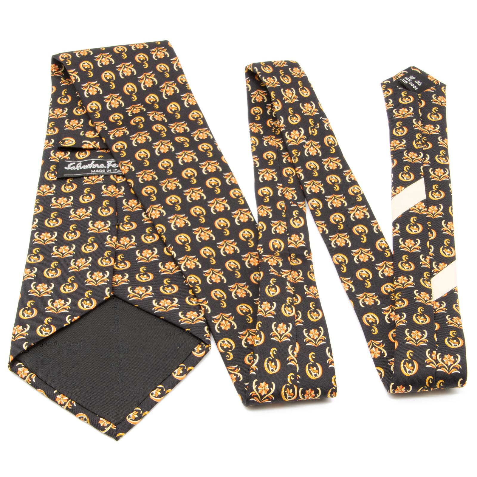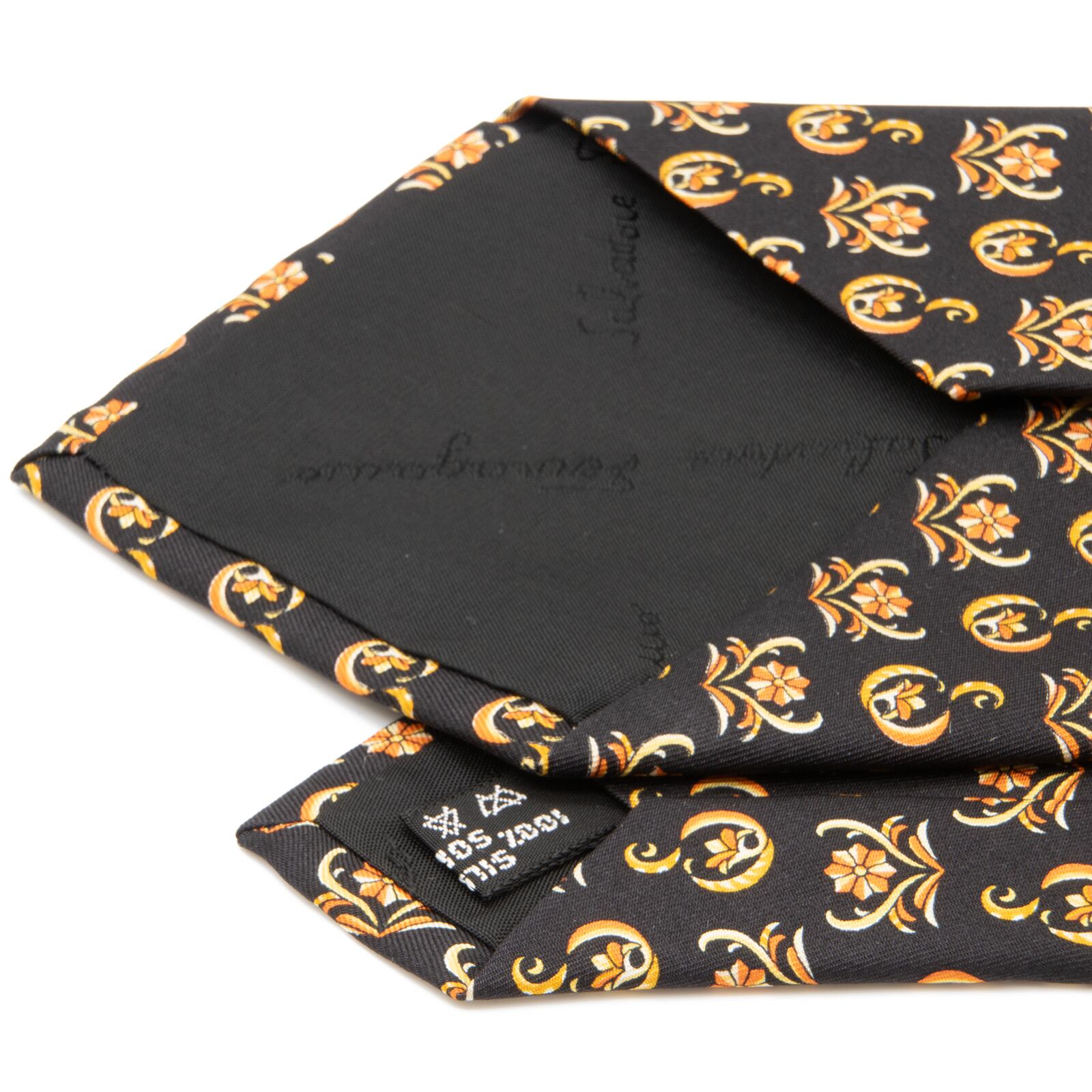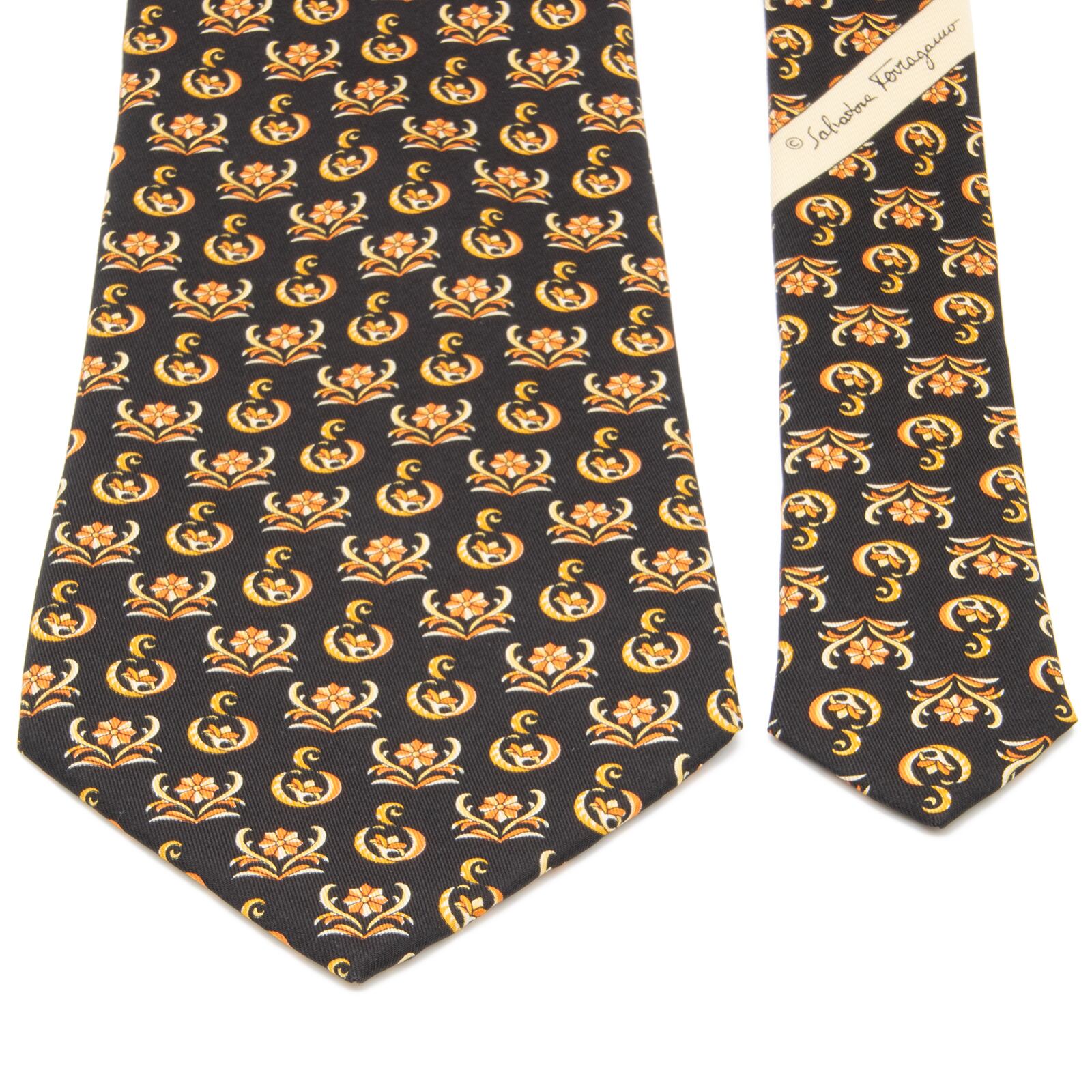 送料無料 フェラガモ ネクタイ ワイドタイ シルク 黒 ブラック 橙色 オレンジ 黄色 イエロー ビジネス カジュアル ブランド レア 綺麗 N430