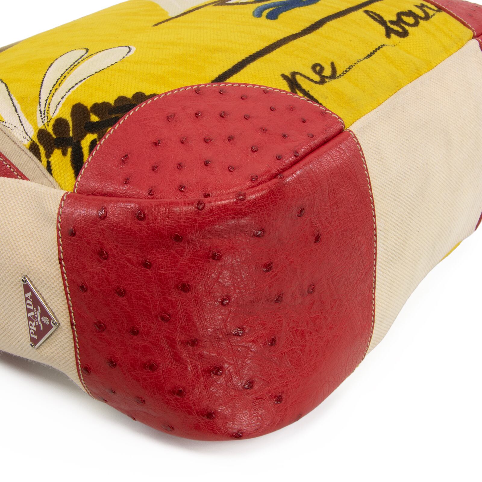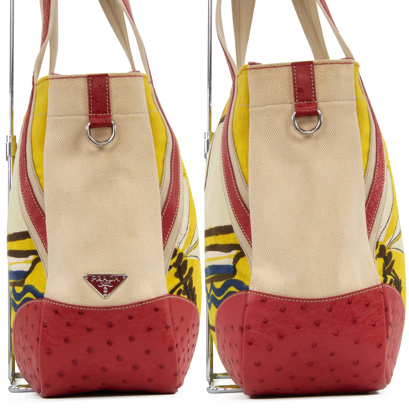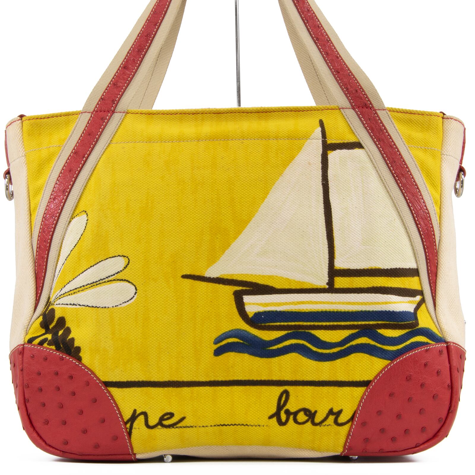 本物 送料無料 プラダ ハンドバッグ ボストンバッグ メンズ レディース オーストリッチ 赤 ベージュ 黄色 青 ヨット 海 夏 ロゴ 綺麗 L157