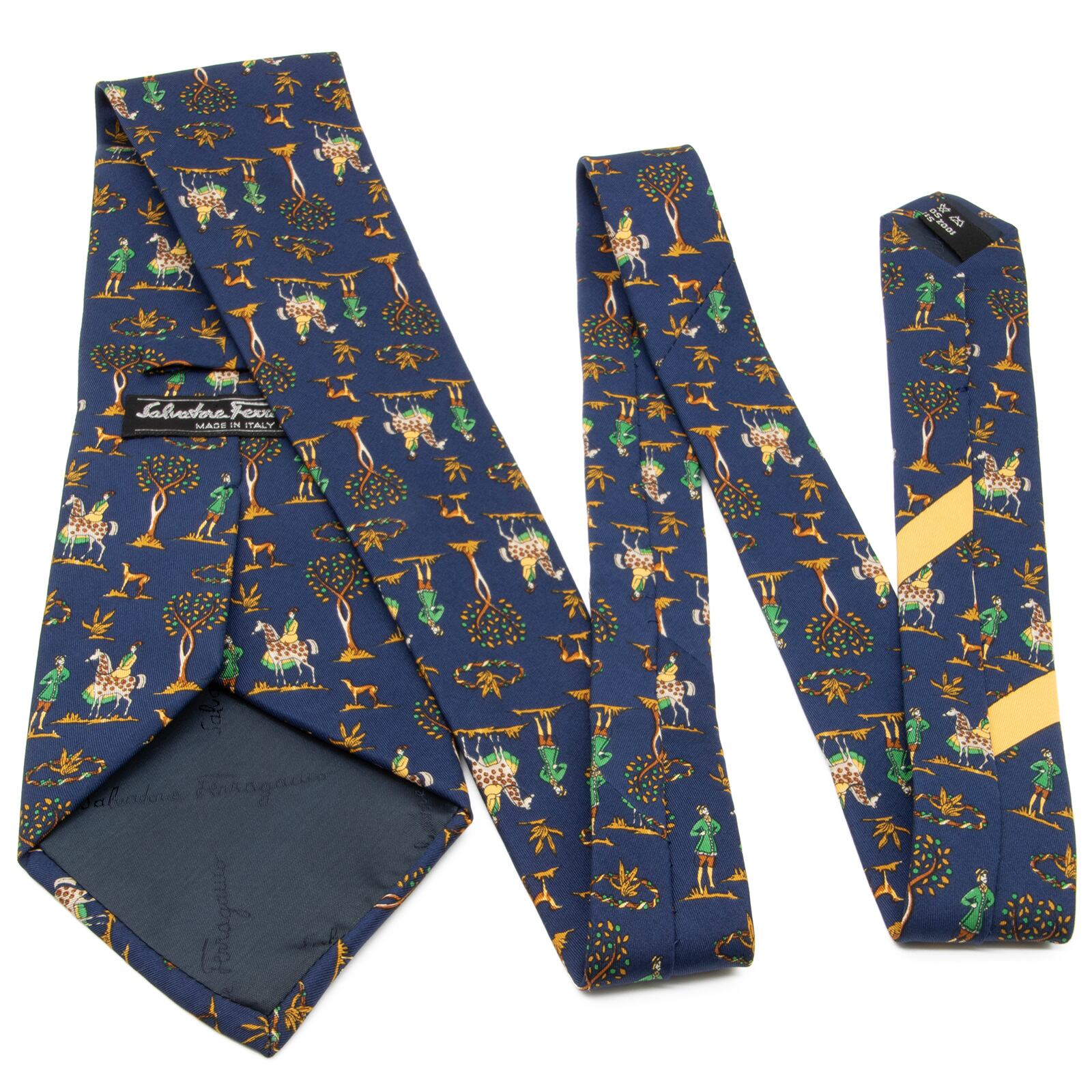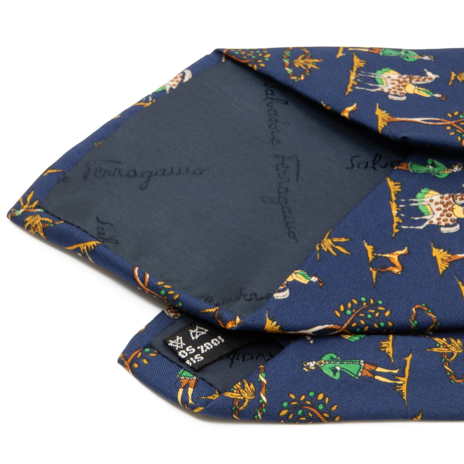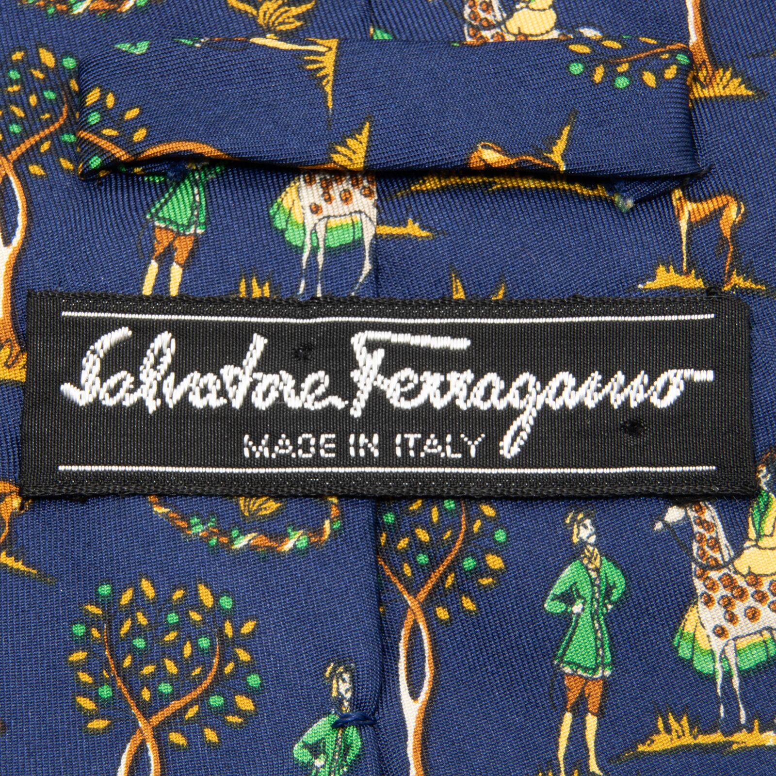 送料無料 フェラガモ ネクタイ ワイドタイ シルク 紺色 ネイビーブルー キャメル 緑色 グリーン ブランド 動物 キリン サバンナ 綺麗 N624
