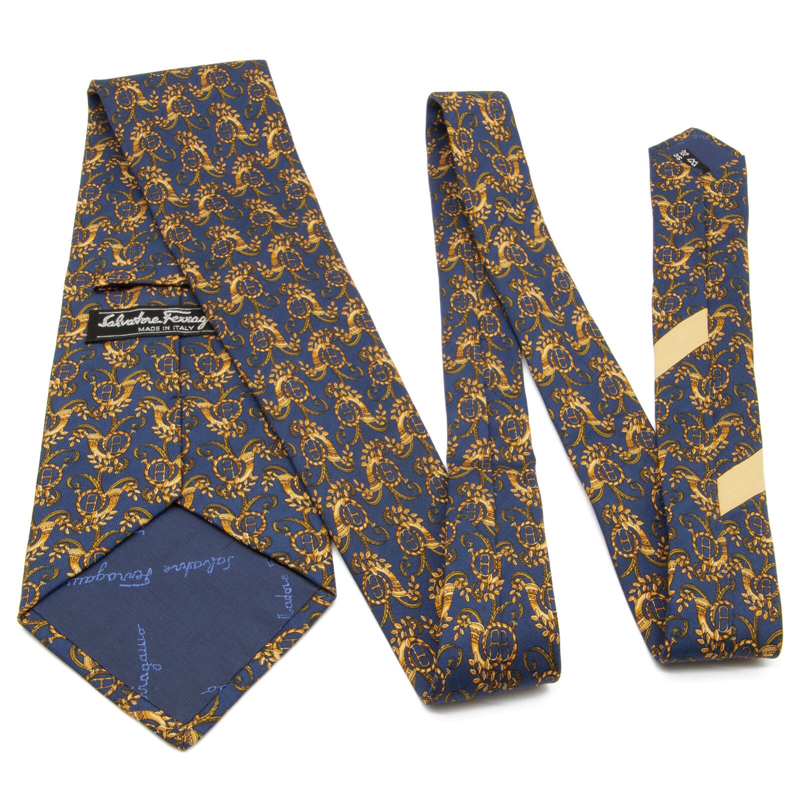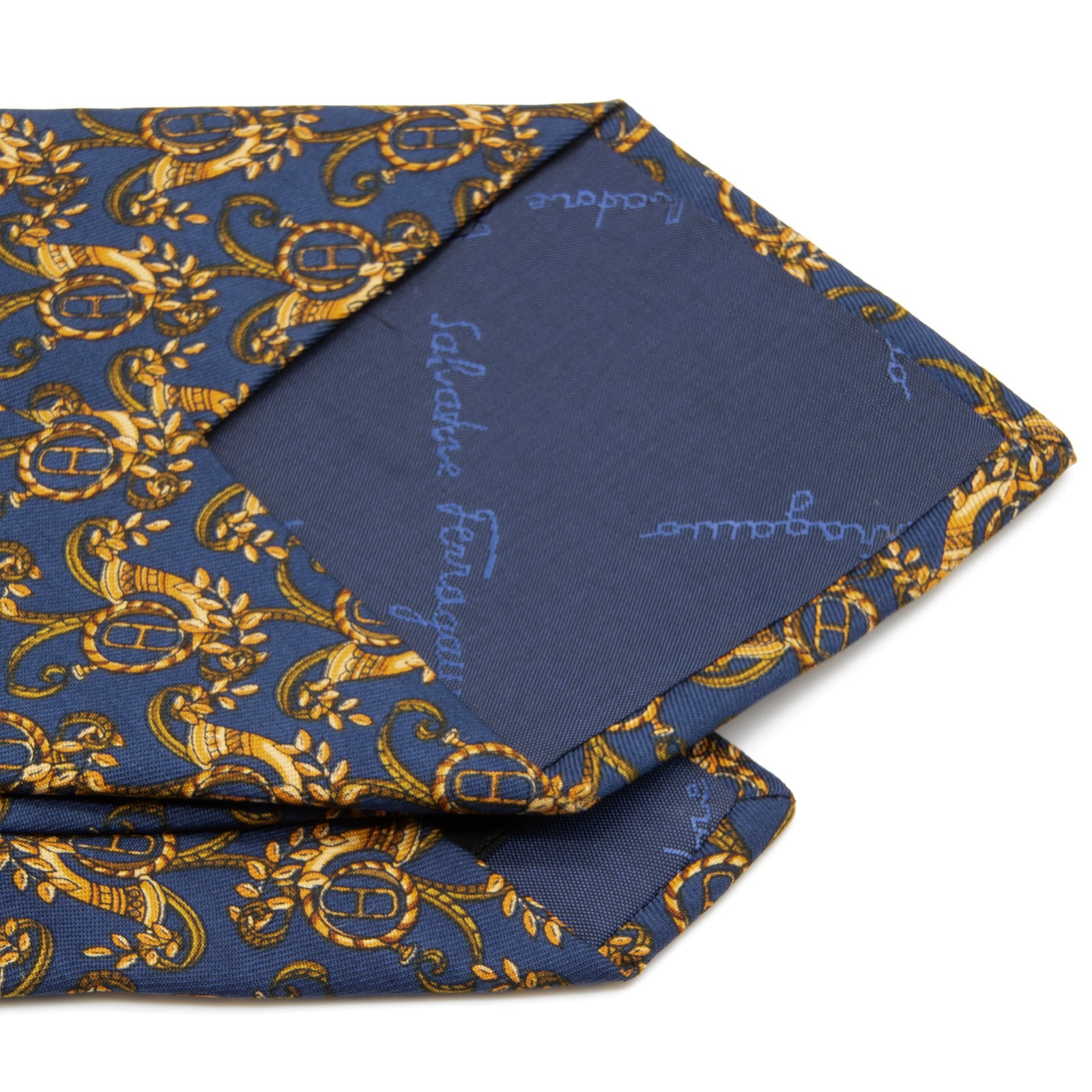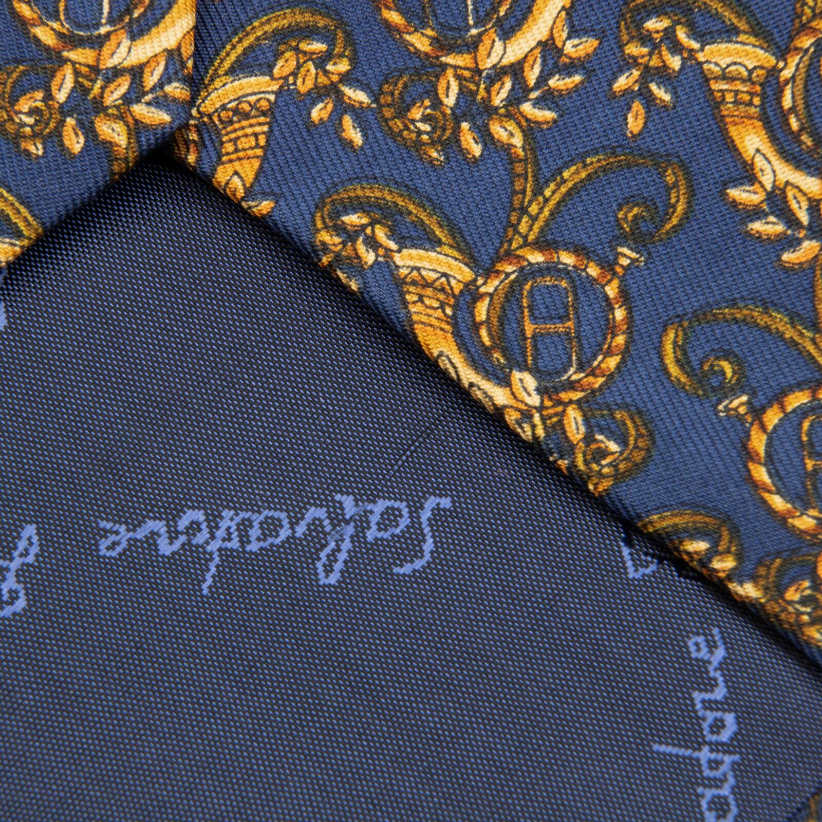 送料無料 フェラガモ ネクタイ ワイドタイ シルク ネイビーブルー ブロンズ ブランド ホルン 楽器 葉っぱ 珍しい おしゃれ イタリア製 N509