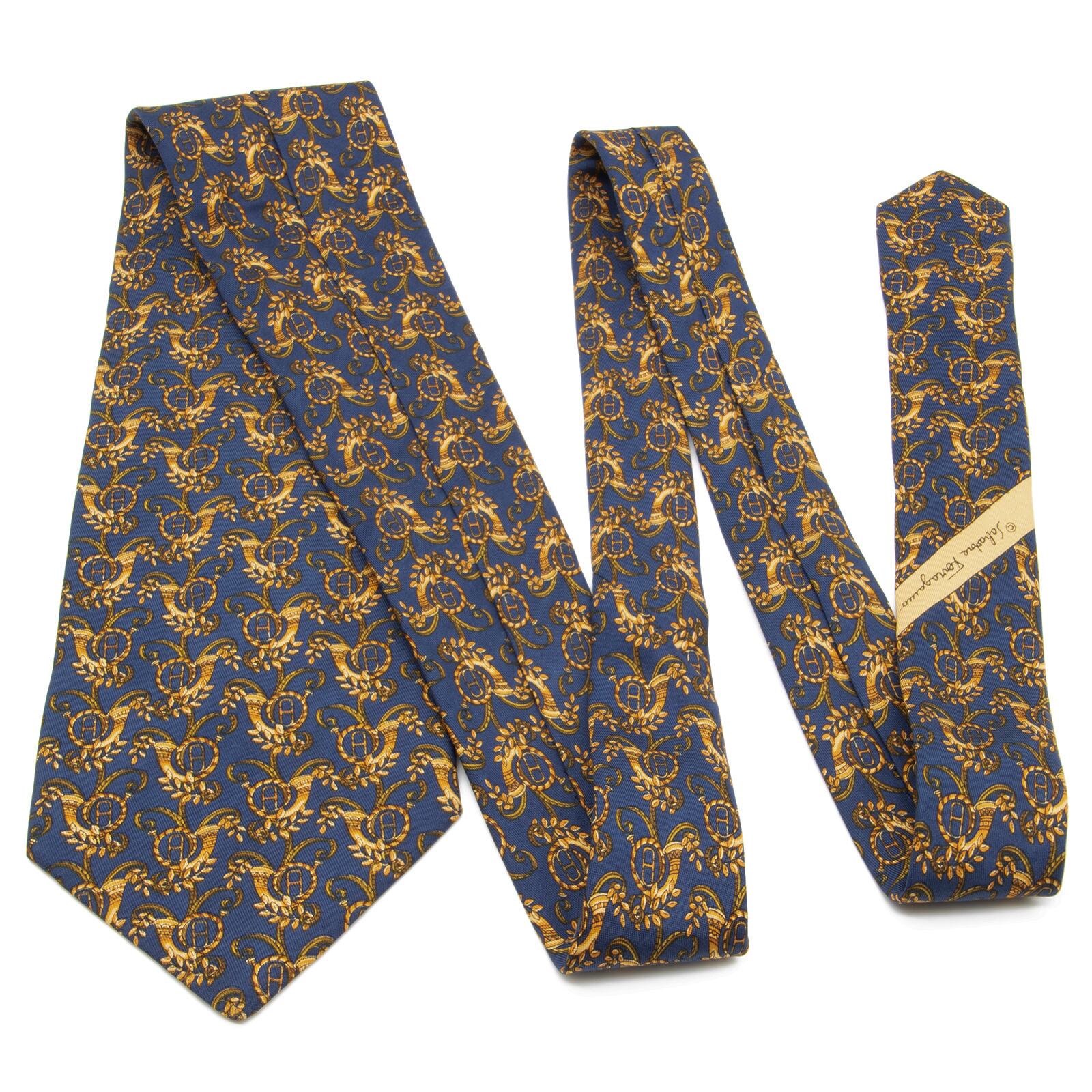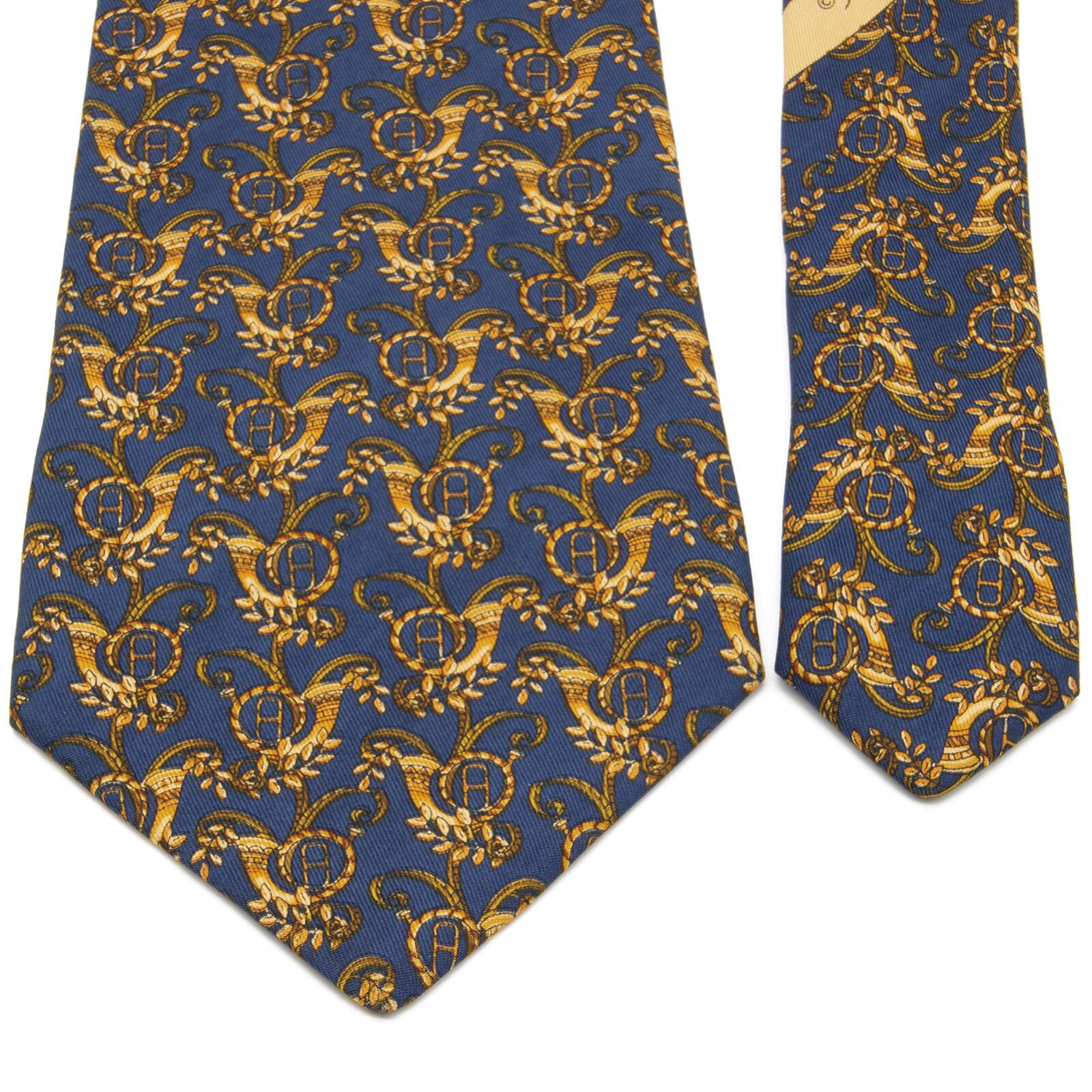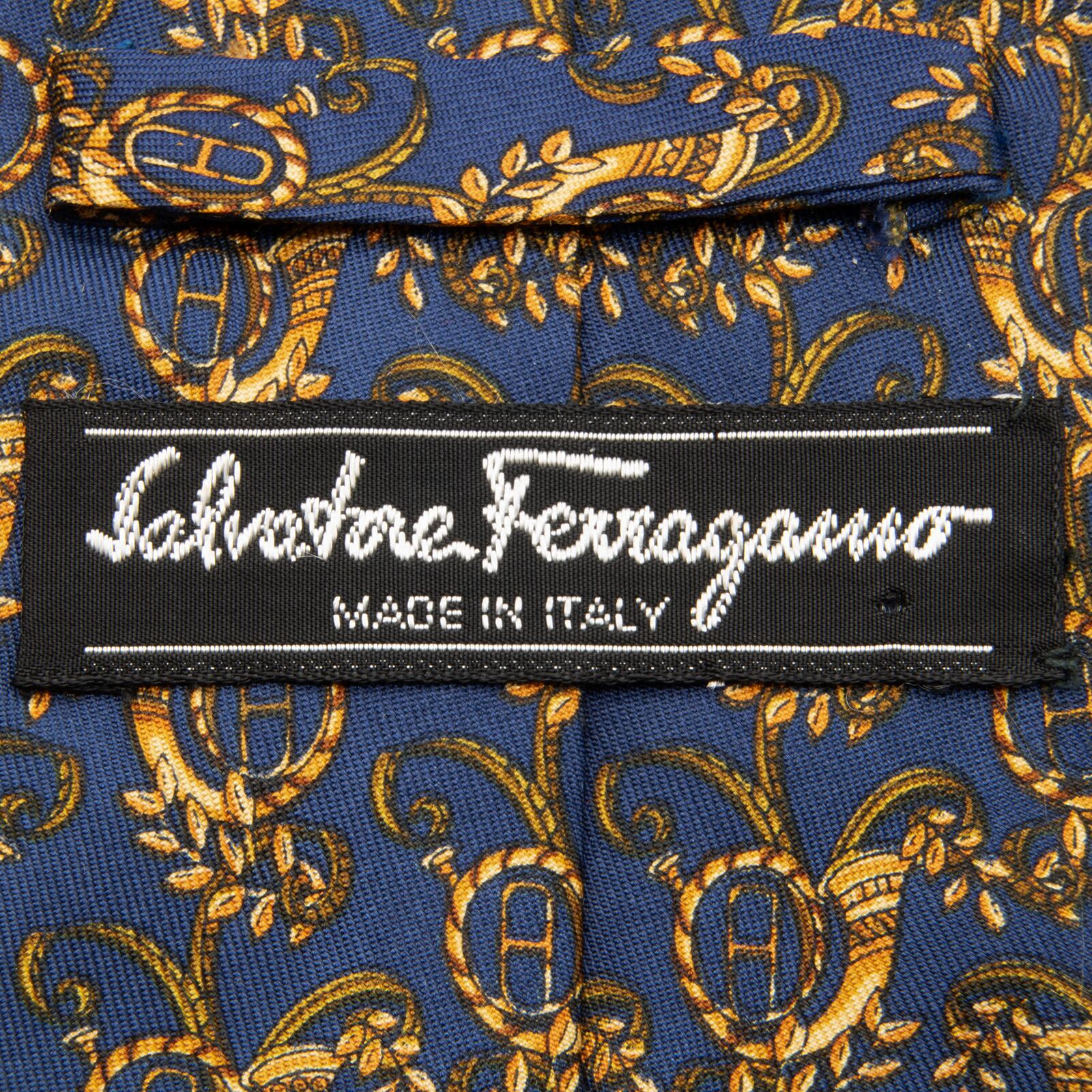 送料無料 フェラガモ ネクタイ ワイドタイ シルク ネイビーブルー ブロンズ ブランド ホルン 楽器 葉っぱ 珍しい おしゃれ イタリア製 N509