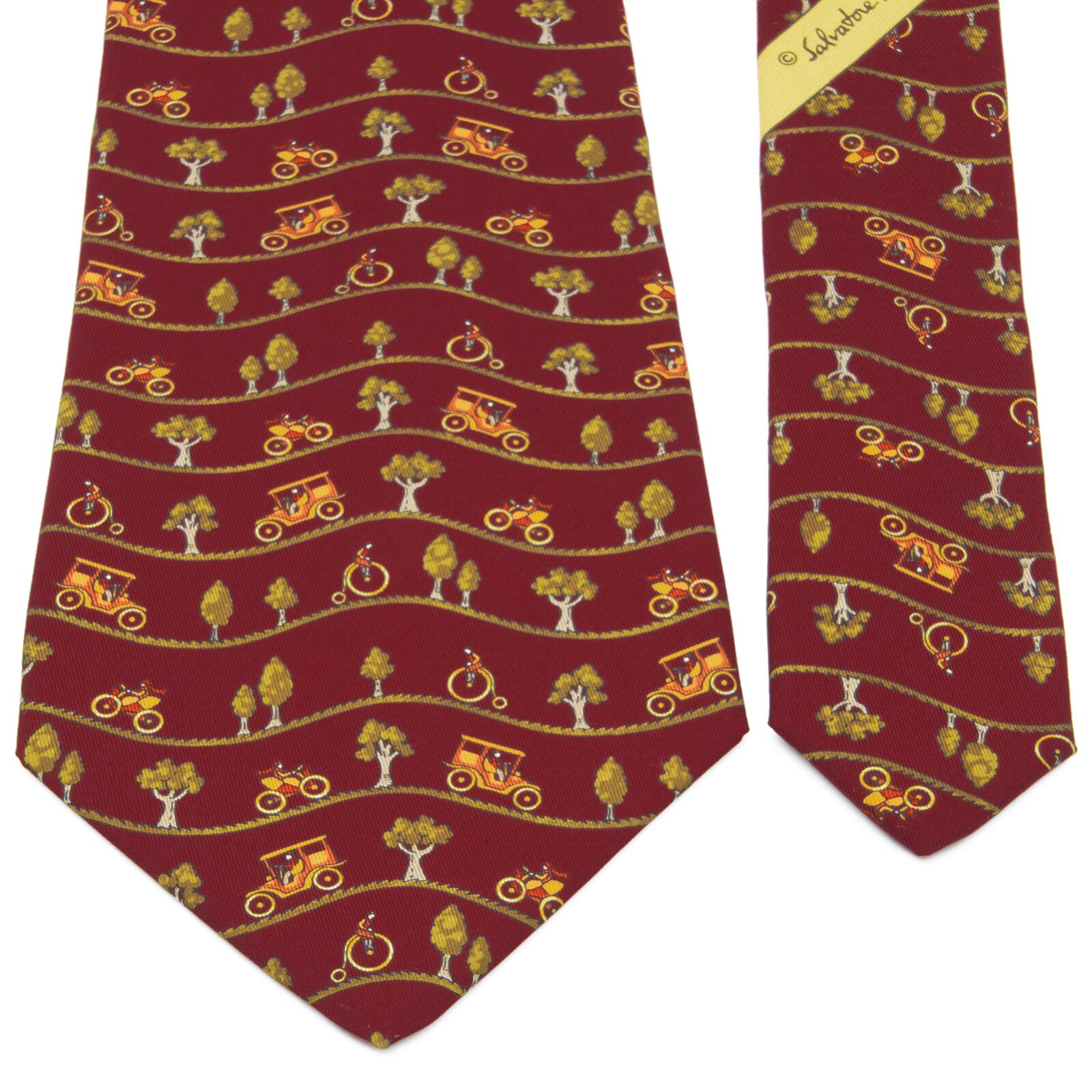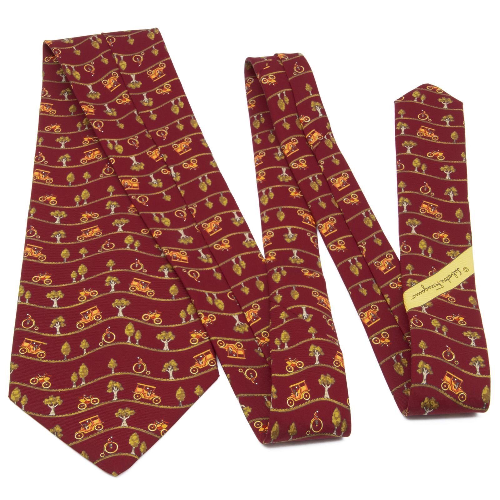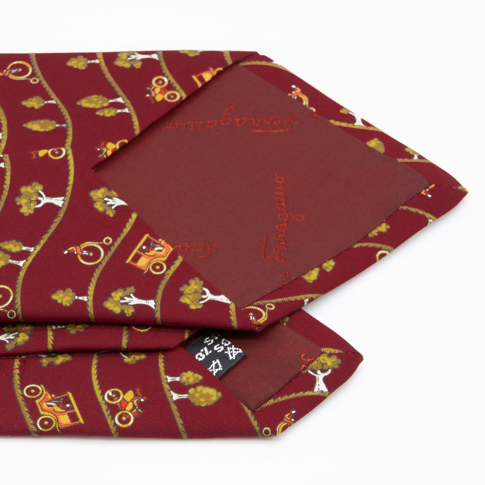 送料無料 フェラガモ ネクタイ 新品同様 ワイドタイ シルク バーガンディー 緑色 オレンジ 自転車 木 自然 珍しい おしゃれ 綺麗 N584