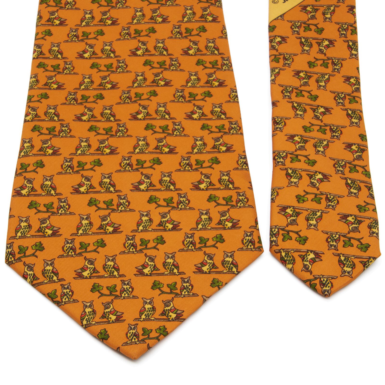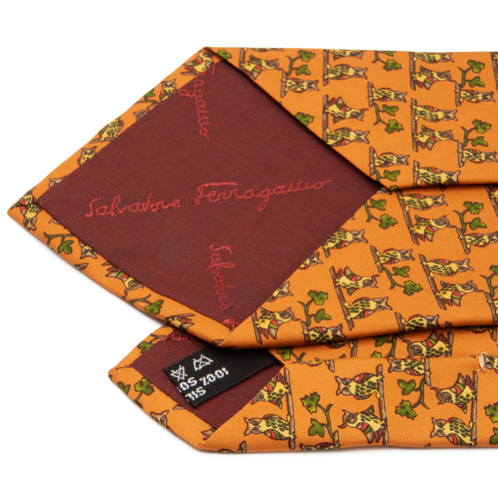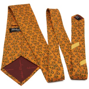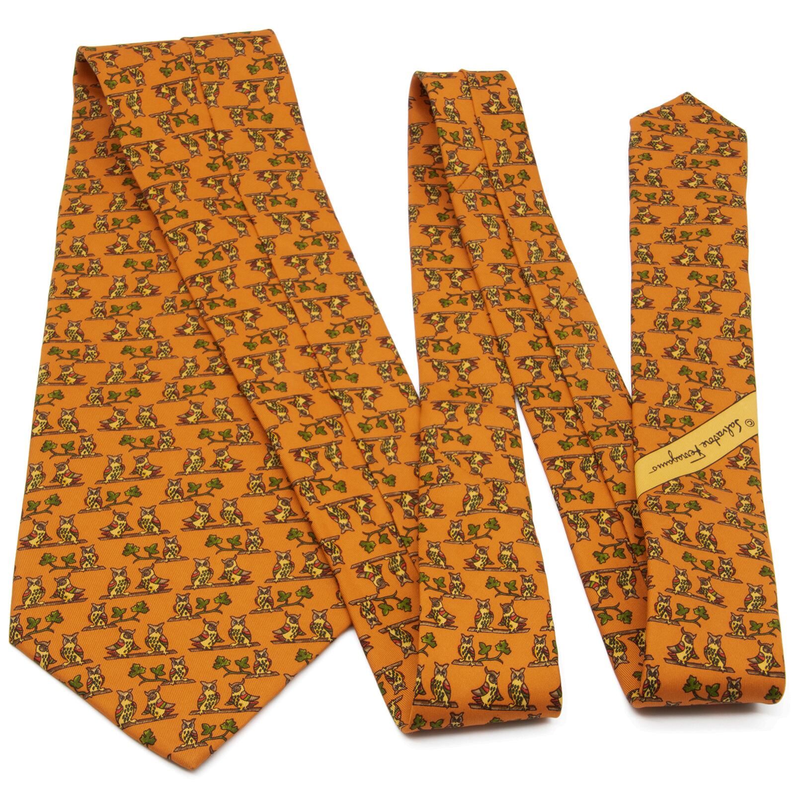 送料無料 フェラガモ ネクタイ ワイドタイ シルク オレンジ 茶色 ブラウン 緑色 フクロウ 動物 ロゴ 珍しい おしゃれ イタリア製 綺麗 N618