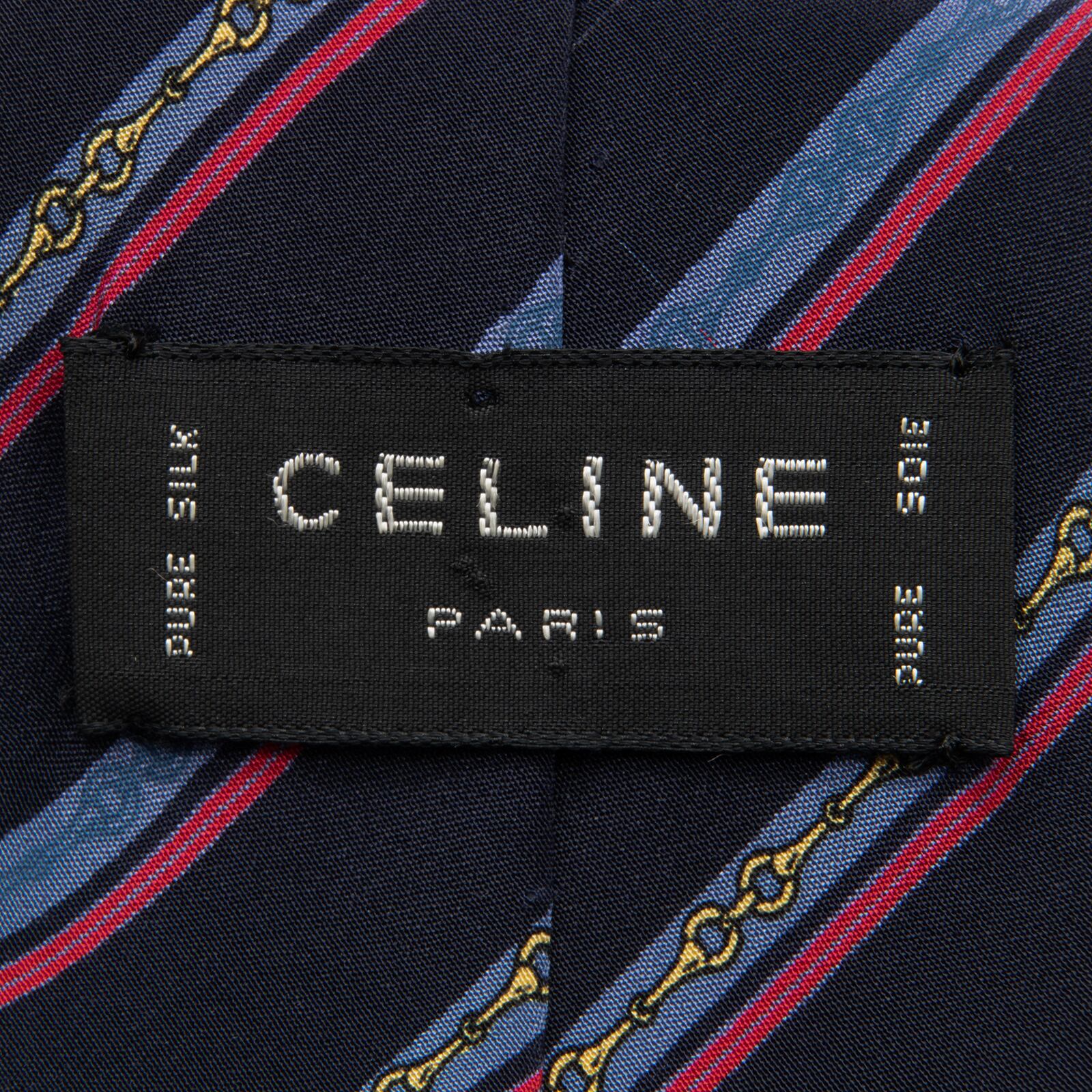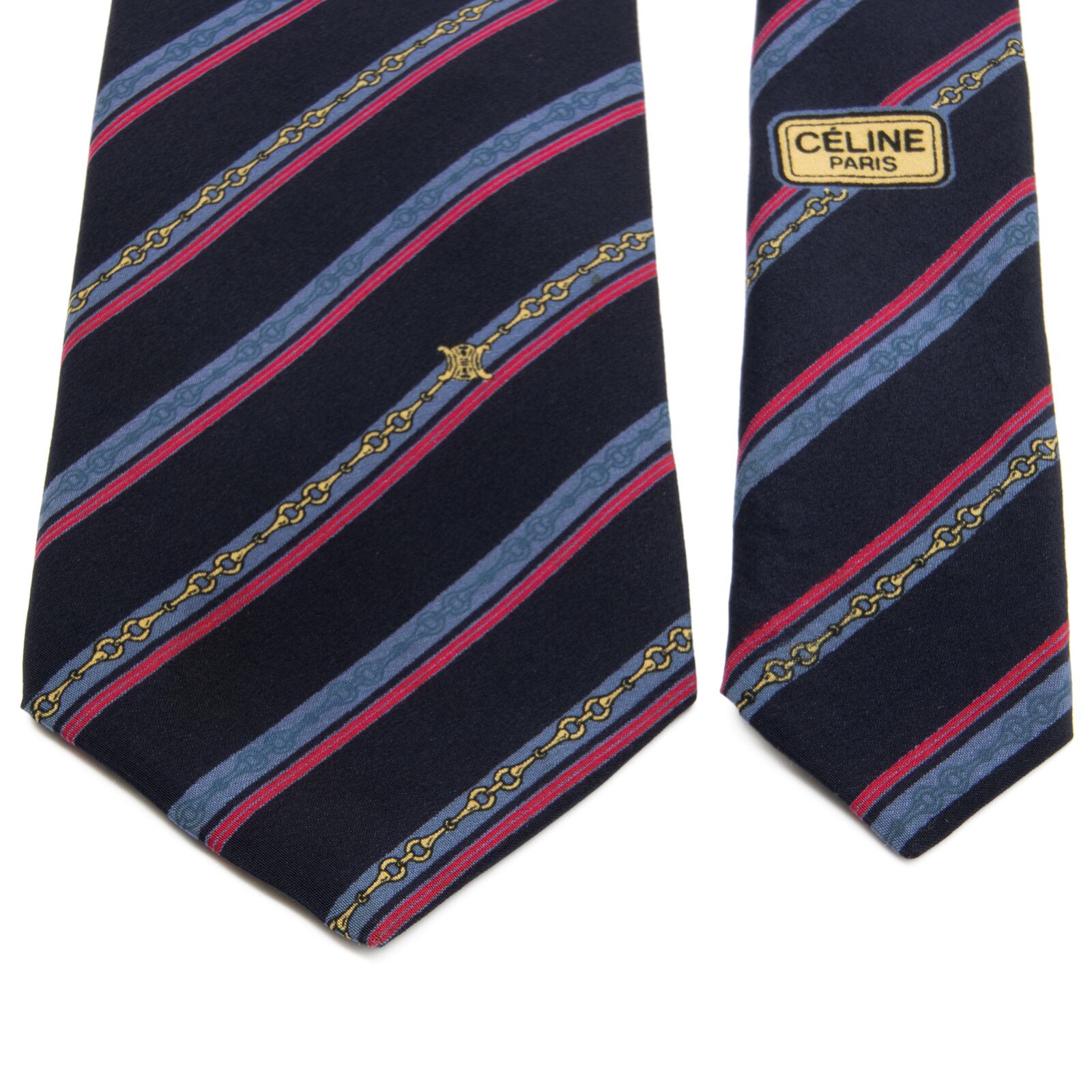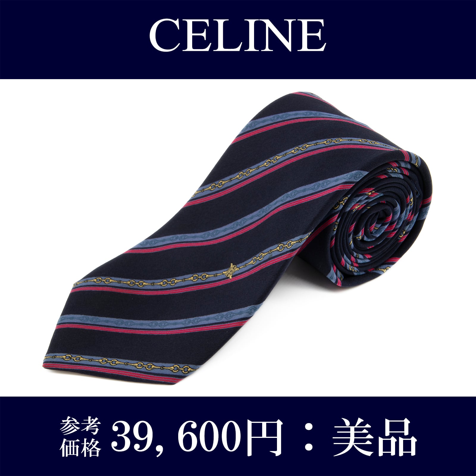 送料無料 セリーヌ ネクタイ シルク ネイビーブルー 青 赤 ビジネス ブランド マカダム ストライプ ホースビット ロゴ マーク 綺麗 N068