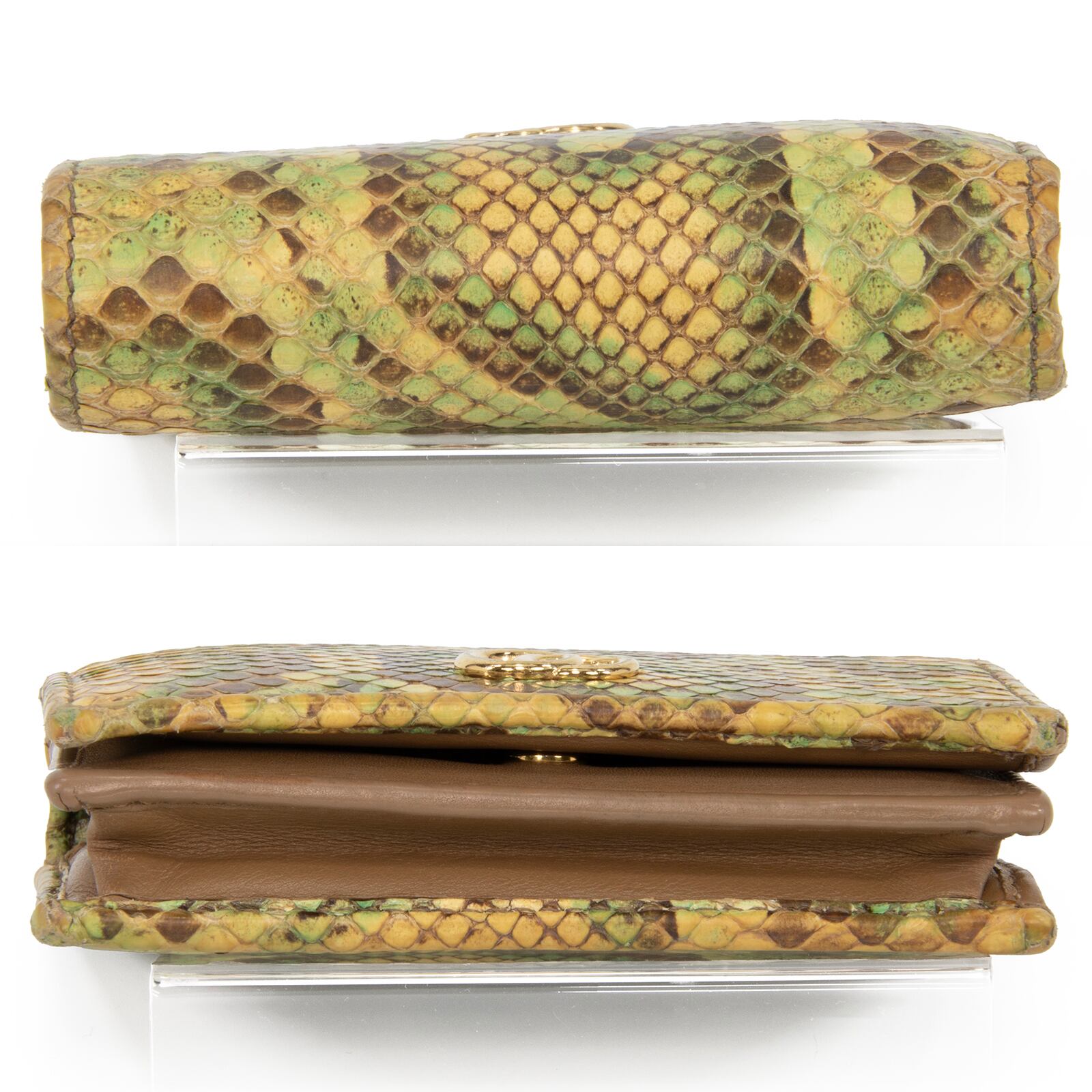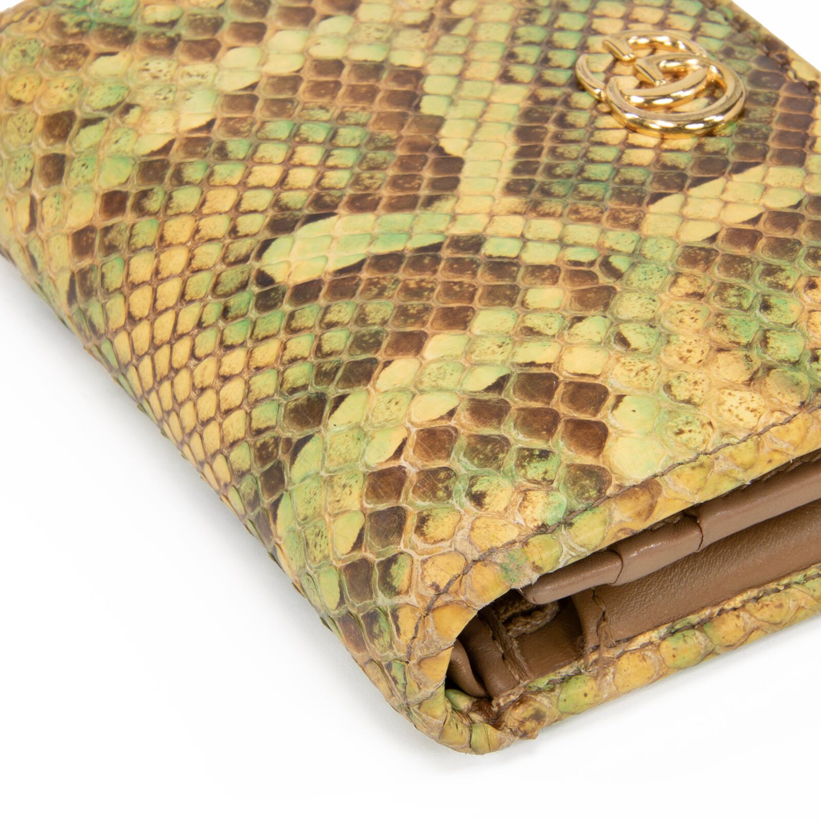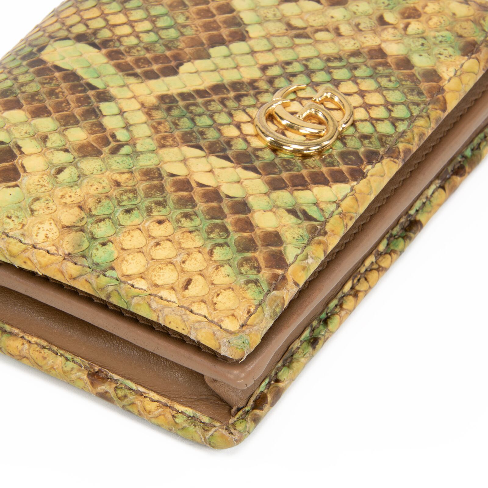本物 送料無料 グッチ 短財布 二つ折り財布 レディース パイソン GGマーモント 黄色 緑 茶色 珍しい 蛇の本革 レザー GGロゴ マーク C207